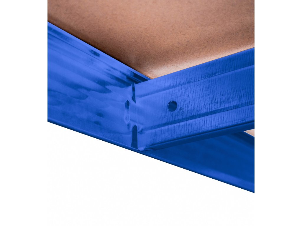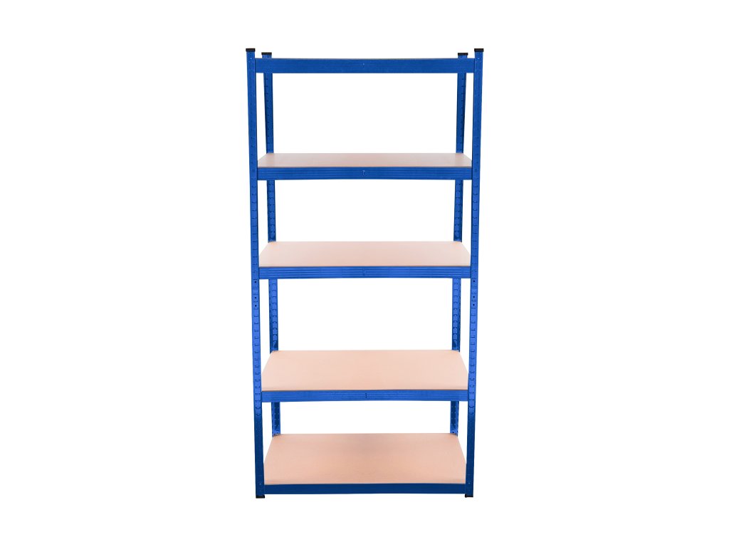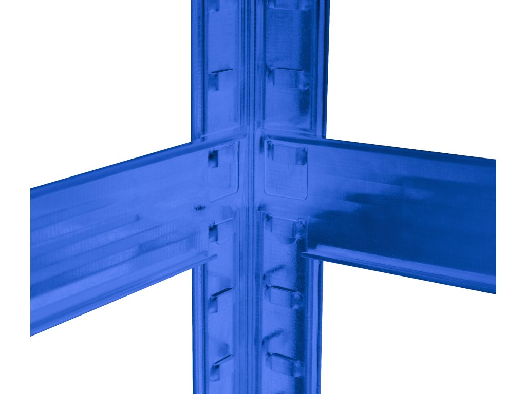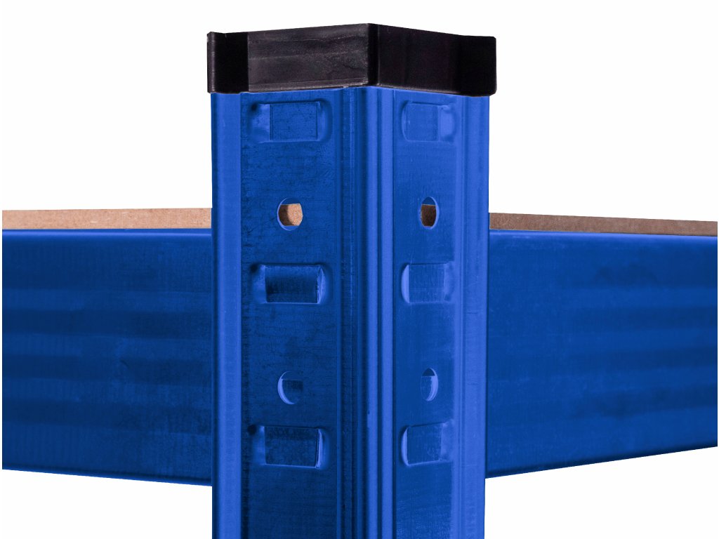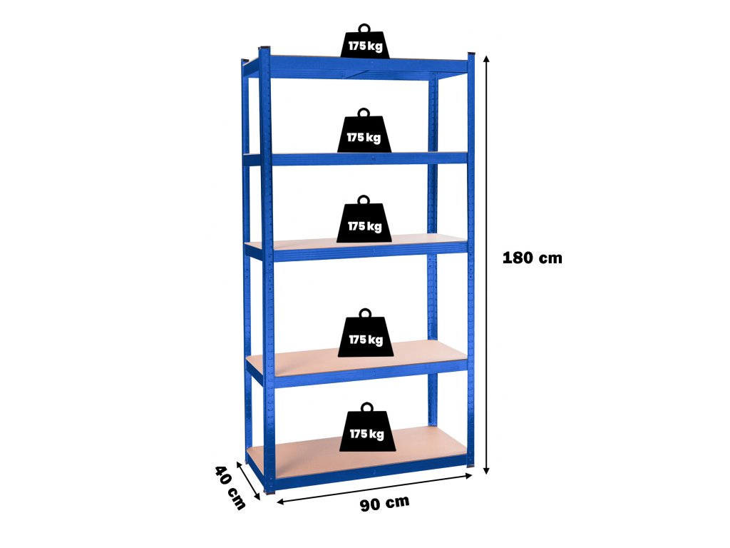Na výšce cca 180 cm máte k dispozici 5 polic z mdf, které lze výškově vložit dle potřeby. Rám z galvanizované oceli v modré barvě zaručuje stabilitu a velkou nosnost cca 875 kg (na každou polici připadá cca 175 kg).