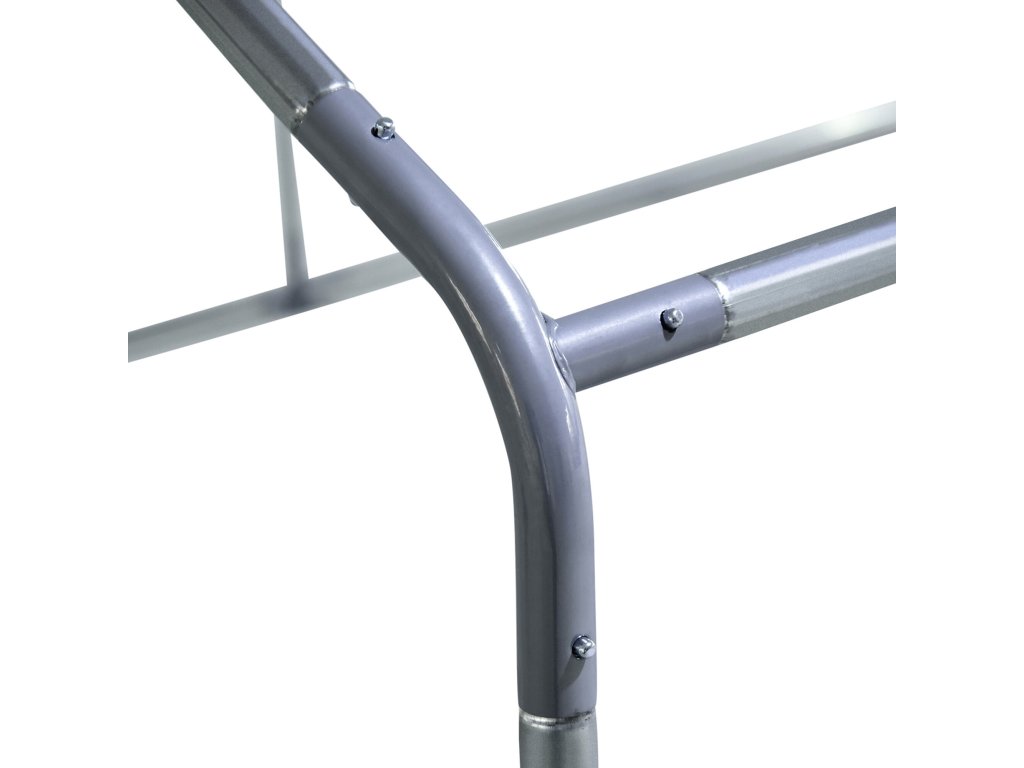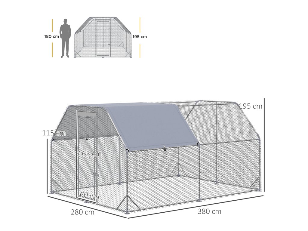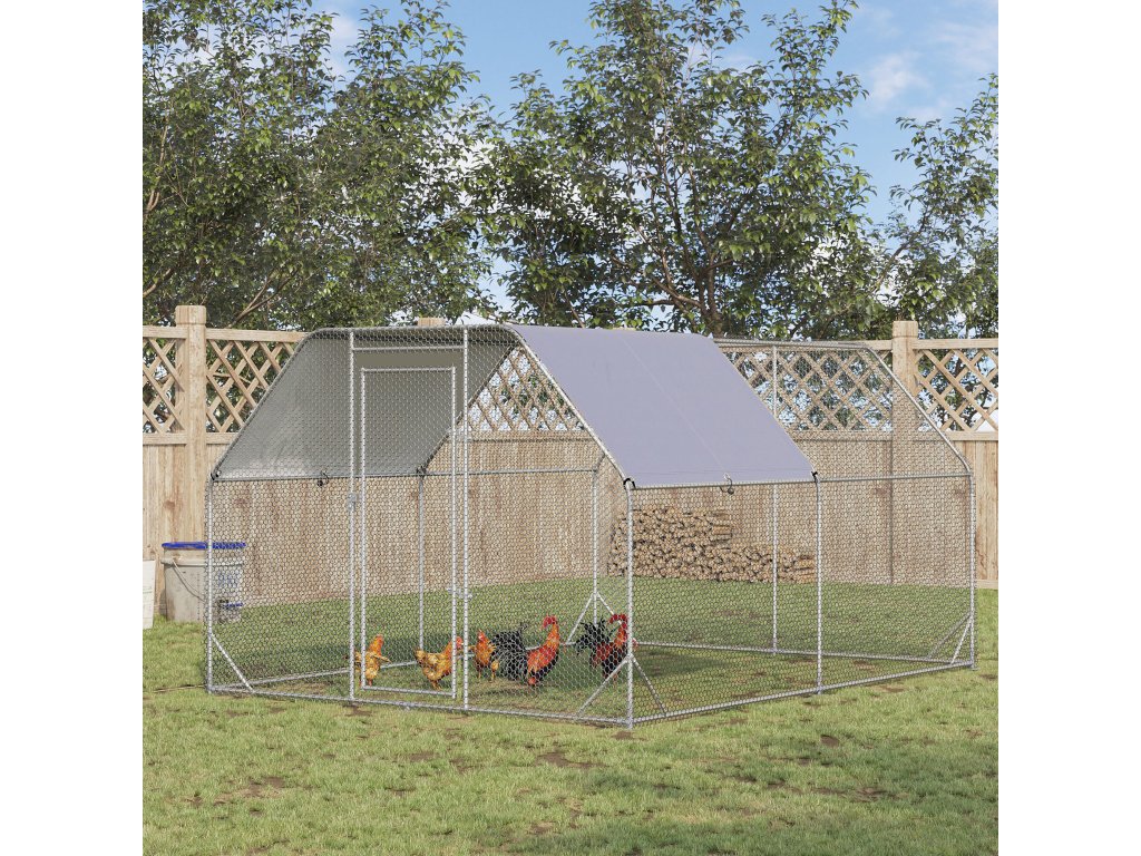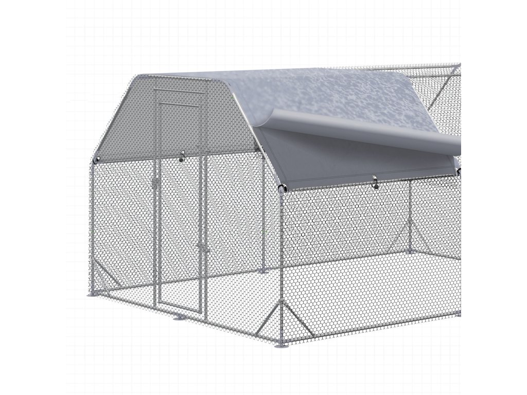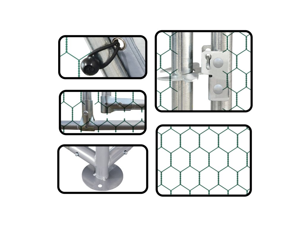 Klec vyrobena z pevné stříbrné pozinkované oceli, která dodá výběhu patřičnou stabilitu a zabrání nechtěným úrazům, v podobě útěků vaší drůbeže. Konstrukce je doplněna o pozinkované pletivo v zelené barvě a střechu, kterou tvoří šedá PVC plachta.