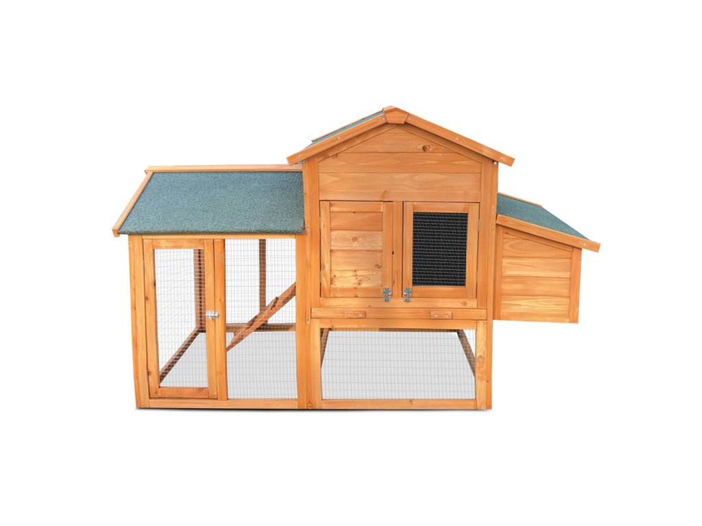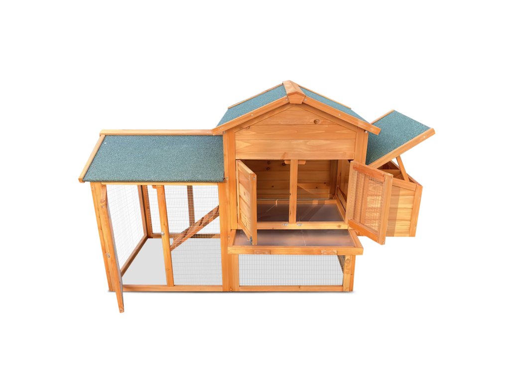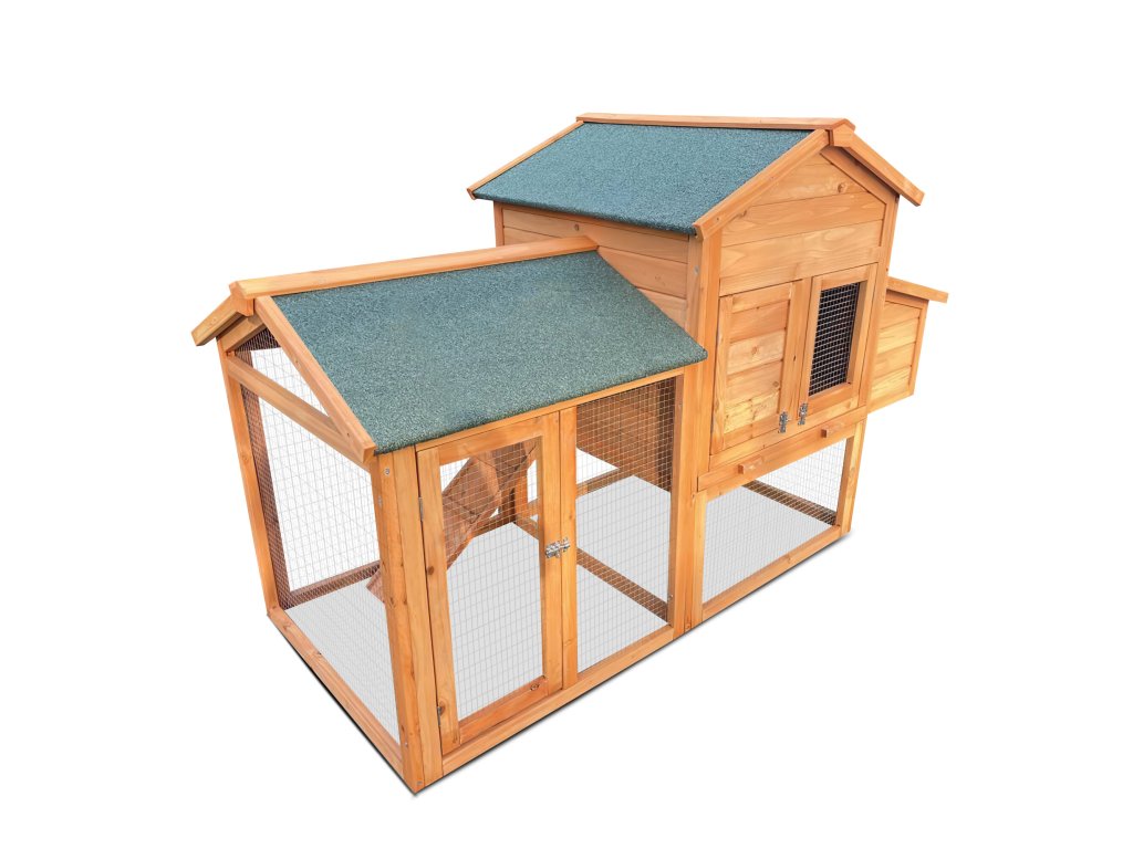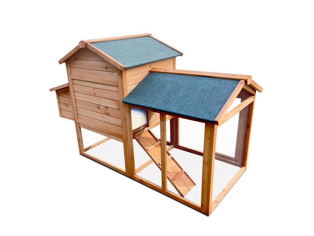 Výběh připojený k obytné části umožňuje slepicím volný pohyb. Střecha je osazena kvalitní šindelovou krytinou, která chrání slepice před deštěm a sněhem. Ze spodního do horního patra vede rampa, po níž mohou zvířata snadno vylézt nahoru. Dvířka lze jednoduše zavřít a zajistit zasouvacími západkami.