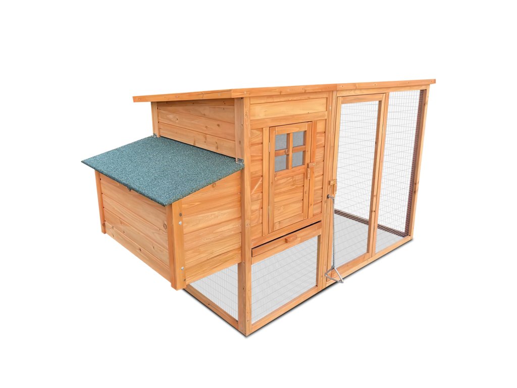 Výběh připojený k obytné části umožňuje slepicím volný pohyb. Střecha je osazena kvalitní šindelovou krytinou, která chrání slepice před deštěm a sněhem. Ze spodního do horního patra vede rampa, po níž mohou zvířata snadno vylézt nahoru. Dvířka lze jednoduše zavřít a zajistit zasouvacími západkami.