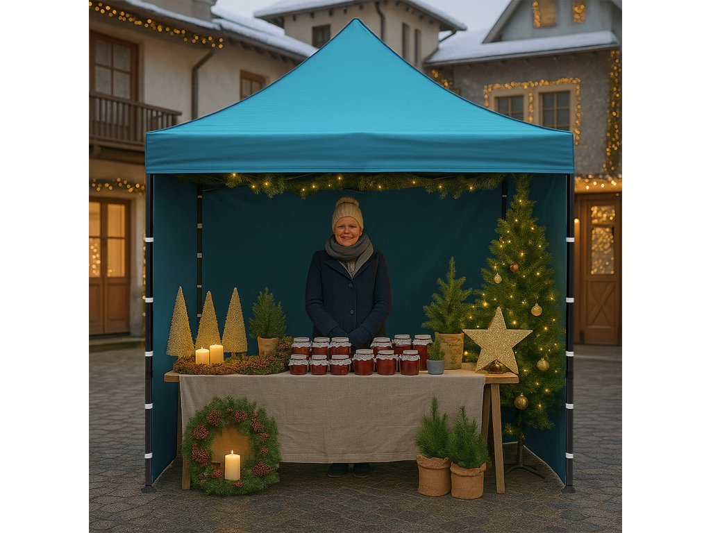 Prodejní stánek 2×2 m s pevnou nůžkovou konstrukcí je určen pro farmářské trhy, reklamní akce, výstavy i sezónní prodej.