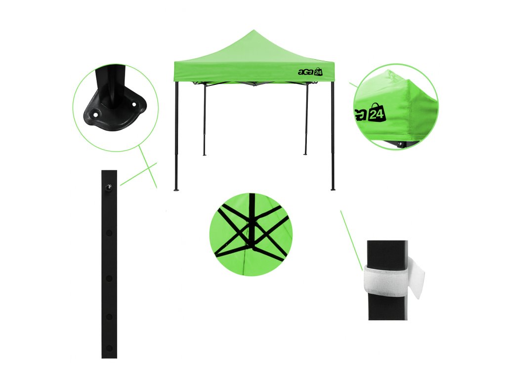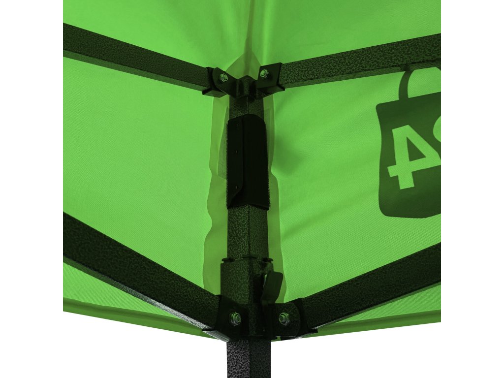Konstrukci tvoří ocelový rám s nůžkovým mechanismem, který je povrchově chráněn práškovým lakem proti korozi. Oproti běžným skládacím stanům má tento model šroubované spoje, což zvyšuje pevnost, prodlužuje životnost a usnadňuje případný servis nebo výměnu dílů. Díky třem stupňům regulace lze výšku nastavit od 213 cm až do 290 cm, takže stánek snadno přizpůsobíte konkrétním podmínkám.