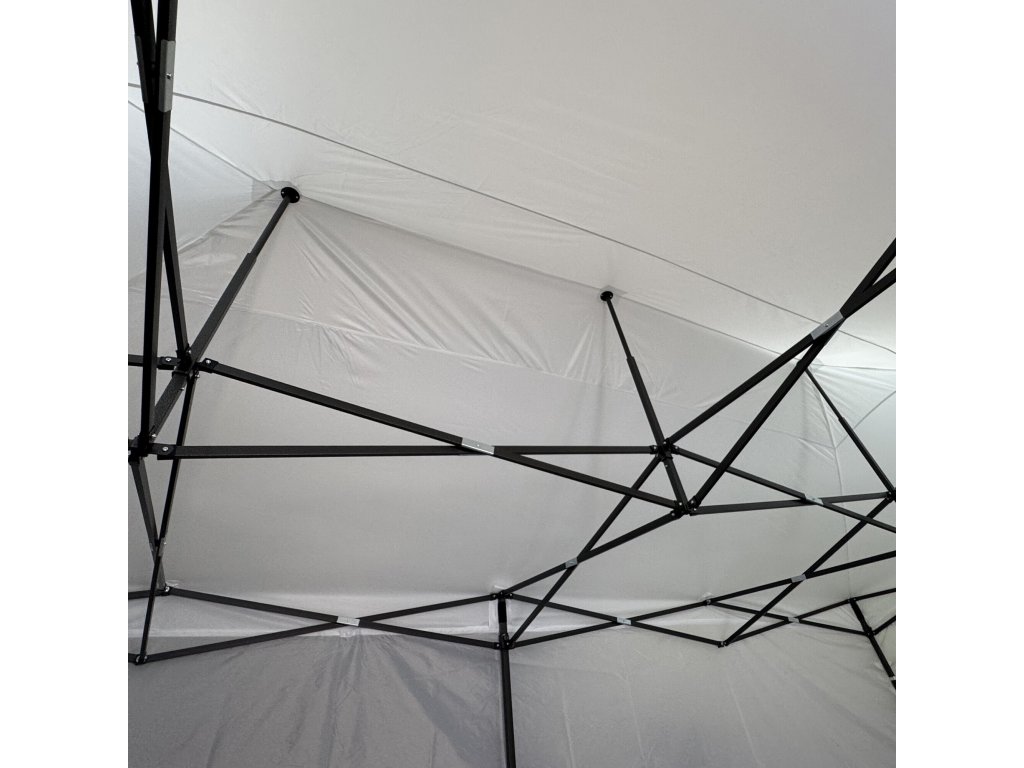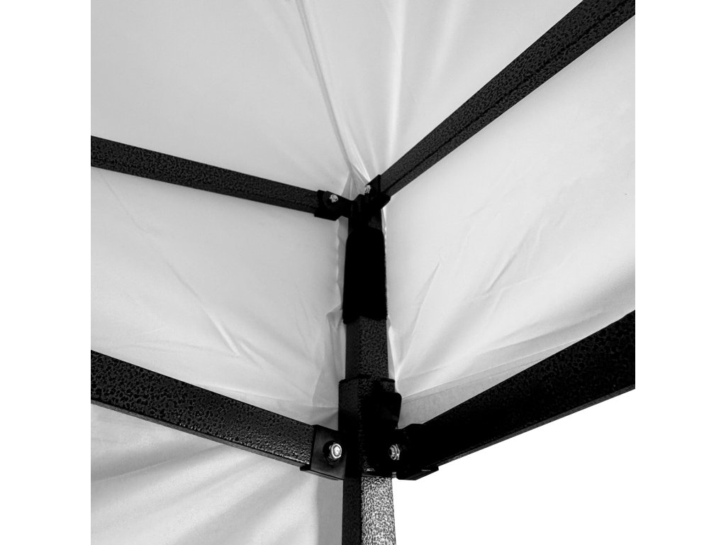 U tohoto modelu je navíc uprostřed konstrukce umístěna dodatečná středová noha, která poskytuje extra oporu celé ploše. Díky tomu je rám stabilní i při větší zátěži a zároveň se zamezuje prohýbání střechy na takto velké ploše. Každá noha je zakončena patkou s možností ukotvení do země, což výrazně zvyšuje celkovou stabilitu stánku i v náročnějších podmínkách.