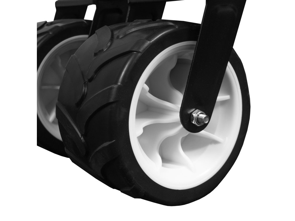 Díky velkému nákladovému prostoru vejde do vozíku vše potřebné a převezete jej na extrémně odolných plastových kolech, která dobře poslouží i při jízdě v terénu.