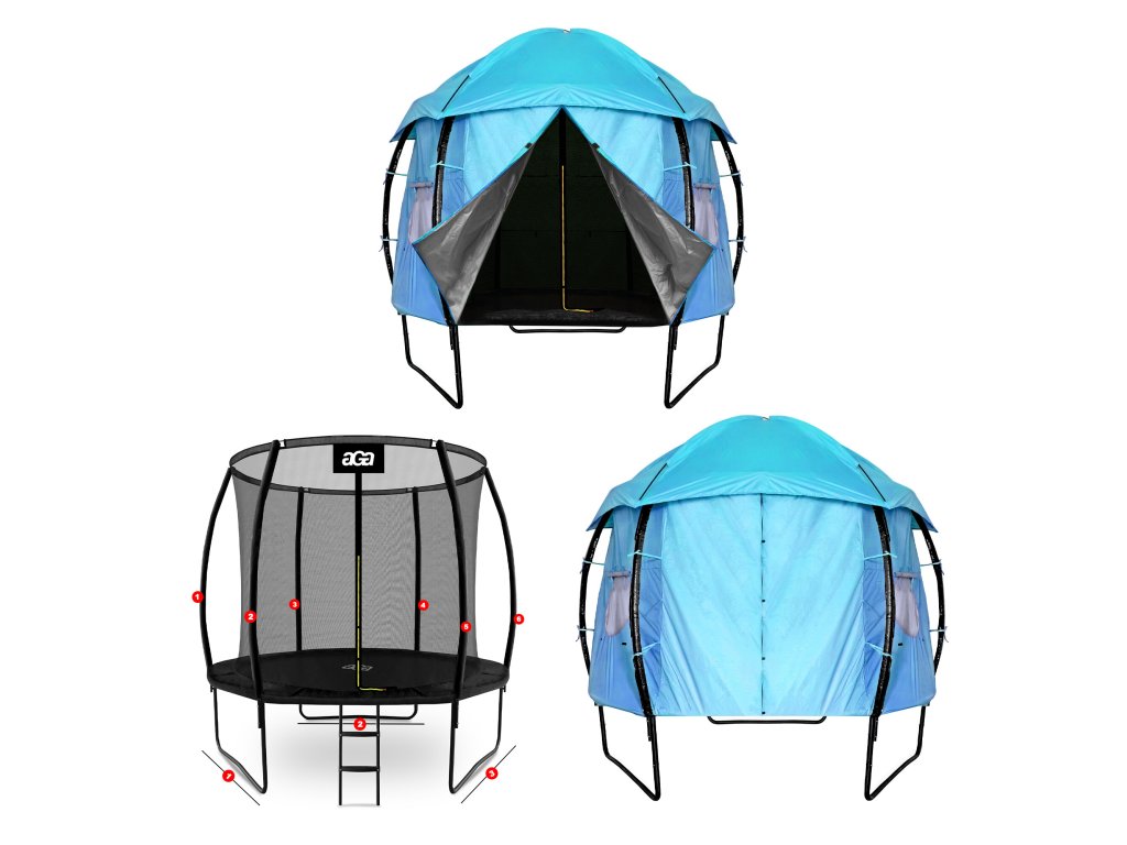 A v době kdy trampolína není aktivně využívána, pomáhá stan chránit odrazovou plochu před znečištěním a UV zářením.