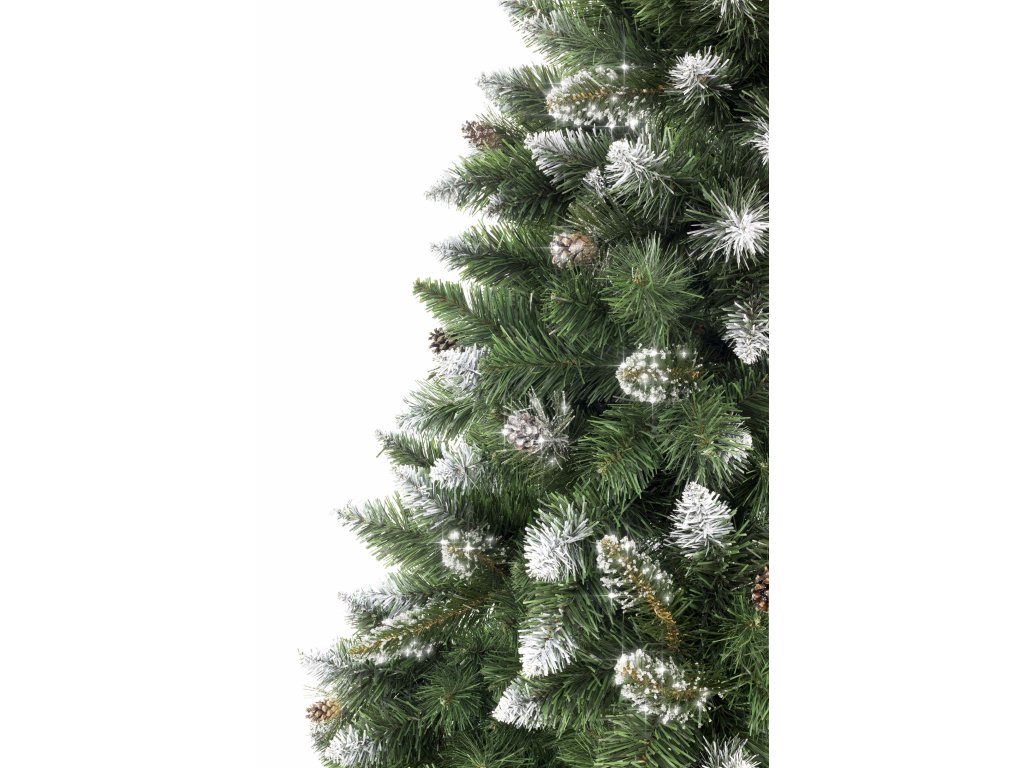 Luxusní umělý vánoční stromeček s celkovou výškou 150 cm v přírodním vzhledu krásné zelené husté borovice, která je ozdobena stříbrnými třpytkami.