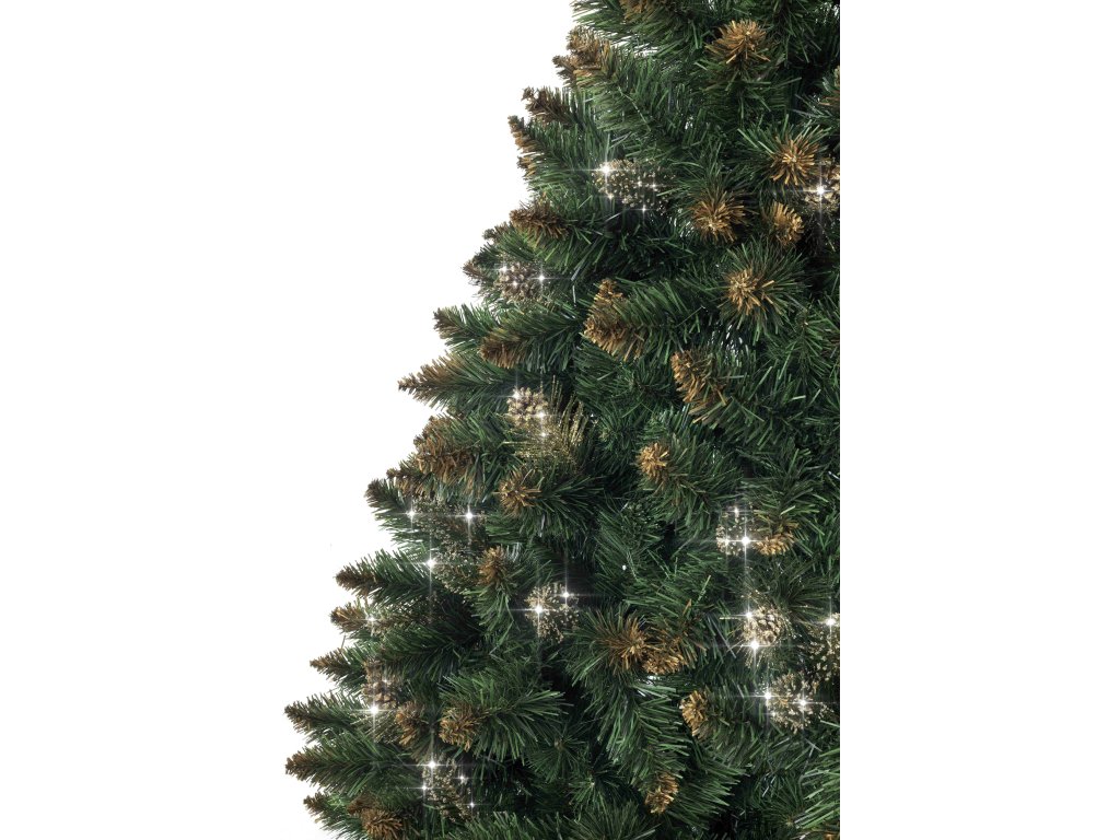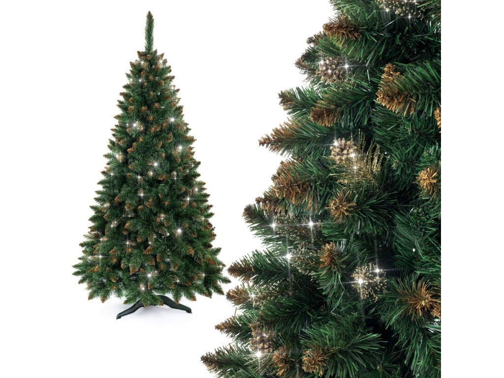 Luxusní umělý vánoční stromeček s celkovou výškou 150 cm v přírodním vzhledu krásné zelené husté borovice, která je ozdobena zlatými třpytkami.