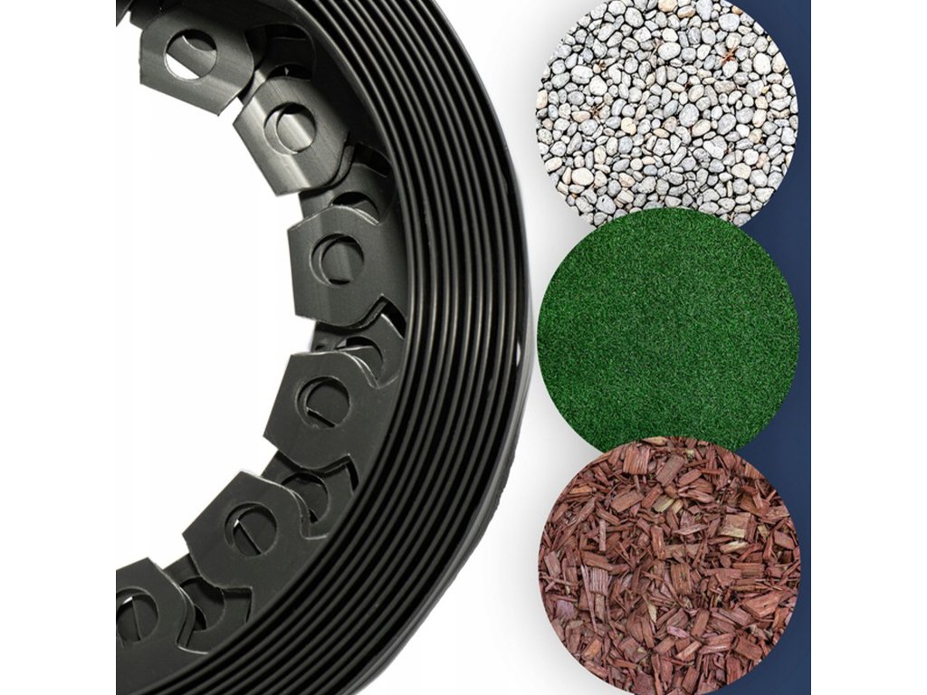 Plastový zahradní obrubník 10 m představuje spolehlivé řešení pro oddělení trávníků, květinových záhonů, chodníků a dalších částí zahrady. Obrubník na trávník je vyroben z pružného plastu, který umožňuje vytvářet přímé linie i oblouky, takže se bez problémů přizpůsobí jakémukoli terénu.