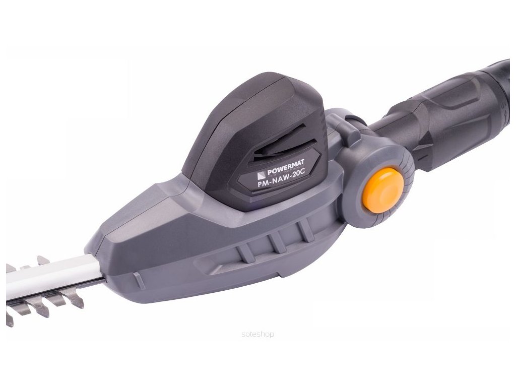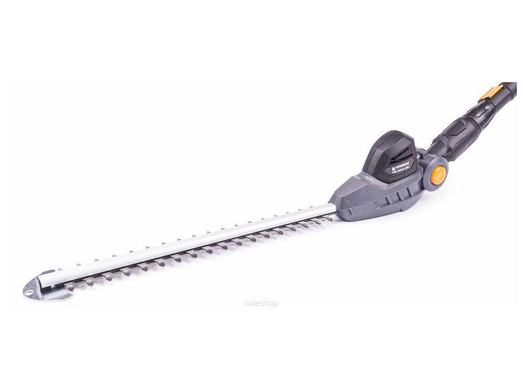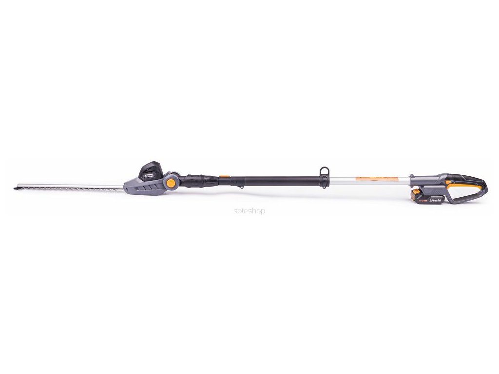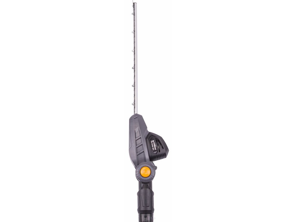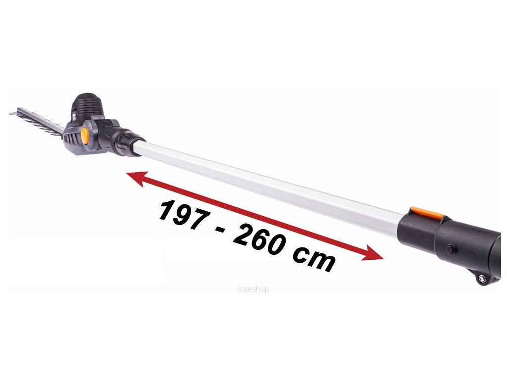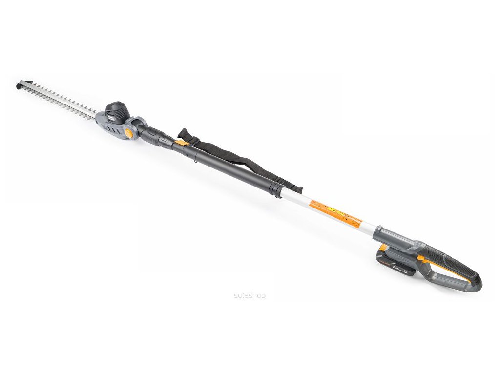 Akumulátorové nůžky na tyči s nastavením sklonu 11 stupňů s čepelí z vysoce kvalitní oceli s vysokým obsahem uhlíku. Možnost rychlého a snadného nastavení délky ramene od 197 cm do 260 cm a možnost nastavení úhlu nůžek v jedenácti stupních velmi usnadňuje zastřihování keřů. Elektromotor s akumulátorem 20V - 2Ah umožňuje stříhání větví až do 16 mm. Nůžky jsou vyrobeny z vysoce kvalitních materiálů, což zajišťuje dobrou stabilitu a následně i menší únavu při práci. Výhodou tohoto modelu nůžek je nedostatek zbytečných hřídelí. Motor je umístěn přímo u řezacích nůžek.