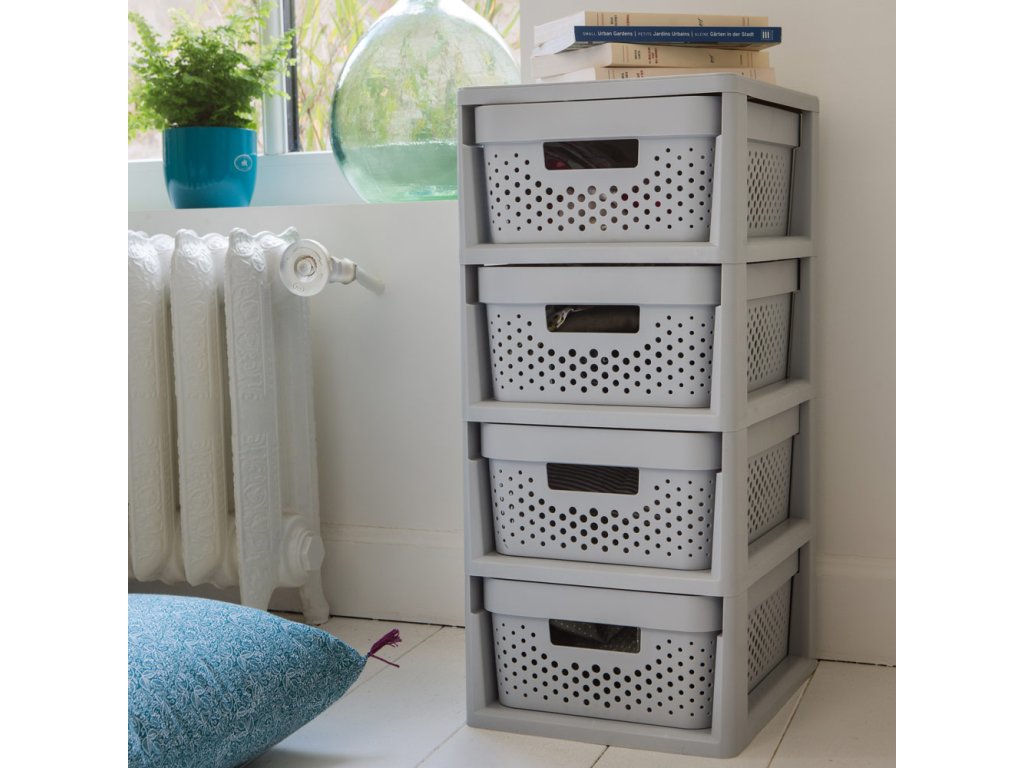 Regál v šedé barvě se 4 šuplíky je skvělým pomocníkem na přechovávání věcí v koupelně, ložnici či v šatně. Regál se skládá ze 4 šuplíků a šedého rámu na kolečkách. Kolečka můžete odejmout. Regál je vyroben z vysoce kvalitního plastu. Konstrukce je lehká, regál můžete snadno přemístit. Hladký povrch vevnitř neponičí uložené předměty. Udržení v čistotě je také jednoduché, stačí pouze přetřít regál vlhkým hadříkem. Z kolekce Infinity jsou dostupné také prádelní koše, koše/boxy s víkem a organizéry do šuplíku. Objem 1 šuplíku: 10 l