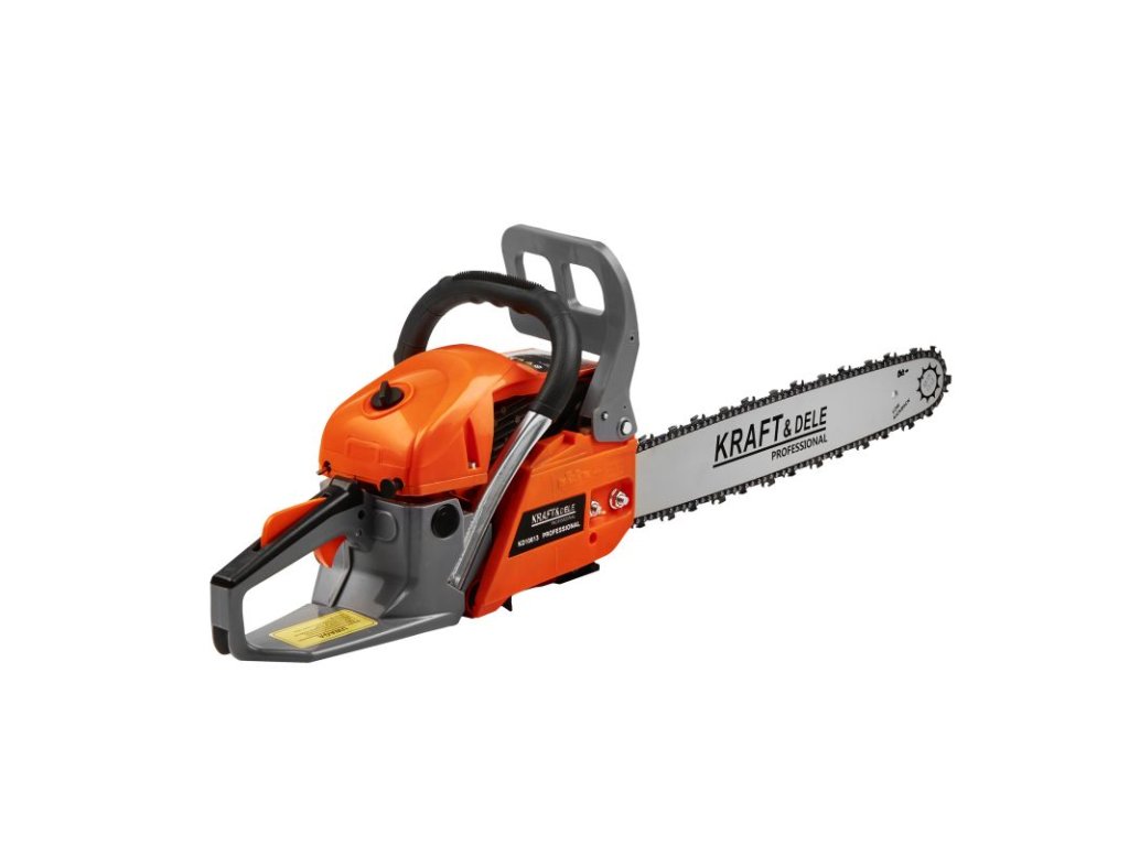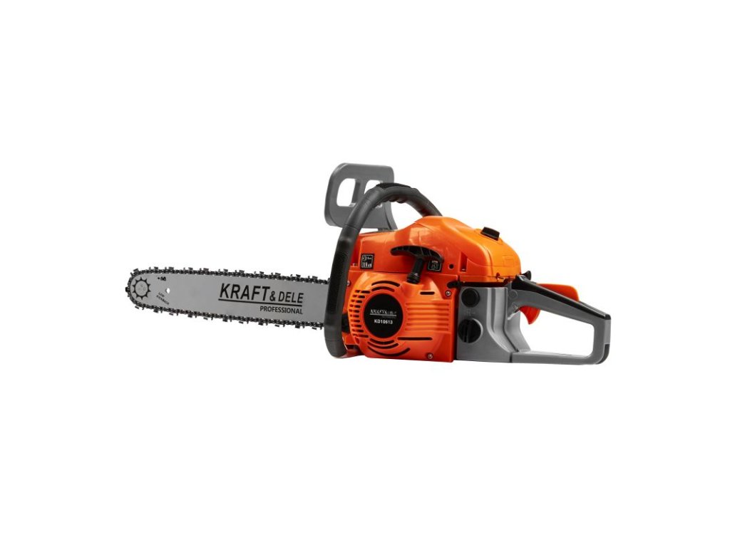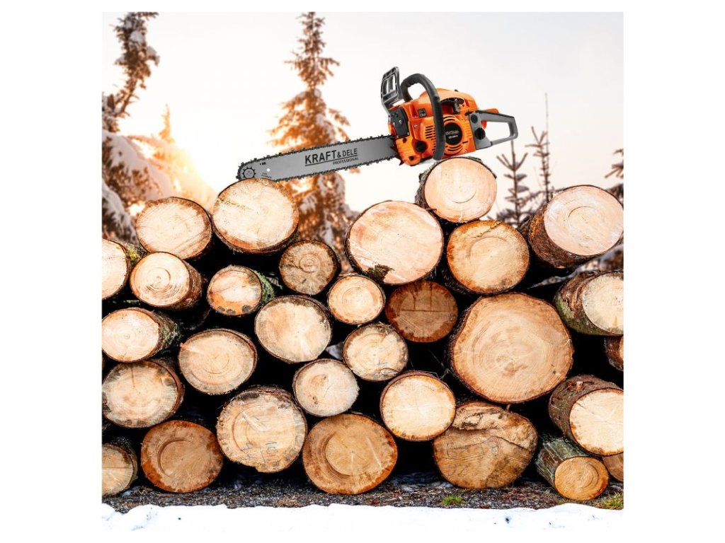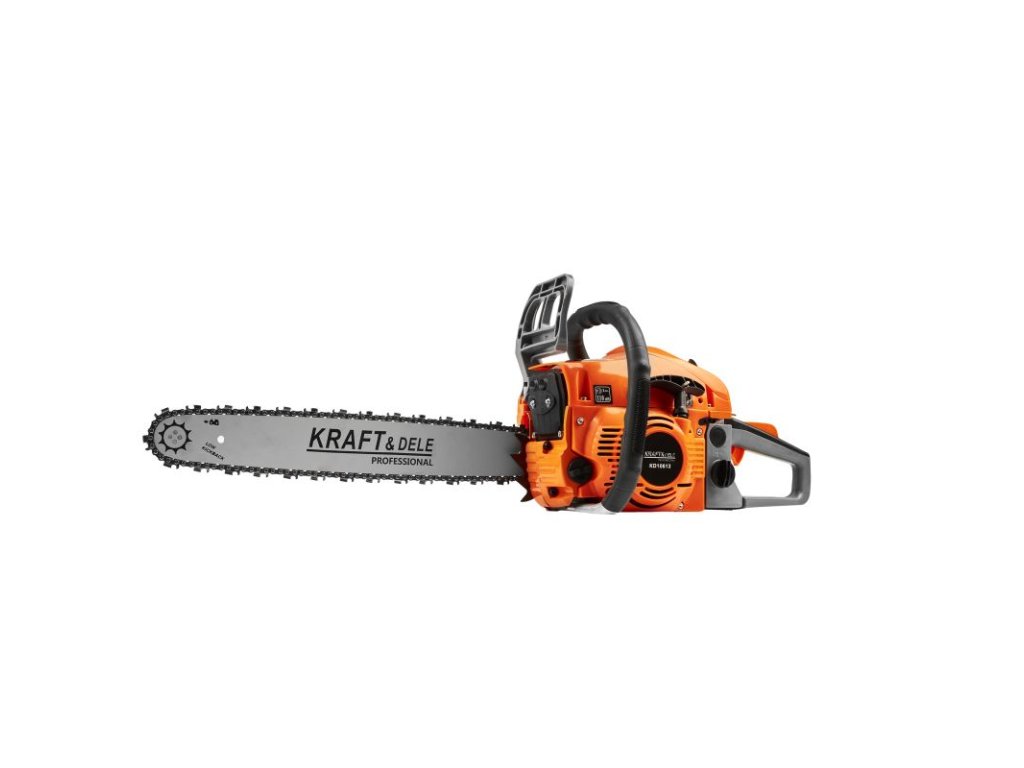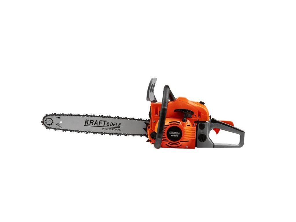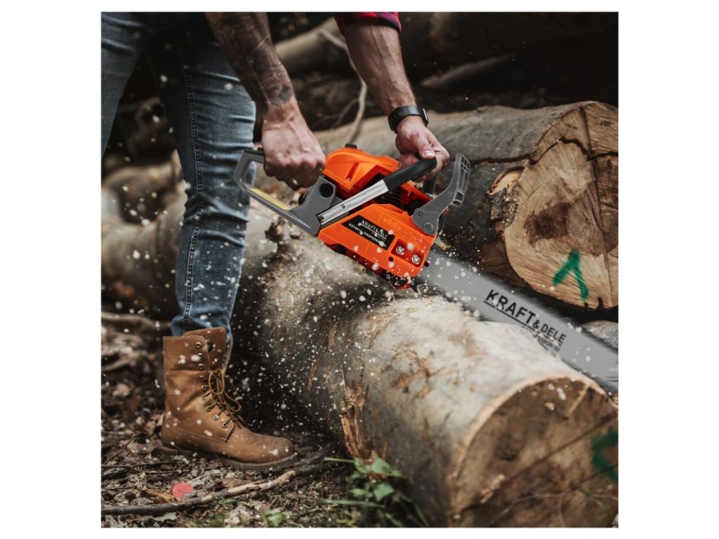 Profesionální benzínová pila KRAFT&DELE o výkonu 5,9 HP slouží k opracování dřeva jak v lesnictví, tak v domácnosti. Využití při přípravě palivového dříví, stavební práce ve dřevě, práce na farmách a zemědělství, kácení stromů, péče o stromy atd. Pevná, odolná a spolehlivá konstrukce, která splní ty nejvyšší požadavky. Protiskluzová rukojeť zajišťuje pevné uchopení a pohodlí při práci. Pila se vyznačuje velmi dobrým zpracováním a velmi dobrými komponenty použitými při její konstrukci. Pila má startér s pružinou GO START - ke spuštění stačí jedno zatažení Zapalovací systém je vybaven CDI cívkou. Karburátor EASY START s automatickým sytičem.
