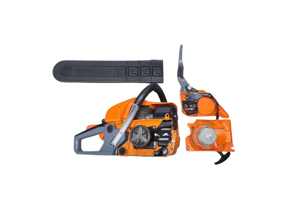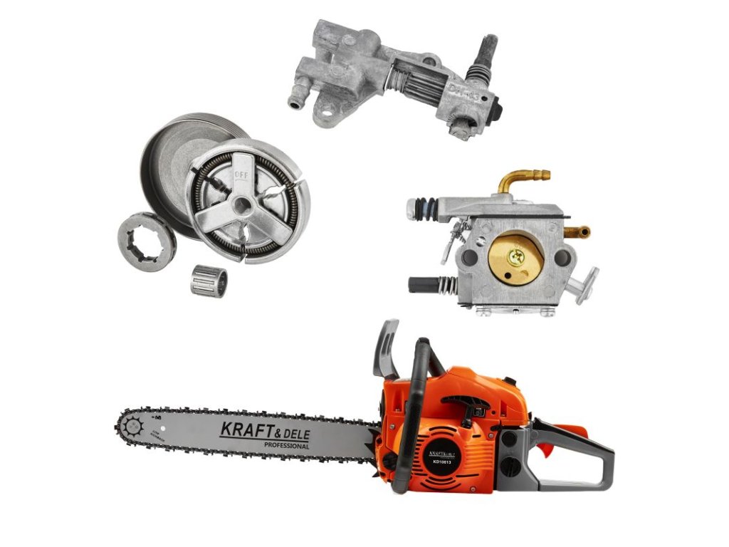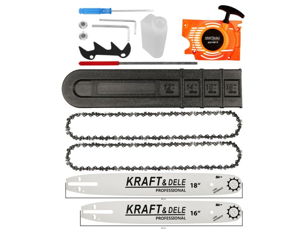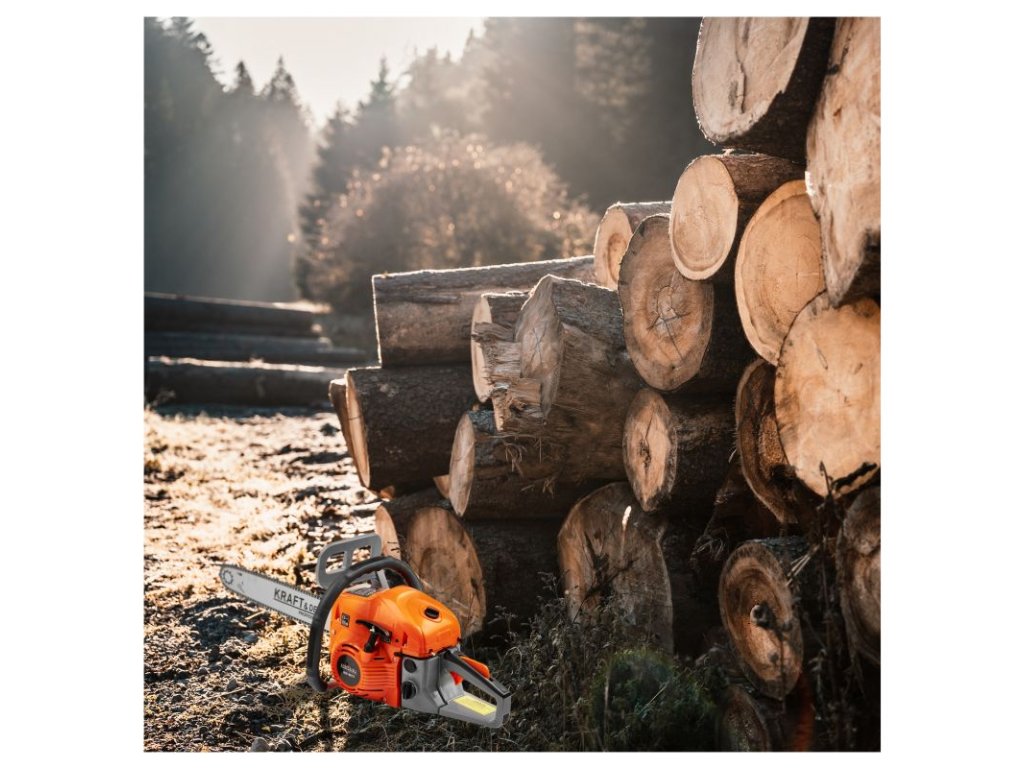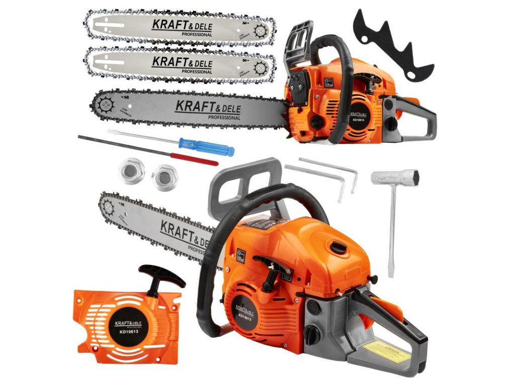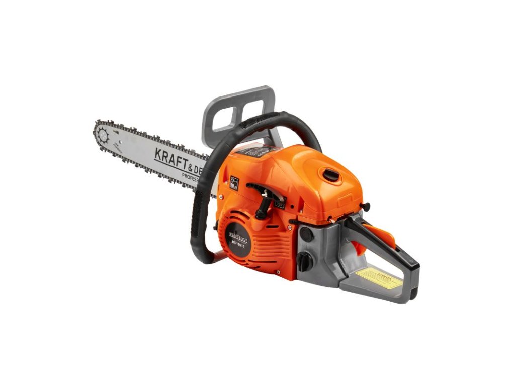 Profesionální benzínová pila KRAFT&DELE o výkonu 5,9 HP slouží k opracování dřeva jak v lesnictví, tak v domácnosti. Využití při přípravě palivového dříví, stavební práce ve dřevě, práce na farmách a zemědělství, kácení stromů, péče o stromy atd. Pevná, odolná a spolehlivá konstrukce, která splní ty nejvyšší požadavky. Protiskluzová rukojeť zajišťuje pevné uchopení a pohodlí při práci. Pila se vyznačuje velmi dobrým zpracováním a velmi dobrými komponenty použitými při její konstrukci. Pila má startér s pružinou GO START - ke spuštění stačí jedno zatažení Zapalovací systém je vybaven CDI cívkou. Karburátor EASY START s automatickým sytičem.