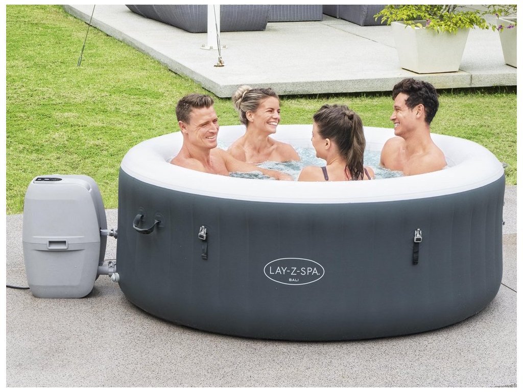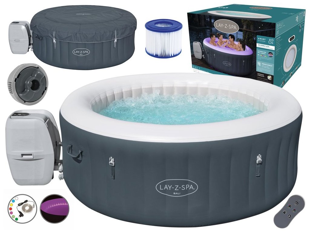 Vířivý bazén – vířivka Lay-Z-Spa Bali AirJet Bestway je pohodlná nafukovací vířivka navržená pro blaženou relaxaci doma. Ve vířivce o rozměrech 180x66 se snadno vejdou 4 dospělí. Nafukovací vířivka se 120 tryskami AirJet způsobí, že se ze dna vířivky uvolní tisíce vzduchovým bublin a vytvoří bubliny určené k masáži vašeho těla po náročném dni. Při hydroterapii můžete využít i barevnou terapii díky LED osvětlení v sedmi barvách ovládaných dálkovým ovládáním. Co víc si můžete přát po dlouhém únavném dni v práci. Použitý systém AirJet obsahuje až 120 trysek, které uvolňují bubliny ze dna vířivky a vytvářejí teplé, bublající lázeňské prostředí s hydromasážní. Představte si tisíce bublin, které Vám masírují pokožku, bolestivá místa pro náročném pracovním dni, čistá relaxace. Kromě toho LED osvětlení, které vytváří atmosféru během večerního odpočinku, zajistí, že už nebude potřeba nic jiného. Čerpadlo je vybaveno systémem rychlého ohřevu, který ohřívá vodu na max. 40 °C. Díky nejnovější integrované technologii je čerpání vířivky, ohřev a filtrace vody a ovládání masážního systému vše pomocí jednoho čerpadla. Úsporný časovač nejenže šetří energii „vypnutím“ Lay-Z-Spa Paris, když se nepoužívá, ale také vám umožňuje naplánovat, kdy by se měla vířivka zahřát, aby byla připravena jít, než se vrátíme domů. Dodávaný dávkovač ChemConnect udržuje čistou a zdravou vodu rovnoměrným rozptýlením chloru. Nafukovací vířivka BALI vám umožní pohodlně odpočívat doma. Stačí jej rozložit na rovný a stabilní povrch. Návod BESTWAY 60009. Návod na osvětlení BESTWAY.