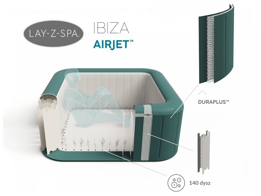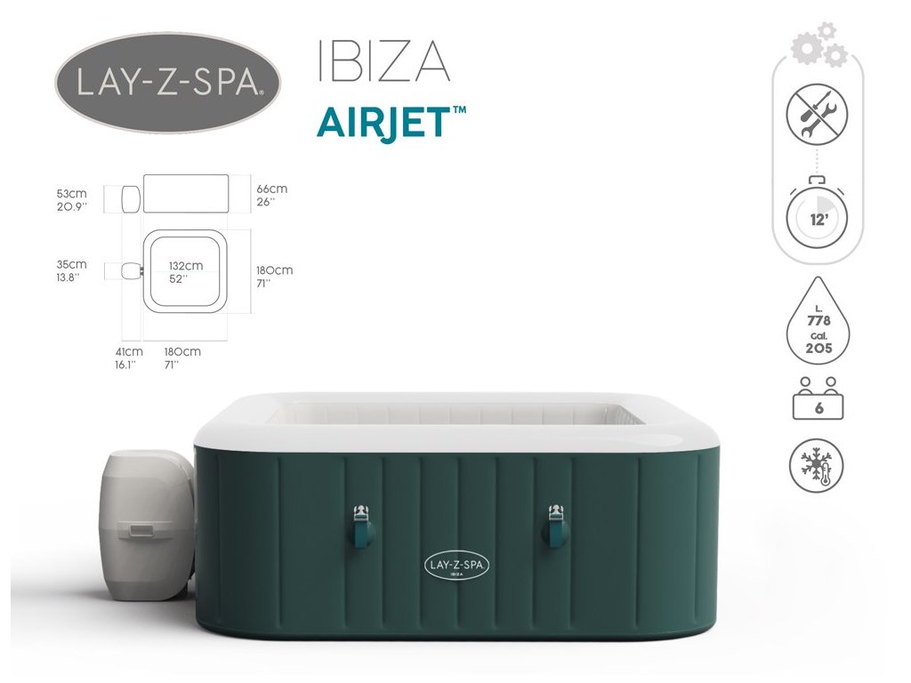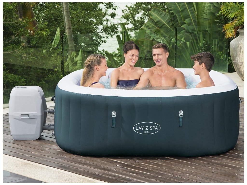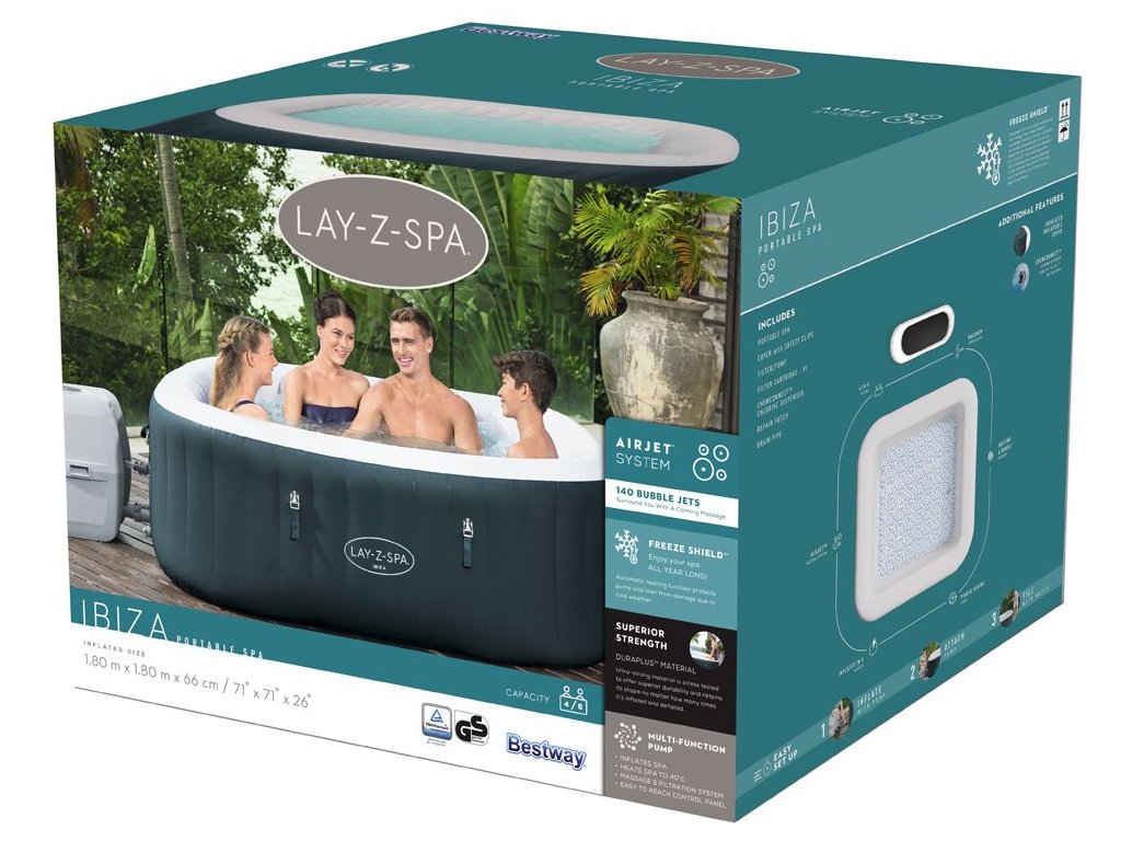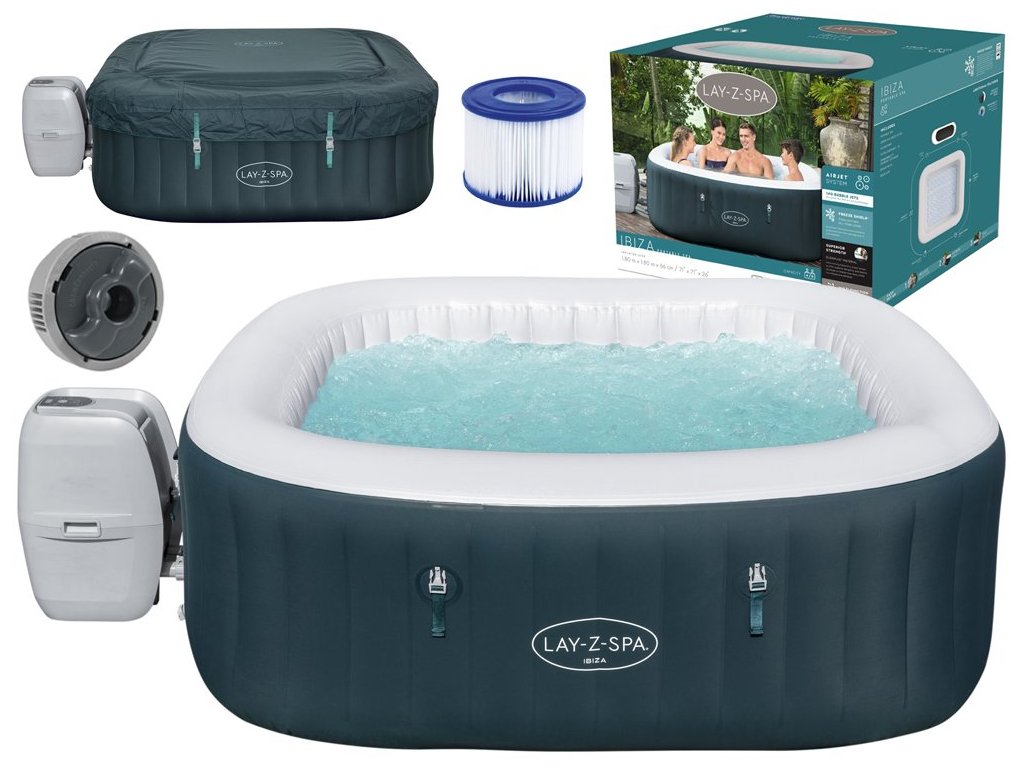 Pohodlný vířivý bazén – vířivka Lay-Z-Spa IBIZA AirJet je nabídkou Bestway pro lidi, kteří si cení relaxace, pohodlí a komfortu. Není nic lepšího, než mít možnost po horkém a dlouhém dni si udělat hornou lázeň a dopřát si odpočinek a relaxaci. Je to dokonalý způsob, jak zakončit den, strávit čas bezstarostným rodinným časem nebo se setkat s přáteli. Vířivka může snadno pojmout 4 až 6 osob. Vhodné pro 4-6 osob. Lay-Z-Spa IBIZA plně využívá svého čtvercového tvaru, díky čemuž je dostatečně prostorný pro zábavu a zachovává intimitu luxusní vířivky. Pohodlně se usaďte, relaxujte a využijte vlastní vířivku pro spontánní večery s přáteli nebo rodinou. Masážní systém AirJet obsahuje až 140 trysek, které uvolňují bubliny ze spodní části vířivky a vytvářet teplé, bublající lázeňské prostředí s hydromasážní. Čerpadlo obsahuje systém rychlého ohřevu, který ohřívá vodu na 40 °C. Díky nejnovější integrované technologii můžete ohřívat vířivku, aktivovat masážní systém a současně filtrovat vodu pomocí stejného čerpadla. Úsporný časovač nejenže šetří energii „vypnutím“ Lay-Z-Spa Ibiza, když se nepoužívá, ale také vám umožňuje naplánovat, kdy by se měla voda začít nahřívat, aby byla připravena k použití, než se vrátíme domů. Součástí vířivky je dávkovač ChemConnect, který udržuje čistou a zdravou vodu rovnoměrným rozptýlením chloru. Přenosnou vířivku Lay-Z-Spa Ibiza lze umístit prakticky kdekoli na rovném povrchu. Jedná se o kombinaci inovace a stylu, která se vyznačuje použitím vysoce kvalitních a odolných materiálů. Díky tomu můžete cítit trochu luxusu a spoustu relaxace za dostupnou cenu.