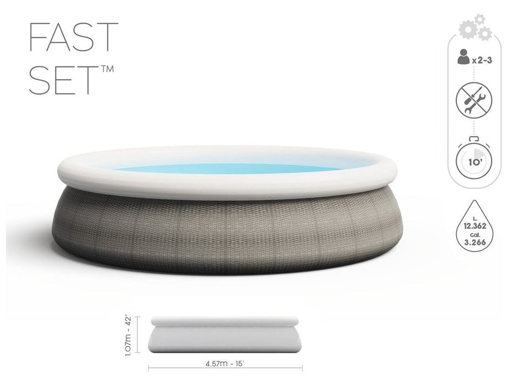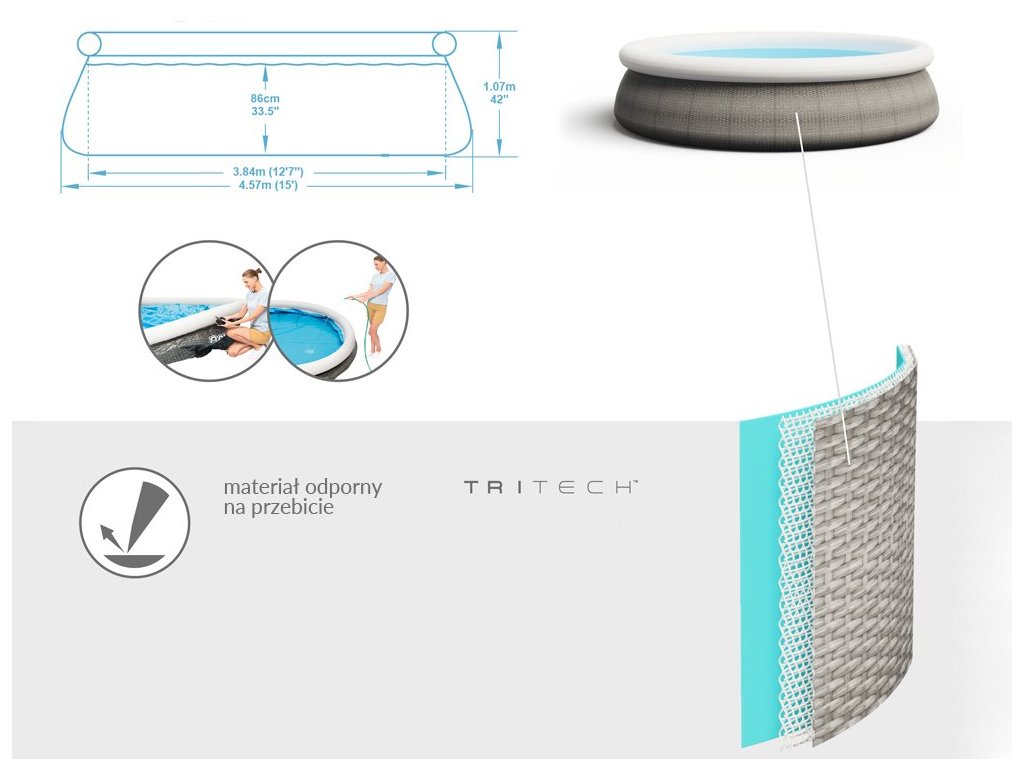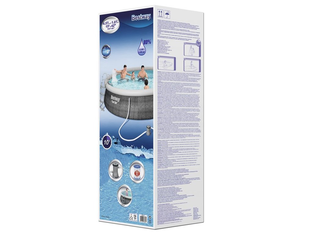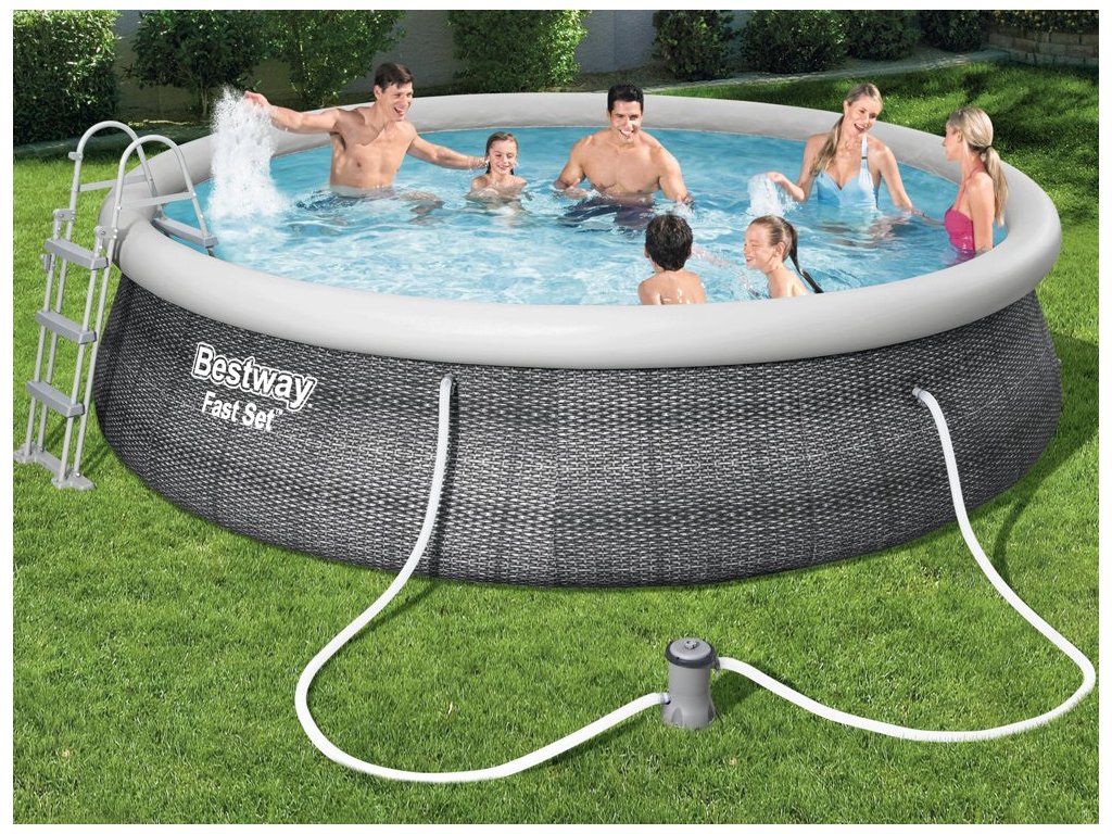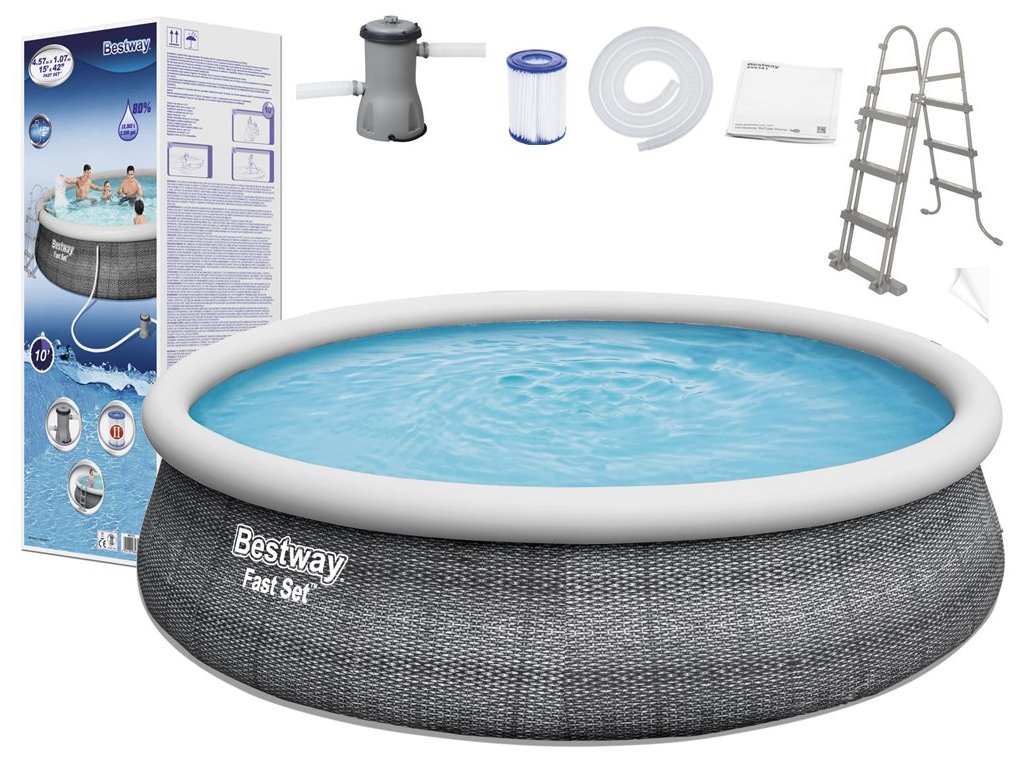 Bestway Bazén v odstínu techno-ratanové šedé dokonale zapadne do zahradního designu. Díky svým působivým rozměrům 457x107 cm snadno pojme děti i rodiče. Odpočinek v soukromém zahradním bazénu je dokonalým zakončením intenzivního dne, skvělým nápadem pro trávení času s rodinou nebo setkání s přáteli. Bazény FastSet jsou vyrobeny ze silného a odolného materiálu Tritech, což je třívrstvá kombinace PVC a polyesteru. Další výhodou je realistický ratanový potisk na vnější straně bazénu. Instalace bazénů FastSet je snadná - stačí umístit bazén na tvrdý a rovný povrch, nafouknout okraj a napustit vodu. Design FastSet umožňuje nastavit výšku bazénu - když se voda nalije - stěny bazénu se napnou vodou a rostou s její úrovní. Díky tomu můžete bazén využívat v různých hloubkách vody. Hrají si v něm děti, kterým nebudou překážet stěny bazénu. Bazén lze používat od několika desítek cm. Přiložené filtrační čerpadlo se postará o čistotu vody, díky čemuž si budete moci déle užívat bezstarostné ležení v čisté vodě. Bezpečný žebřík usnadní vstup a výstup z bazénu. Nohy žebříku lze zvednout, aby děti nemohly bazén používat samy, bez dozoru dospělých.