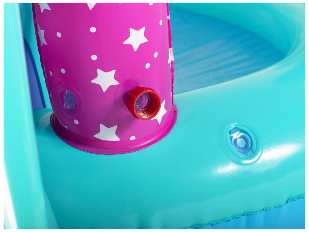Nafukovací bazénové hřiště Bestway je nepostradatelnou pomůckou pro dlouhé, horké letní dny. Díky tomu můžete ve své zahradě vytvořit vodní zábavné centrum a zároveň udržet děti v chladu. Bazén je vyroben z měkkého, ale odolného PVC v intenzivních barvách. Výhodou bazénu je vodní fontána, která se spustí napojením zahradní hadice a dvojitá skluzavka s přistávacím polštářem. Souprava obsahuje také balónky a kouzelnou hůlku. Hřiště má řadu další atrakcí, díky kterým bude zábava v něm pro děti zajímavá. Po skončení hry se bazén snadno vyprázdní díky zabudovanému vypouštěcímu ventilu. Bazén lze snadno rozebrat a skladovat nebo přepravovat.
