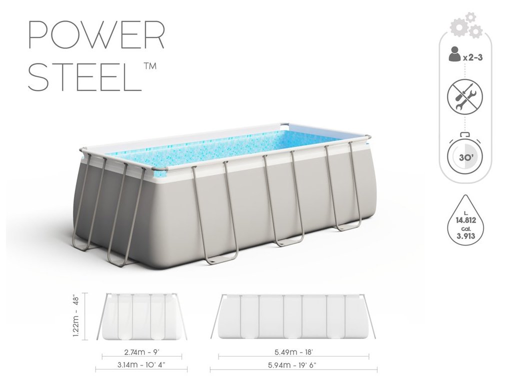 Rámový zahradní bazén Bestway POWER STEEL™ s působivými rozměry 549 x 274 x 122 cm a objemem 14 812 l poskytne komfortní chlazení v horkých dnech. Díky velikosti a hloubce bazénu se v něm děti i dospělí cítí velmi pohodlně. Senzační obdélníkový bazén s působivými rozměry umožní ochladit se v horkém dni celé rodině.