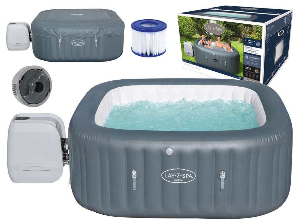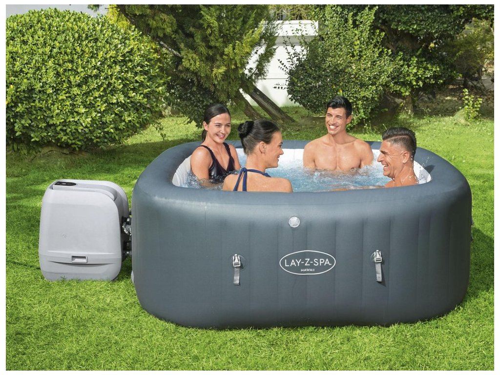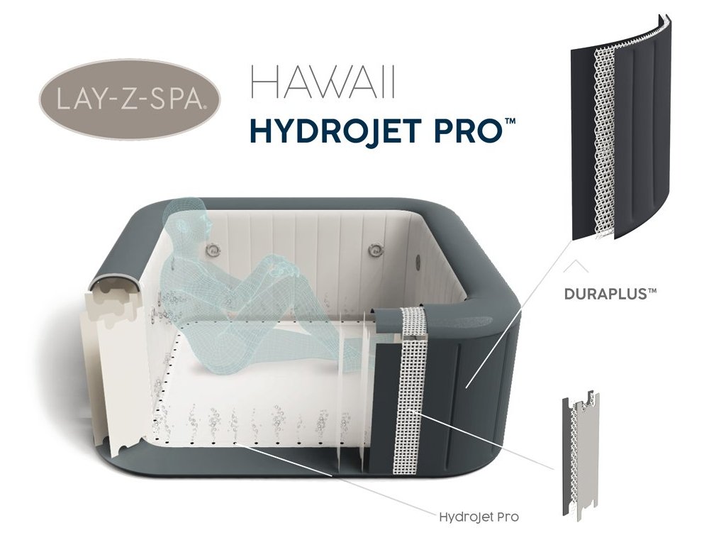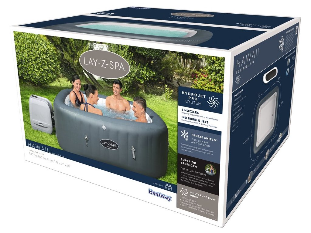 Havaj, kdo by nesnil o tom, trávit tam dovolenou? Bestway proto nabízí náhradu za splněný sen v podobě vířivky Lay-Z-Spa Hawaii. Lay-Z-Spa Hawaii HydroJet přináší do vašeho domova chuť tropického ducha. Ve vířivce může být najednou až 6 dospělých osob! Díky tomu je ideální pro rodinný relax nebo zábavu s přáteli. Vířivku můžete rozložit bez jakýchkoli nástrojů, stačí rovný povrch. Vhodné pro 4-6 osob. Lay-Z-Spa Hawaii plně využívá svého čtvercového tvaru, díky čemuž je dostatečně prostorný na zábavu a zachovává intimitu luxusní vířivky. Pohodlně se usaďte, relaxujte a využijte vlastní vířivku pro spontánní večery s přáteli nebo rodinou. Masážní systém HydroJet Pro nabízí dva způsoby relaxace ve vířivce. 8 trysek HydroJet obklopuje boční stěny, aby uvolňovaly cílené vodní proud, zatímco 140 trysek AirJet uvolňuje bubliny ze spodní části vířivky, čímž vytváří teplé, bublající prostředí vířivky. Tento uklidňující masážní systém vám pomůže relaxovat a odpočinout si. Čerpadlo obsahuje systém rychlého ohřevu, který ohřívá vodu na 40 °C. Díky nejnovější integrované technologii můžete ohřívat vířivku, aktivovat masážní systém a současně filtrovat vodu pomocí stejného čerpadla. Úsporný časovač nejenže šetří energii „vypnutím“ Lay-Z-Spa Hawaii, když se nepoužívá, ale také vám umožňuje naplánovat, kdy by se měla voda začít nahřívat, aby byla připravena k použití, než se vrátíme domů. Přenosnou vířivku Lay-Z-Spa Hawaii lze umístit prakticky kdekoli na rovném povrchu. Jeho polstrovaná podlaha, nafukovací stěny a robustní konstrukce Y-BEAM zajistí vynikající strukturální stabilitu a pohodlí při používání. Vnější nafukovací kryt poskytuje další ochranu a izolaci. Vířivka je vyrobena z exkluzivního třívrstvého materiálu Duraplus ™, který poskytuje vynikající pevnost a odolnost bez obětování pohodlí. Vířivka Hawaii Lay-Z-Spa, jedná se o vysoce kvalitní čtvercovou vířivku za dostupnou cenu. Návod zde.