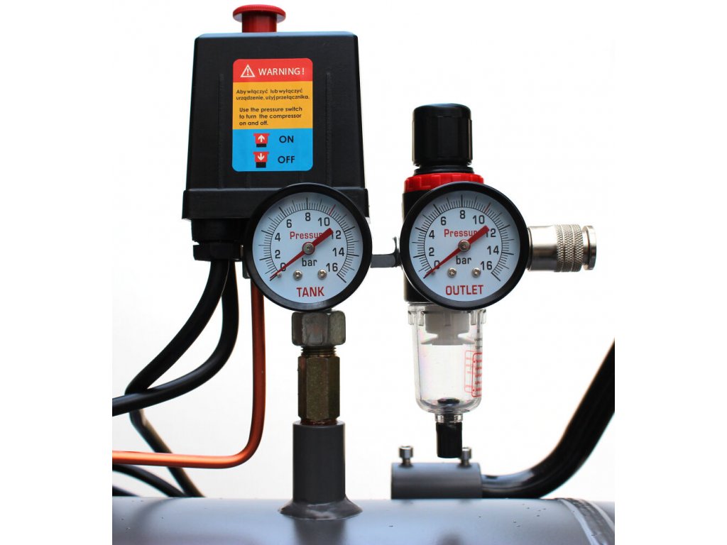 - ergonomický - má redukční ventil vybavený inovativním seřizovacím mechanismem, 2 velké manometry umístěné na kompresoru v poloze usnadňující vyčtení parametrů a pohodlný vypouštěcí kohoutek