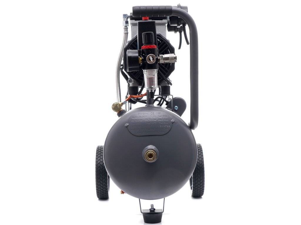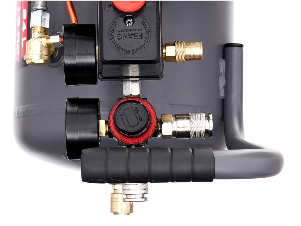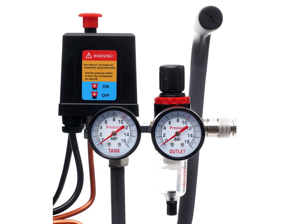 - ergonomický - má redukční ventil vybavený inovativním seřizovacím mechanismem, 2 velké manometry umístěné na kompresoru v poloze usnadňující vyčtení parametrů a pohodlný vypouštěcí kohoutek