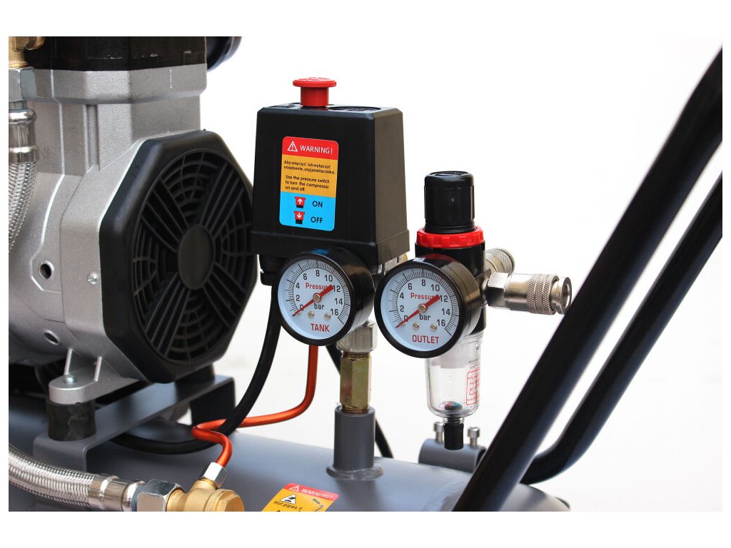 - ergonomický - má redukční ventil vybavený inovativním seřizovacím mechanismem, 2 velké manometry umístěné na kompresoru v poloze usnadňující vyčtení parametrů a pohodlný vypouštěcí kohoutek