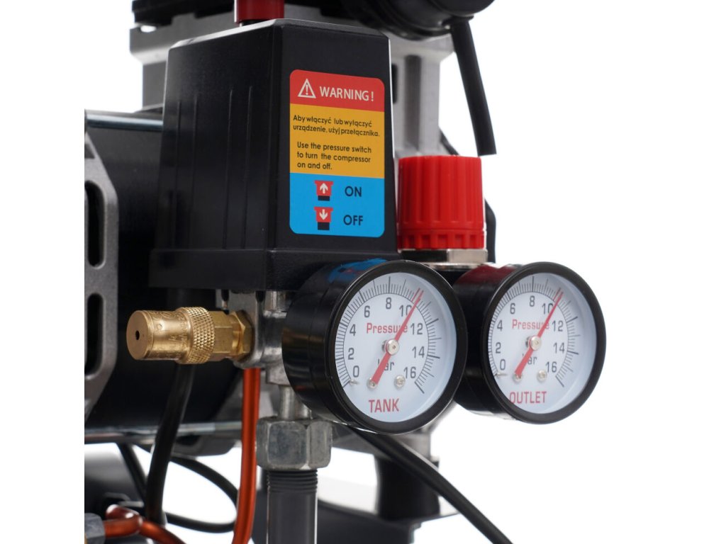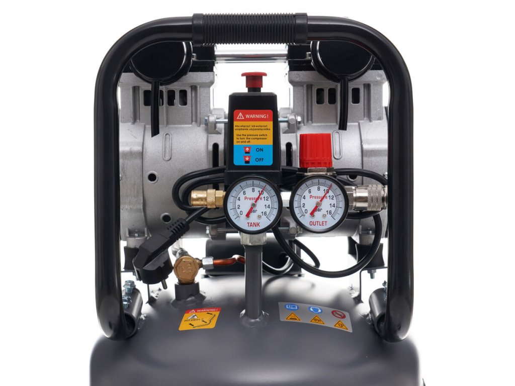 - ergonomický - má redukční ventil vybavený inovativním seřizovacím mechanismem, 2 velké manometry umístěné na kompresoru v poloze usnadňující vyčtení parametrů a pohodlný vypouštěcí kohoutek