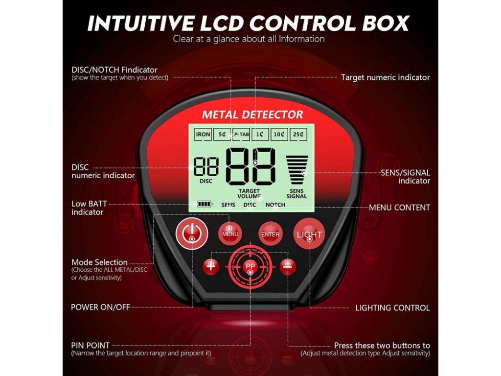 Detektor kovů je ideální pro efektivní vyhledávání kovových, zlatých, stříbrných předmětů, včetně mincí, šperků nebo jiných cenností ukrytých v zemi. Detektor je lehký, univerzální a velmi snadno se používá. Pokud detektor detekuje předmět, zapípá a kurzor kolem názvu cíle se rozsvítí. LCD také zobrazuje rozsah číselných cílů a sílu signálu.