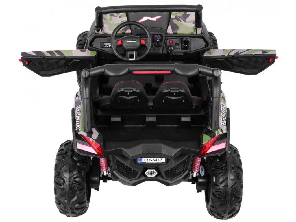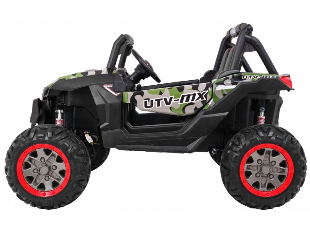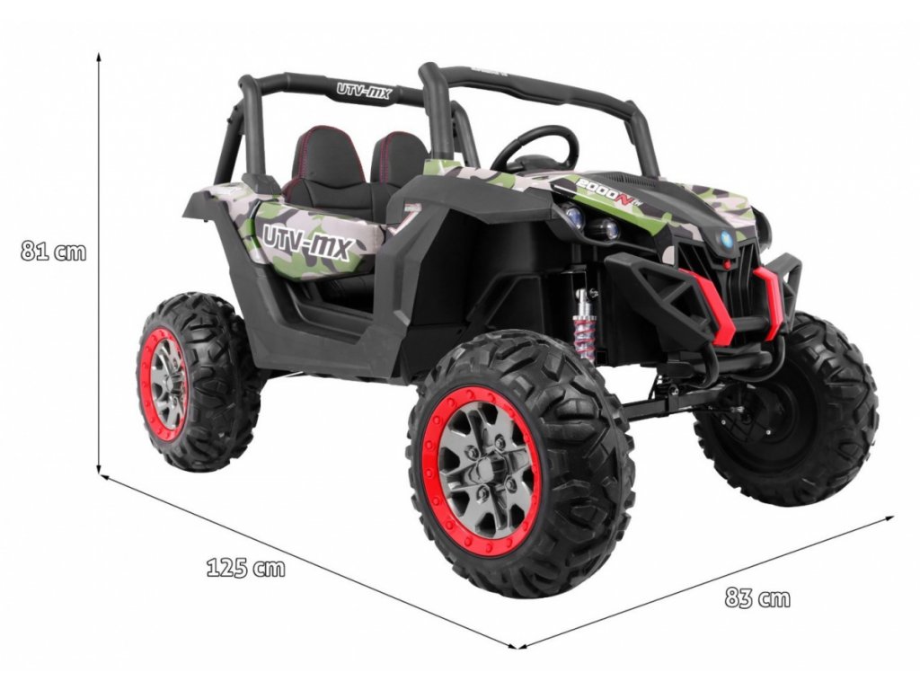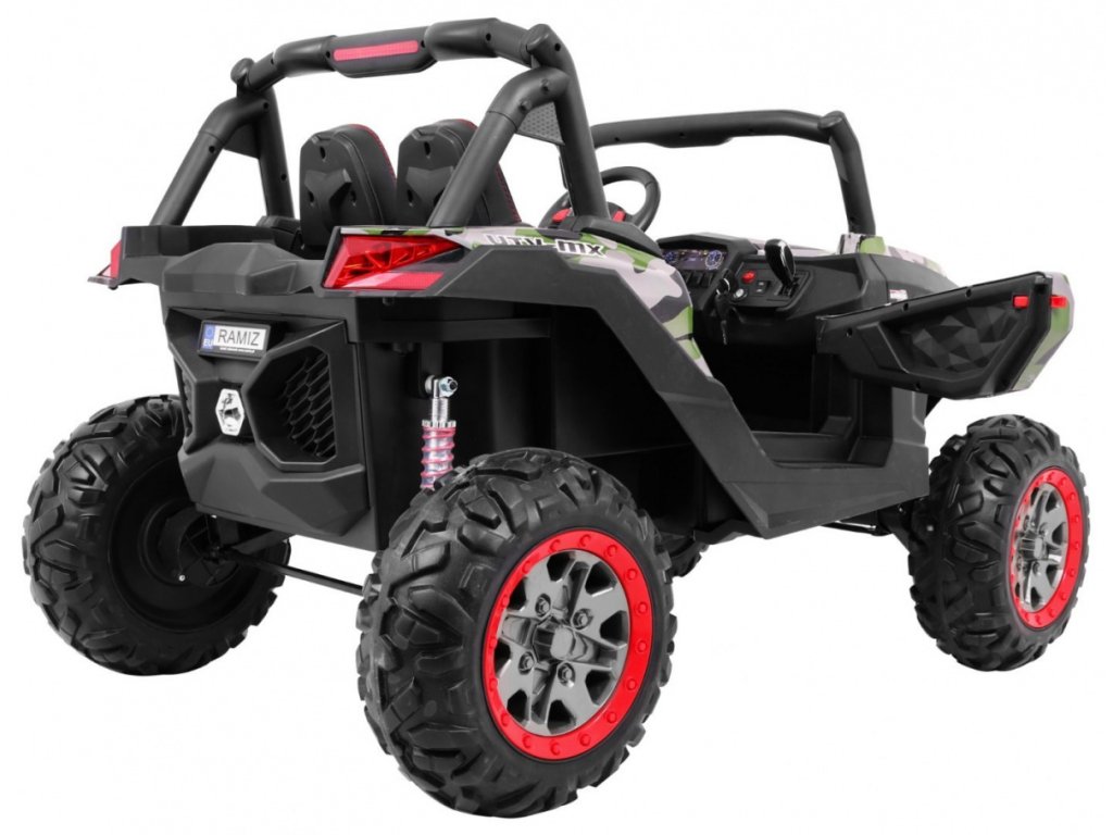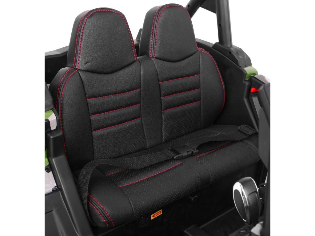 Tato velká bugina 4x4 má nádherný vzhled terénního vozidla, kvalitní materiály a zpracování. Naše nejprodávanější terénní vozítko. Má otvírací dveře, jezdí vpřed/vzad na nožní pedál, nebo se ovládá dálkovým ovladačem se 3 rychlostmi vpřed, 3 vzad, pravá/levá, s přednostní jízdou nad pedálem tzn. dítě můžete ovladačem zastavit. Jízda vpřed/vzad se ovládá řadící páčkou na přístrojové desce. Bugína má přední a zadní světla LED. Start motoru, zvukové efekty, klakson, písničky jsou ovládané na volantu, přehrávačem FM, Mp3, TF s krásným zvukem volíte vlastní hudbu a hlasitost. Zadní náprava je odpružená. Veliká EVA kola (jako gumová) zajišťují tichou a příjemnou jízdu. Při nesešlápnutém pedálu tah motoru nahrazuje brzdu nebo brzdíte ovladačem. Auto má náhon na všechny 4 kola, tím je vhodné i pro jízdu v terénu. Pro větší bezpečnost dětí jsou na luxusní čalouněné sedačce 2 nastavitelné bezpečnostní pásy a 2 ochranné rámy. Oproti konkurenci má navíc naše bugina páčku změny rychlostí ,,1-2-3 / zpátečka" na palubní desce, startování klíčem, odpruženy obě nápravy. Naši kluci také testovali tuto bugínu.