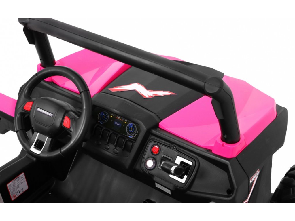Tato velká bugina 4x4 má nádherný vzhled terénního vozidla, kvalitní materiály a zpracování. Naše nejprodávanější terénní vozítko. Má otvírací dveře, jezdí vpřed/vzad na nožní pedál, nebo se ovládá dálkovým ovladačem se 3 rychlostmi vpřed, 3 vzad, pravá/levá, s přednostní jízdou nad pedálem tzn. dítě můžete ovladačem zastavit. Jízda vpřed/vzad se ovládá řadící páčkou na přístrojové desce. Bugína má přední a zadní světla LED. Start motoru, zvukové efekty, klakson, písničky jsou ovládané na volantu, přehrávačem FM, Mp3, TF s krásným zvukem volíte vlastní hudbu a hlasitost. Zadní náprava je odpružená. Veliká EVA kola (jako gumová) zajišťují tichou a příjemnou jízdu. Při nesešlápnutém pedálu tah motoru nahrazuje brzdu nebo brzdíte ovladačem. Auto má náhon na všechny 4 kola, tím je vhodné i pro jízdu v terénu. Pro větší bezpečnost dětí jsou na luxusní čalouněné sedačce 2 nastavitelné bezpečnostní pásy a 2 ochranné rámy. Oproti konkurenci má navíc naše bugina páčku změny rychlostí ,,1-2-3 / zpátečka" na palubní desce, startování klíčem, odpruženy obě nápravy. Naši kluci také testovali tuto bugínu.