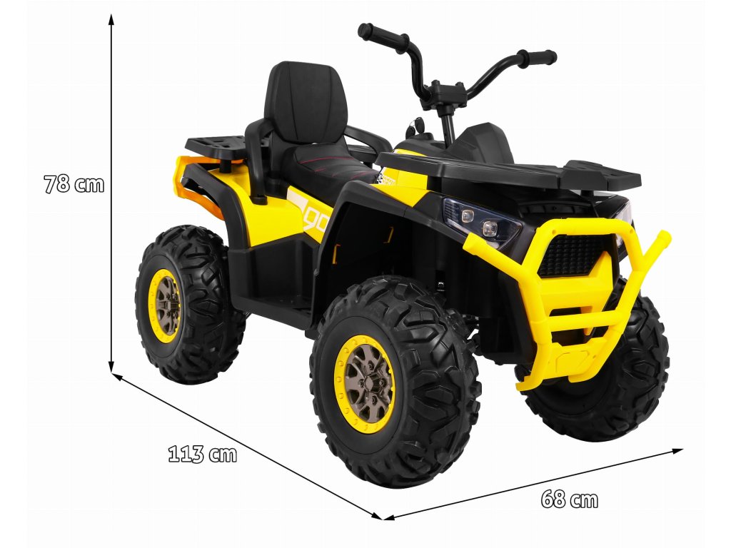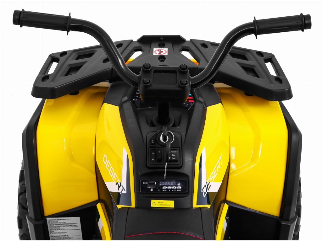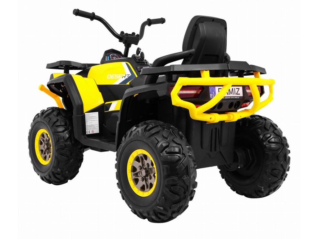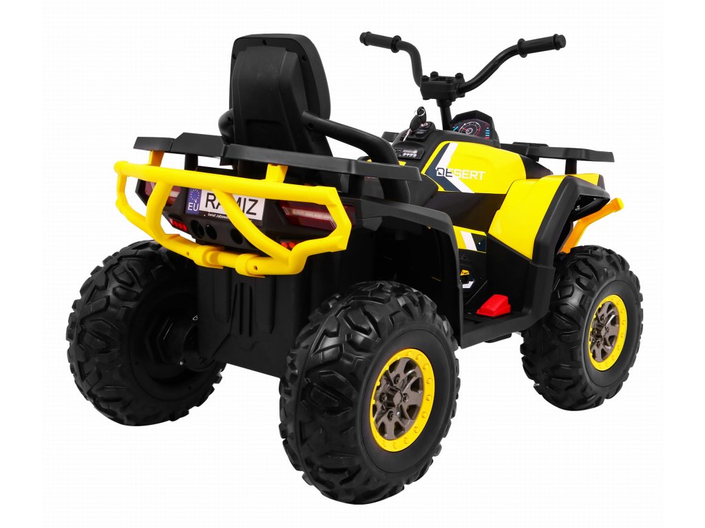 Elektrická čtyřkolka ATV Desert je díky robustní konstrukce, mohutným kolům z měkké pěny EVA, možnost přepínání náhonu (dvou nebo čtyř kol) vhodná pro řádění v terénu. Jízda vpřed i vzad, 2 rychlosti dopředu, 1 rychlost vzad. Čtyřkolka je vybavená LED osvětlením a mimo jiné i řadou senzačních zvukových efektů jako zvuk motoru, hudební panel s veselými písněmi zajistní radostnou jízdu. Součástí čtyřkolky je klíč pro nastartování čtyřkolky. Pohodlné sedadlo je z černé kůže.