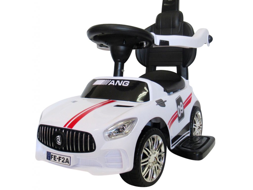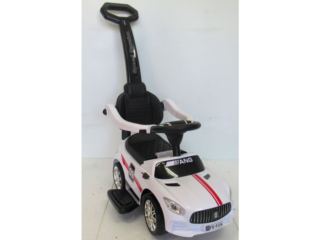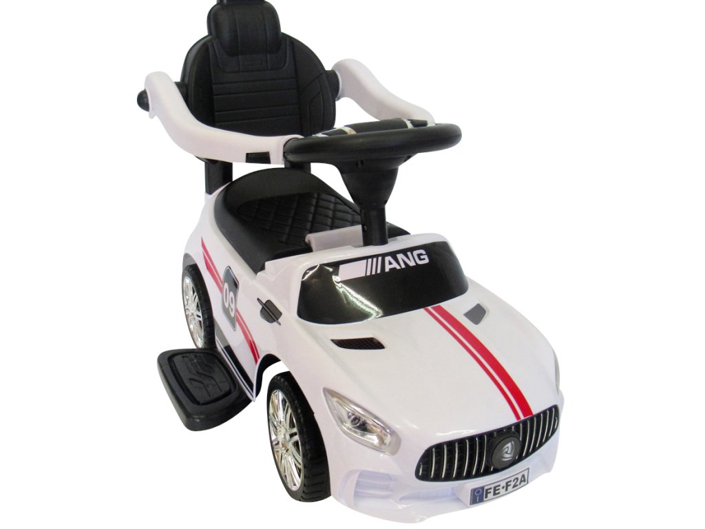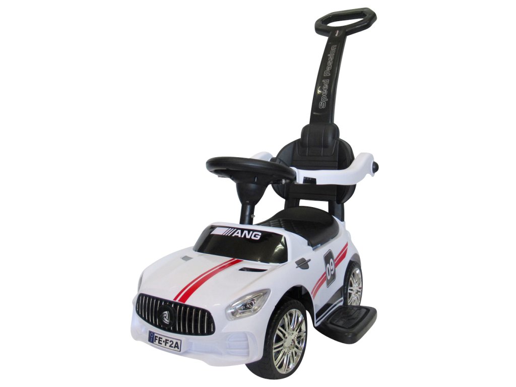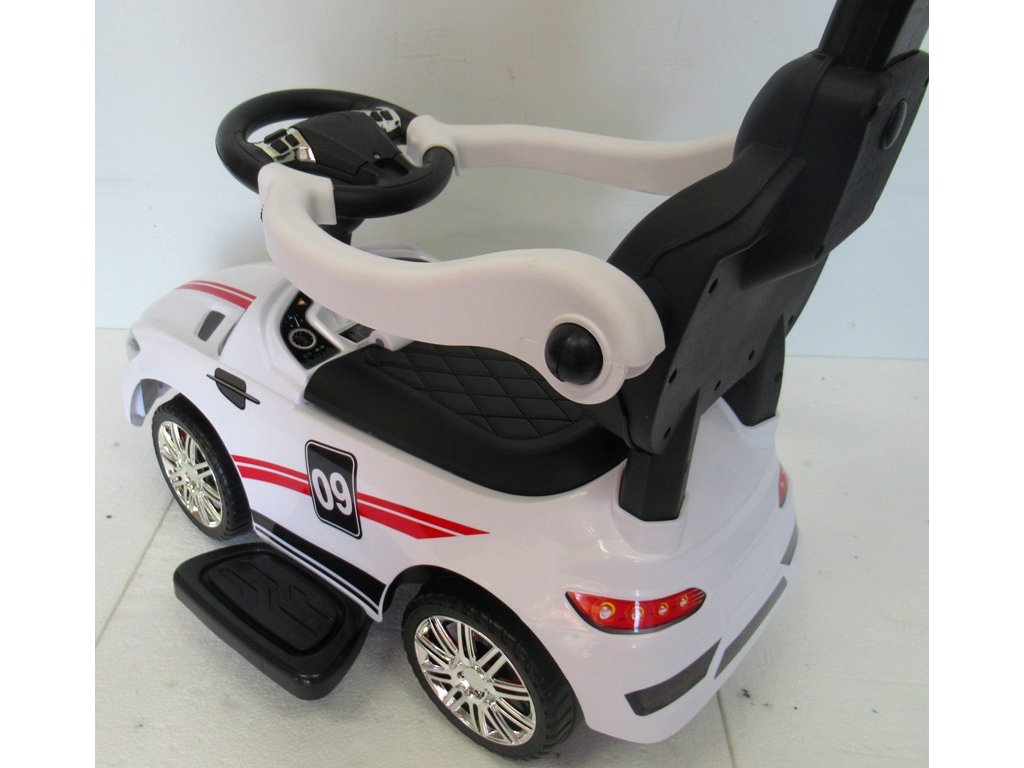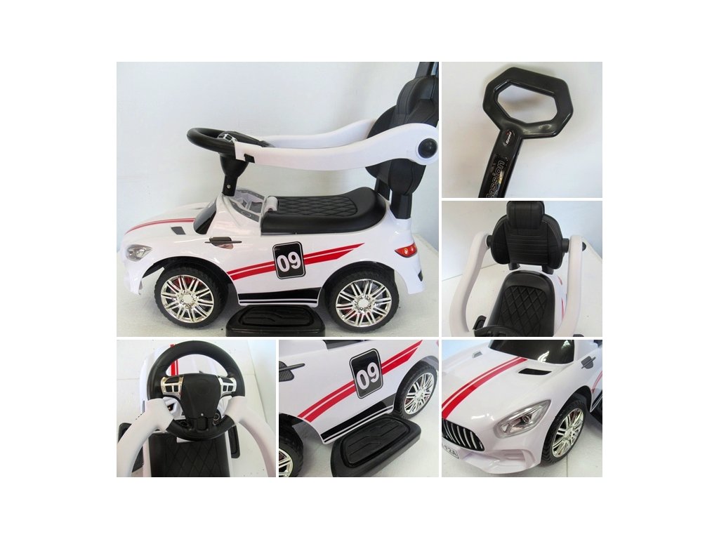 Odrážedlo, chodítko – dítě sedí za volantem a nohama se odráží od země. Ve verzi s možnosti přidělání tyče pro rodiče (je součástí balení), kdy rodič tlačí odrážedlo a tím ho uvede do pohybu (tyčí lze pouze tlačit odrážedlo, nelze s ní otáčet volantem). S odrážedlem může dítě jezdit dopředu/dozadu a může se otáčet doprava/doleva. Ve verzi tlačení – přidavná tyč jsou součástí bezpečnostní kolejnice – kola a volant jsou zablokovány. Vozidlo je obecně určeno pro venkovní použití, ale jeho ergonomický design umožňuje jeho použití i ve větších místnostech, jako je terasa nebo obývací pokoj. Po sejmutí rukojeti, opěrky nohou a bezpečností kolejnice se s tlačeného stroje stává odrážedlo. Kolejnice blokují volant. Po jejich odranění se voland a kola se zcela otáčí. A pak můžete otočit koly pomocí volantu. Ideální pro děti ve věku 1-3 let. Hudba a klakson jsou ovládány dítětem z volantu. Toto krásné vozidlo se může stát prvním autem v životě Vašeho dítěte a přinést mu nezapomenutelné vzpomínky z dětství, k nimž se po mnoha letech vrátí. Barevné jízdní odrážedlo – sportovní auto – pro malého řidiče.