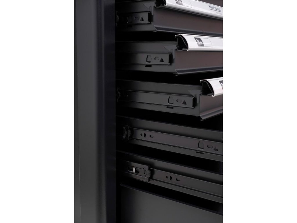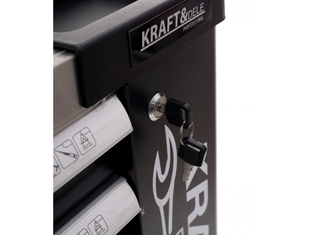 Tento dílenský vozík KD 1070 umožňuje udržovat pořádek na pracovišti a chrání nářadí proti krádeži (uzamykatelný vozík). Vozík má ergonomické rukojeti integrované s horními, plně výsuvnými zásuvkami na ložiskách. Centrální zámek se dvěma klíči uzavírající všechny zásuvky a dvojité stěny a zámek zásuvky. Vozík je vybaven 4 kolečky, díky čemuž se velmi snadno přepravuje. Vršek je univerzálně perforovaný (z polypropylenu). Součástí je prázdná zásuvka. Dále je zde dvoupatrová uzamykatelná komora.