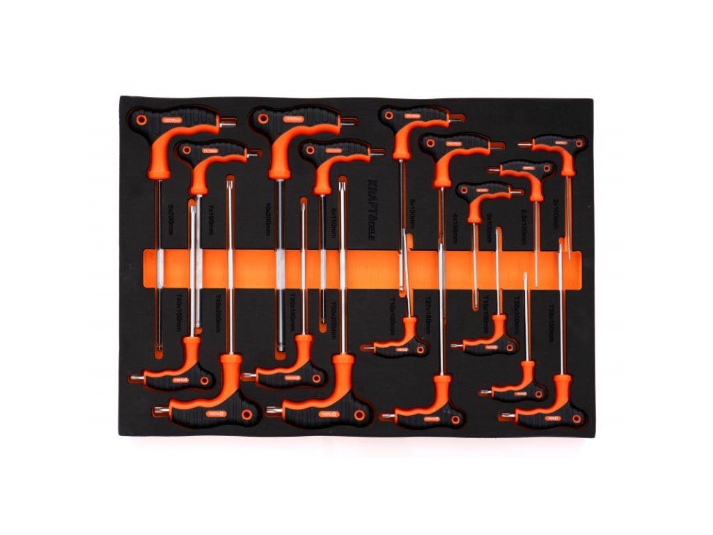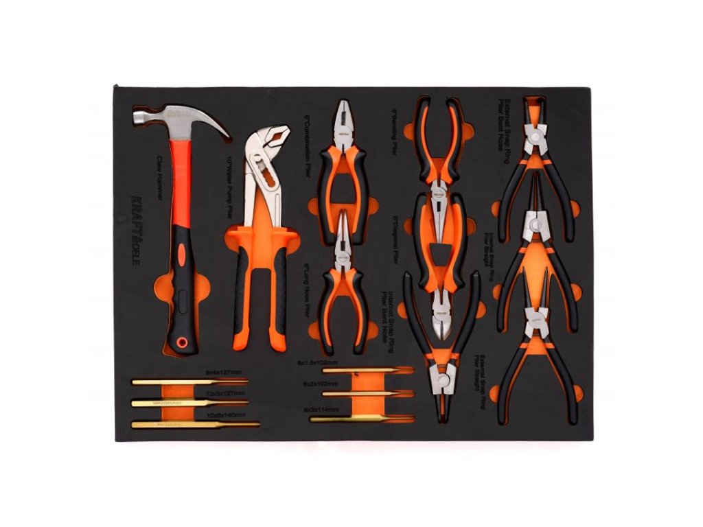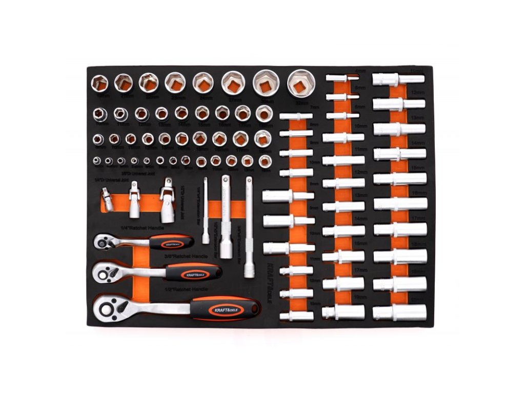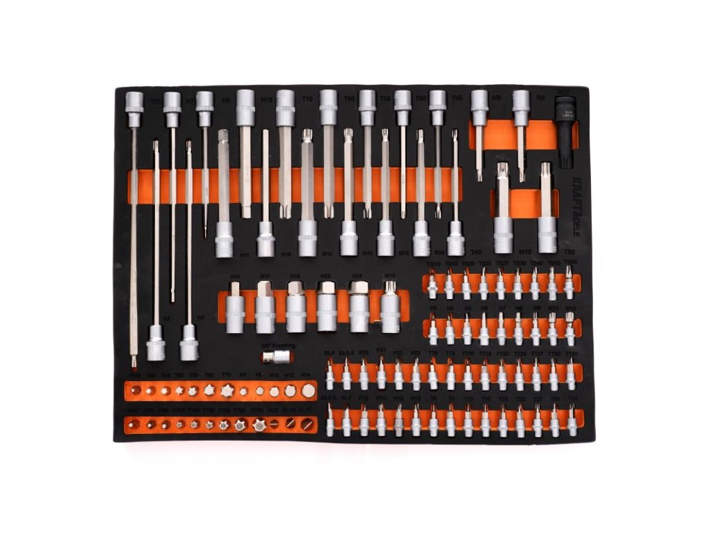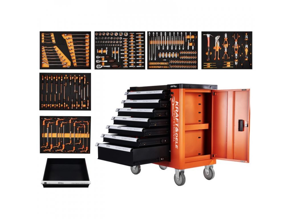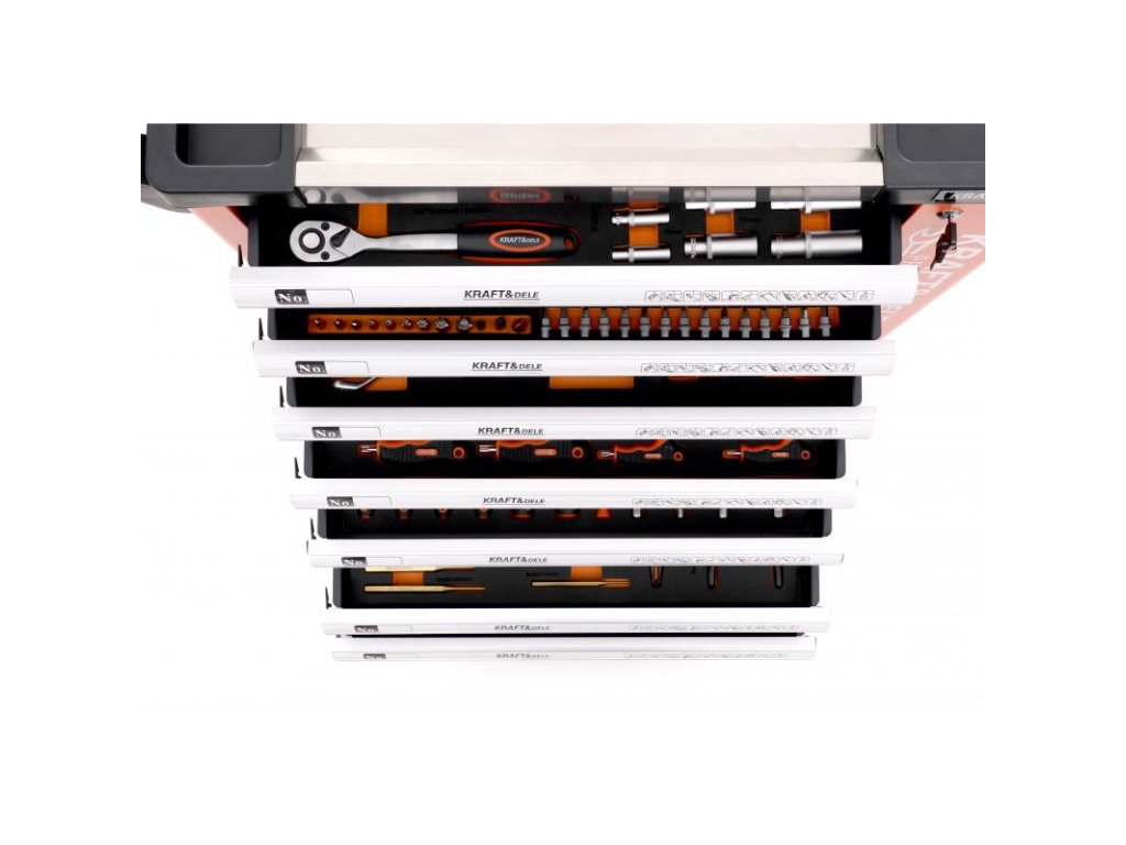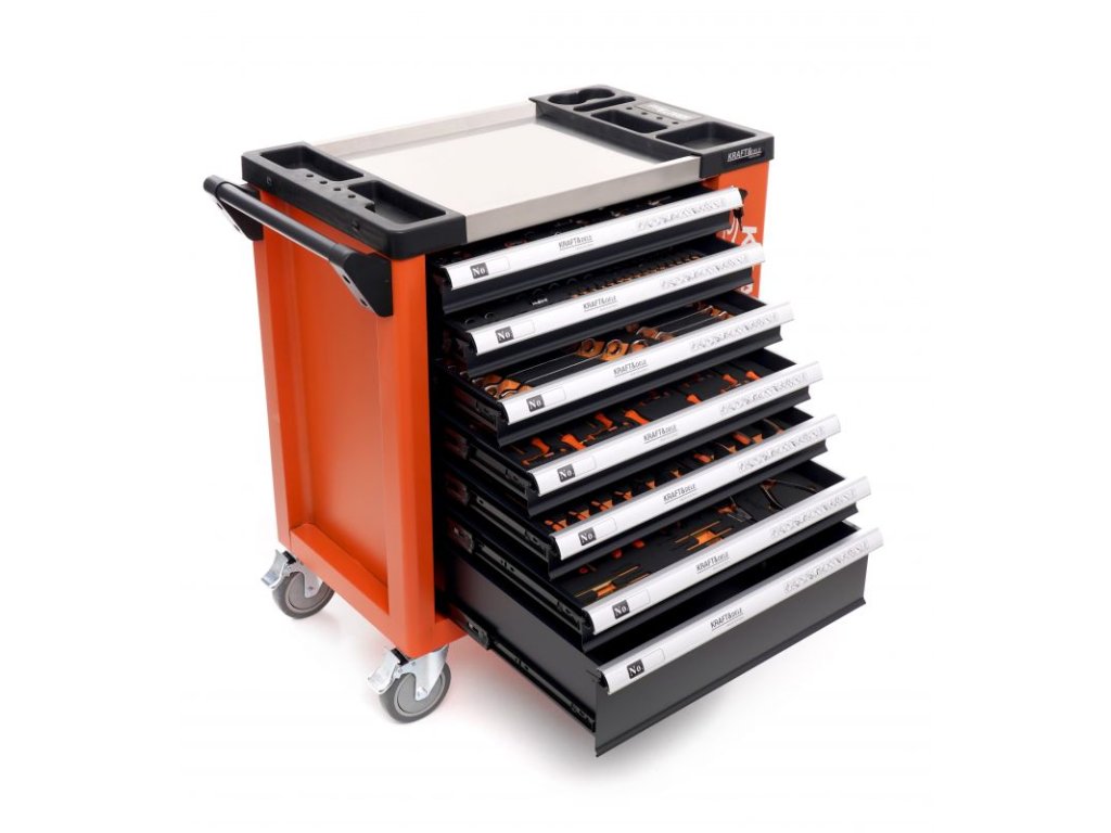- vozík obsahuje šest zásuvek s 258 kusy nářadí, jednu prázdnou zásuvku a uzamykatelnou skříňku