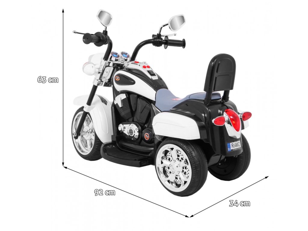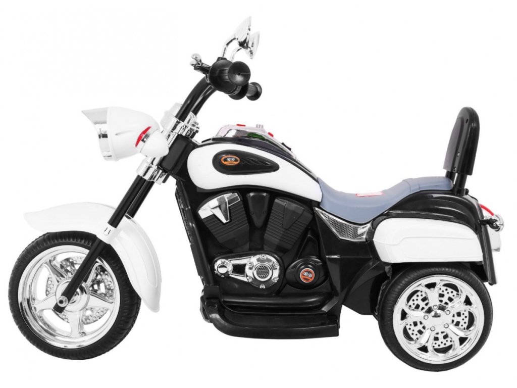Dětská elektrická motorka Chopper je určena pro jedno dítě. Její hlavní předností je jízda dopředu i dozadu. Motorka má přední LED světla a samozřejmě nechybí ani zvukové panel se 4 zvukovými tlačítky s melodiemi a zvuky.