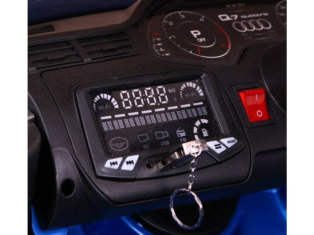 Nový model Audi Q7 přináší řadu senzačních inovací. Dva silné, elektrické motory (2x 45W / 12V) se starají o náhon obou zadních kol, díky čemuž je autíčko vhodné i pro řádění v terénu. Jízda na 3 rychlostní stupně vpřed a 3 vzad. Vozítko je možné ovládat dvěma způsoby - manuálně a dálkovým ovládáním. Při manuálním řízení se autíčko rozjede stisknutím nožního pedálu, po uvolnění pedálu autíčko samo zabrzdí. S řízením si tak bez problémů poradí i ti nejmenší, začínající řidiči. Nový 2.4G bluetooth dálkový ovladač má před manuálním řízením přednost - autíčko je možné zabrzdit i při stlačeném pedálu. Nad vozítkem tak máte plnou kontrolu. Audi Q7 NEW je vybavená senzačním LED osvětlením - denní svícení, svítící přední a zadní světla, mlhovky, osvětlené palubní přístroje, svítící stupeň zařazené rychlosti a LED display s voltmetrem. Nesmí chybět ani zvukové efekty jako klakson, zabudovaná muzika, zvuky motoru, startování a další. Pro ještě větší zážitek z jízdy je autíčko vybavené funkčním FM rádiem a vstupy pro MP3, USB a SD (paměťovou) kartu, díky čemuž je v autíčku možné přehrávat hudbu například z flashky. Hlasitost zvukových efektů je možné regulovat, stejně tak lze zvuky i osvětlení vypnout. Autíčko má otvíratelné dveře. Gumová kola z měkčeného EVA materiálu a odpružení přední i zadní nápravy zajišťují příjemnou jízdu. Pohodlná, koženková sedačka je opatřená stavitelným bezpečnostním pásem. Kromě občasného mytí a dobíjení nevyžaduje autíčko žádnou jinou údržbu.
