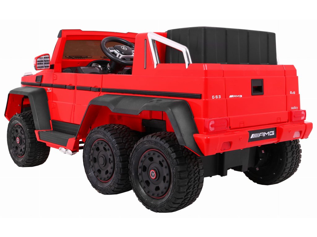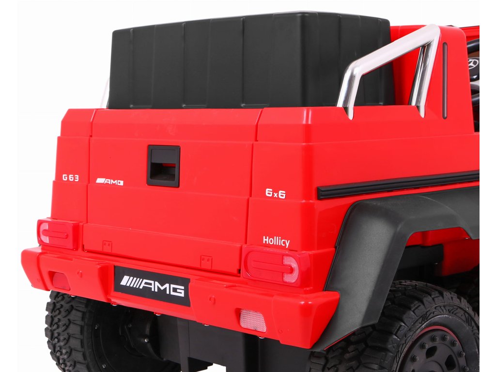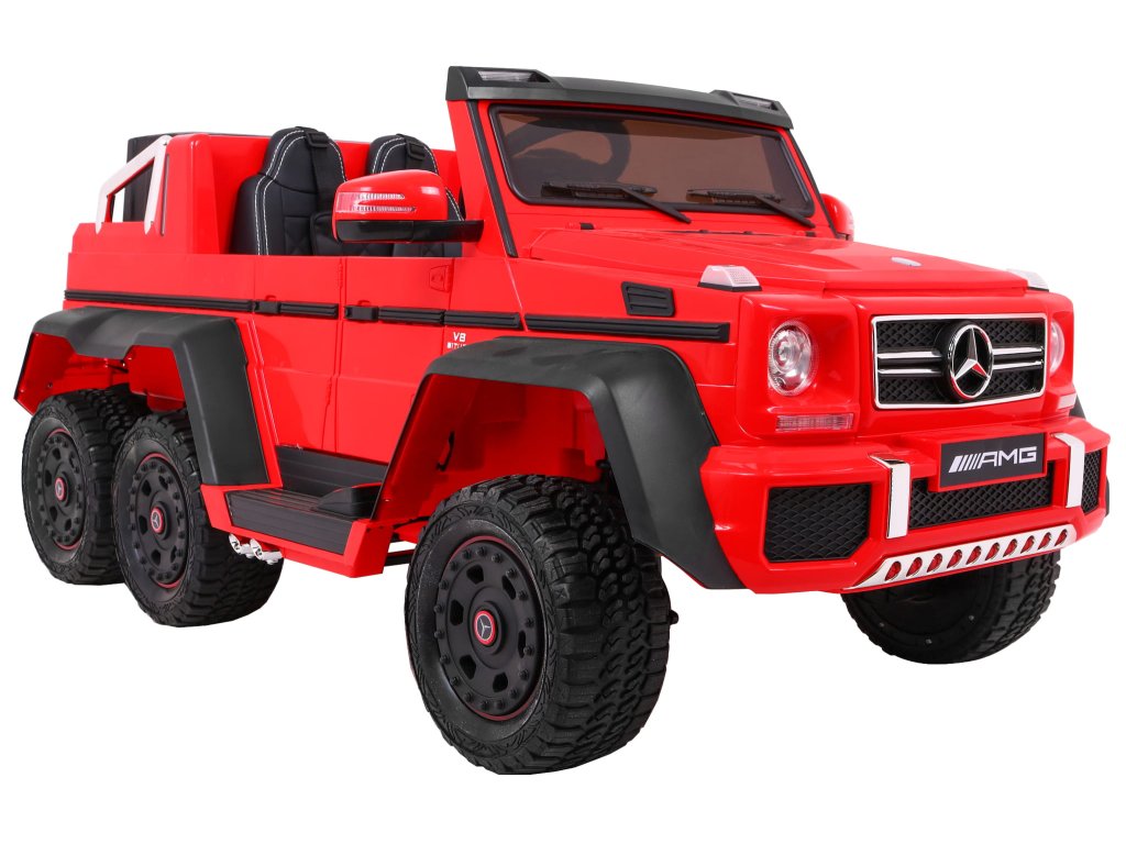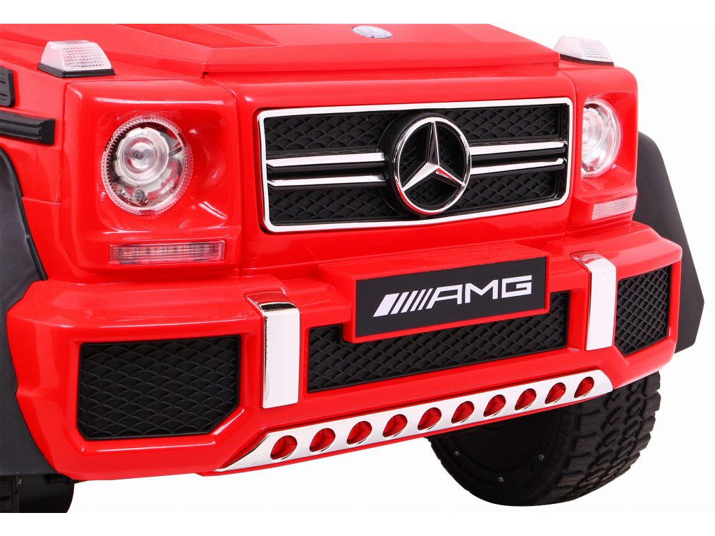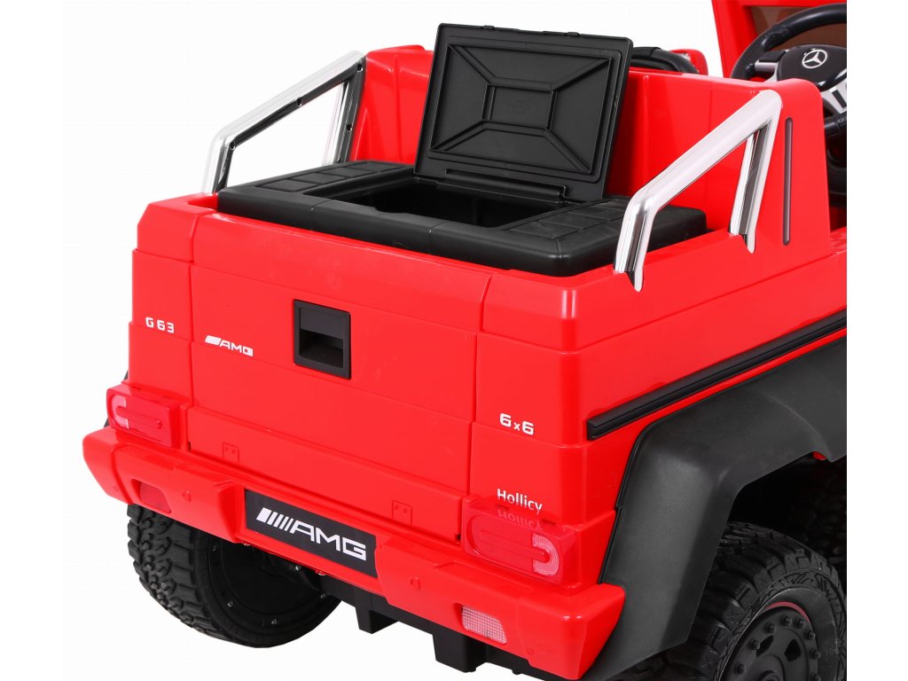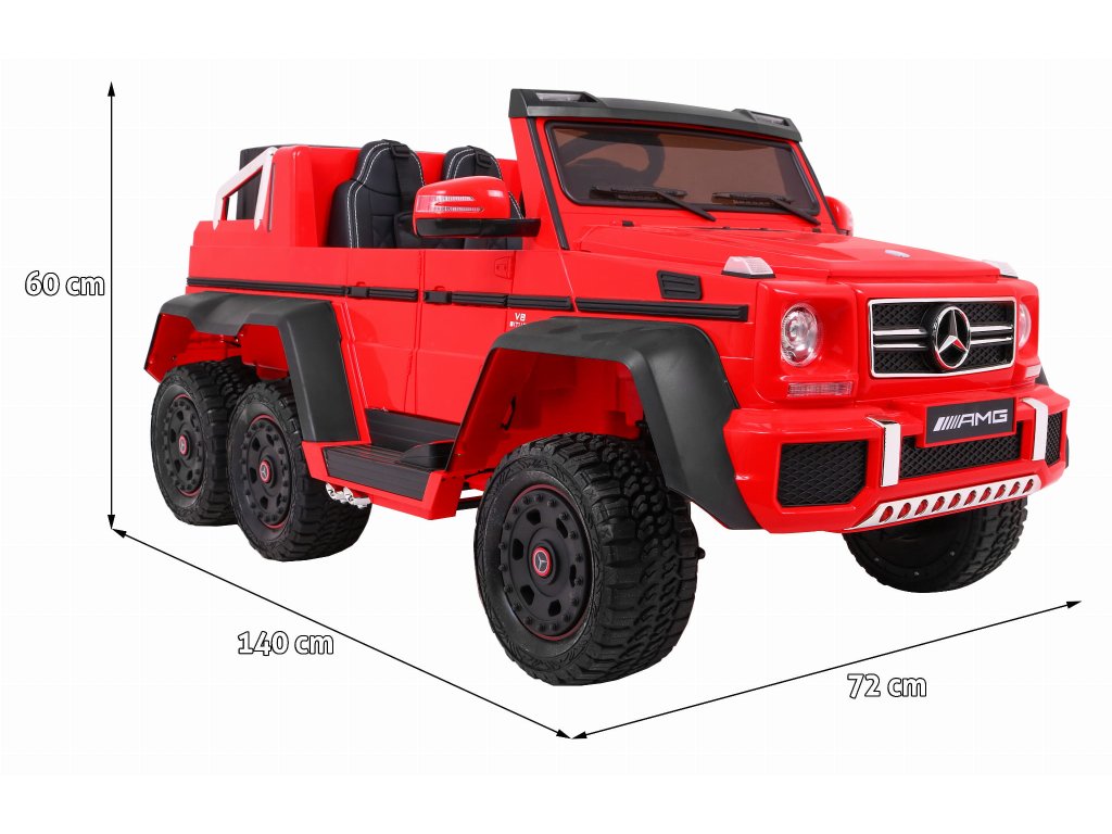 Elektrické autíčko Mercedes G63 6x6 je poháněný šesti 45 W motory, které umožňují pohodlnou jízdu na různých površích. Vůz má 2 plynové pedály, vnitřní (klasické pro dítě) a vnější umístěné na prahu vozidla, určené pro rodiče. Dospělý může během jízdy sedět v zadní části vozidla, aby mohl řídit auto pomocí rodičovského režimu. V zadní části vozidla je zavazadlový prostor, kde je umístěna přídavná uzamykatelná krabice, která se po otočení změní na sedadlo pro dospělé. Autíčko má plná gumová EVA kola a sedadlo z černé eko-kůže, které je navíc opatřena podšívkou z pěny PU. Sedadlo má 5ti bodový pás a chrániče se 4 stupňovou regulací. Součásti balení je plachta na přikrytí auta, USB flash disk, který obsahuje instruktážní video. Dále je součásti návod + montážní sada, nabíječka s diodou, která ukazuje nabíjení baterie.
