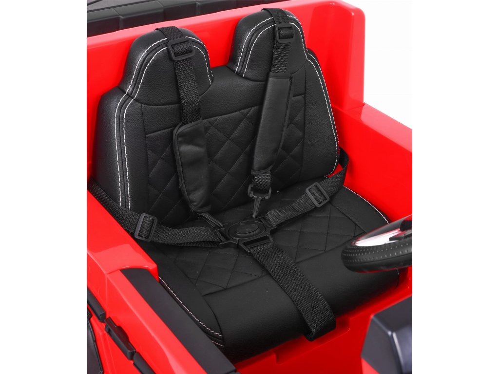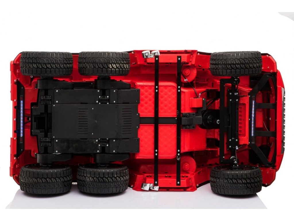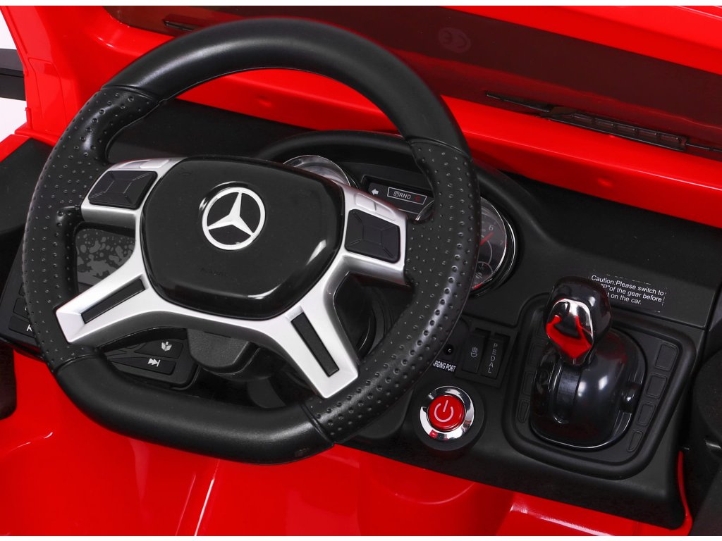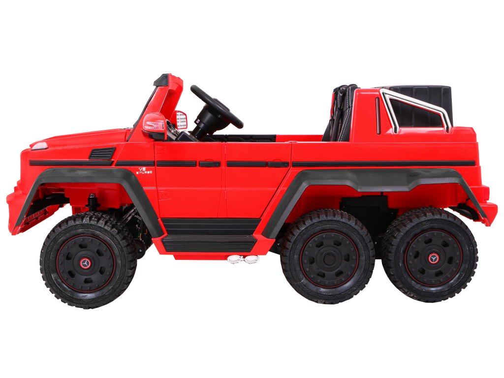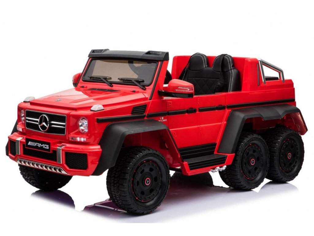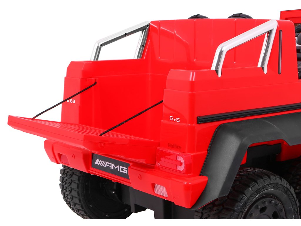 Elektrické autíčko Mercedes G63 6x6 je poháněný šesti 45 W motory, které umožňují pohodlnou jízdu na různých površích. Vůz má 2 plynové pedály, vnitřní (klasické pro dítě) a vnější umístěné na prahu vozidla, určené pro rodiče. Dospělý může během jízdy sedět v zadní části vozidla, aby mohl řídit auto pomocí rodičovského režimu. V zadní části vozidla je zavazadlový prostor, kde je umístěna přídavná uzamykatelná krabice, která se po otočení změní na sedadlo pro dospělé. Autíčko má plná gumová EVA kola a sedadlo z černé eko-kůže, které je navíc opatřena podšívkou z pěny PU. Sedadlo má 5ti bodový pás a chrániče se 4 stupňovou regulací. Součásti balení je plachta na přikrytí auta, USB flash disk, který obsahuje instruktážní video. Dále je součásti návod + montážní sada, nabíječka s diodou, která ukazuje nabíjení baterie.