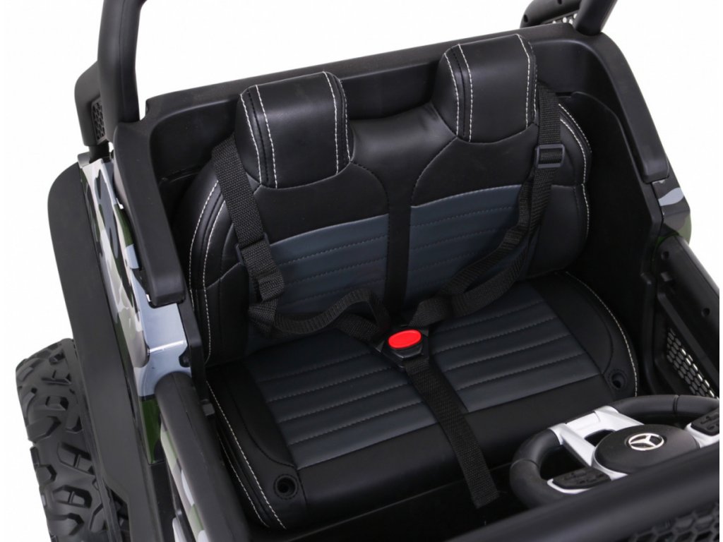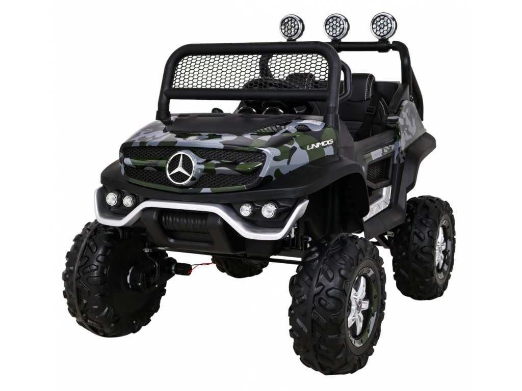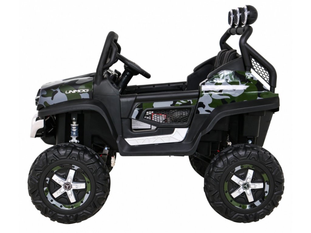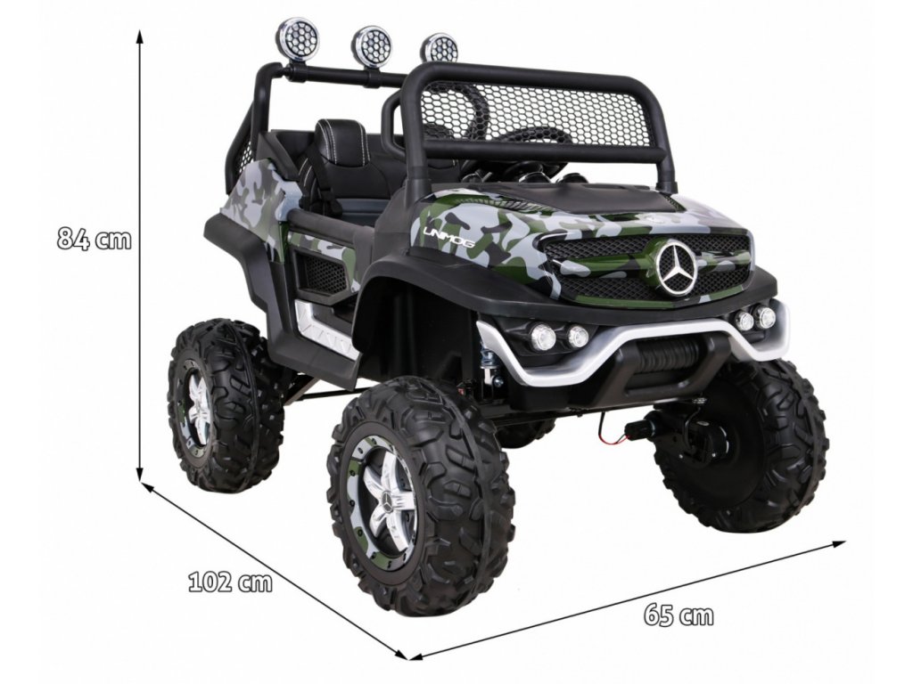 Elektrické autíčko Mercedes Unimog maskáčové je jedno z nejoblíbenějších luxusních terénních aut na trhu. Má velká kola z tvrzené pěny EVA, která jsou tichá a zvládnou různé typy terénu. Mezi bohaté vybavení patří hudební panel se vstupy MP3, AUX, USB a předem nahrané zvuky na volantu (klakson, melodie). Posadíte se do pohodlně tvarované sedačky z eko kůže o šířce 44 cm, která má bezpečnostní pásy. V zadní části vozidla se nachází zavazadlový prostor o rozměrech 46 x 10 cm.