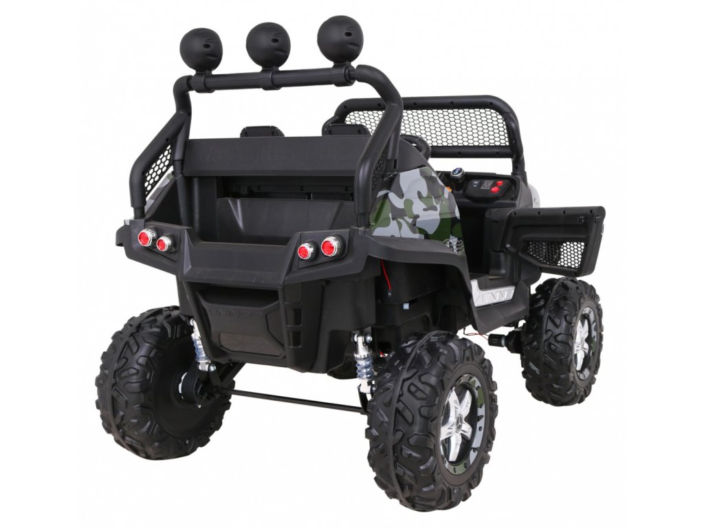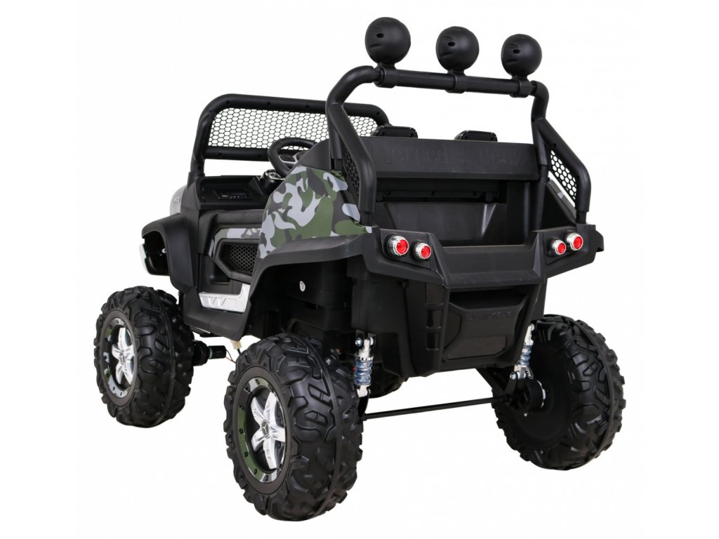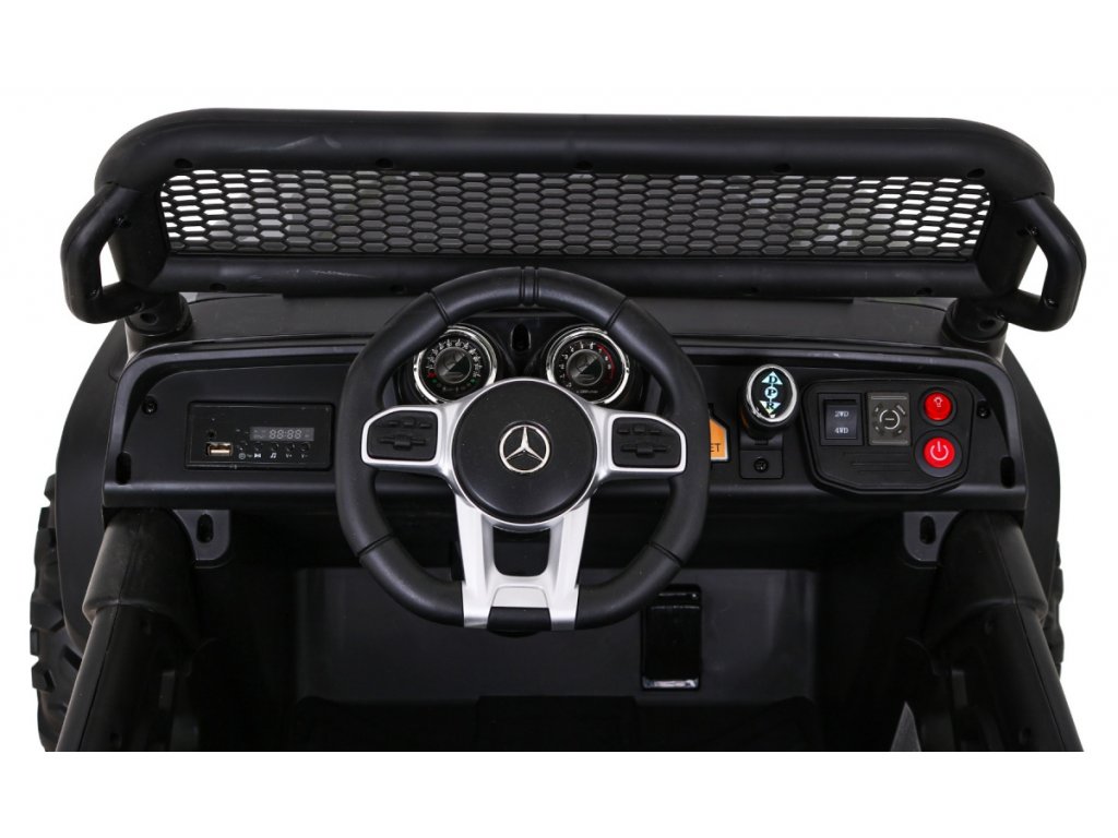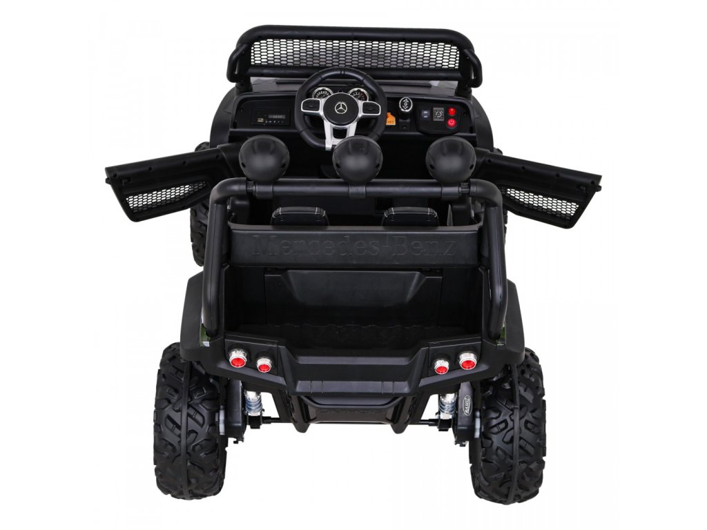 Elektrické autíčko Mercedes Unimog maskáčové je jedno z nejoblíbenějších luxusních terénních aut na trhu. Má velká kola z tvrzené pěny EVA, která jsou tichá a zvládnou různé typy terénu. Mezi bohaté vybavení patří hudební panel se vstupy MP3, AUX, USB a předem nahrané zvuky na volantu (klakson, melodie). Posadíte se do pohodlně tvarované sedačky z eko kůže o šířce 44 cm, která má bezpečnostní pásy. V zadní části vozidla se nachází zavazadlový prostor o rozměrech 46 x 10 cm.