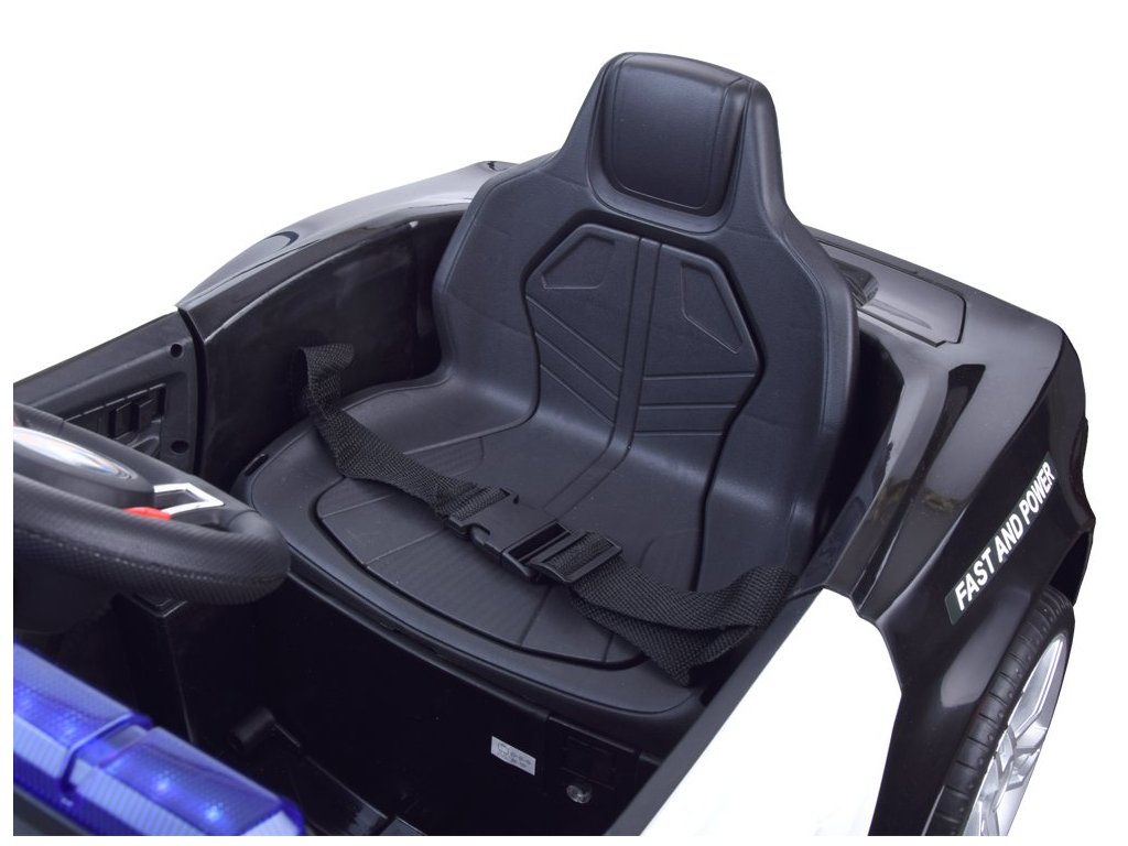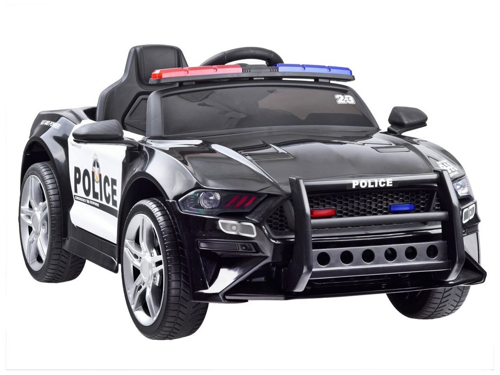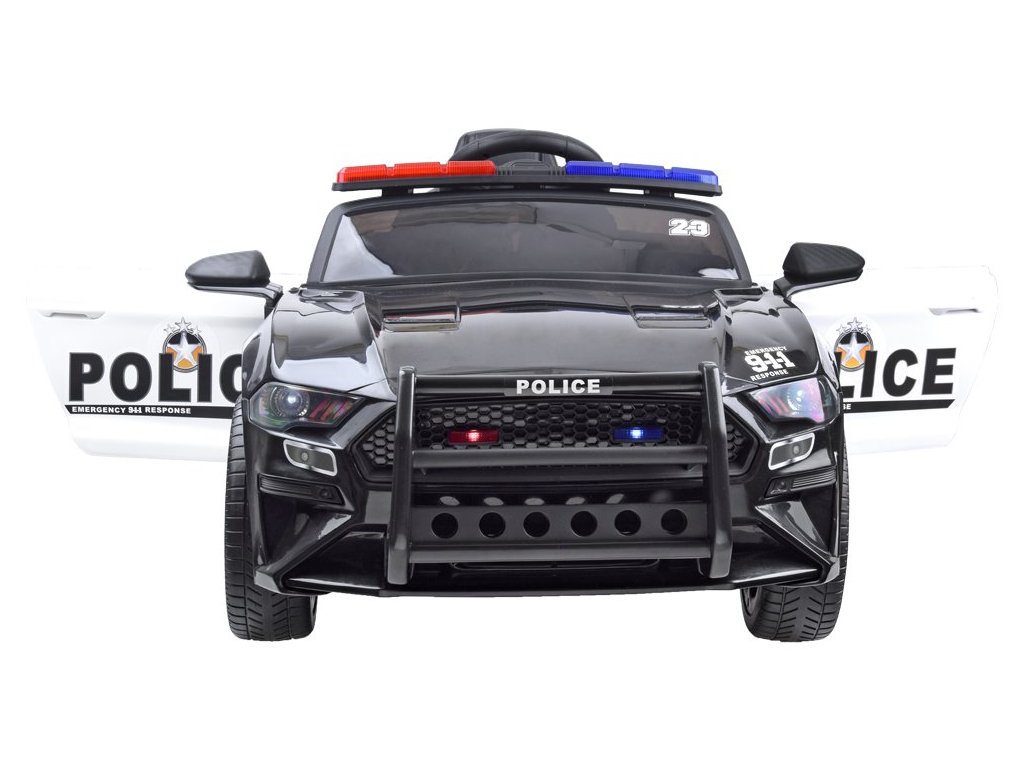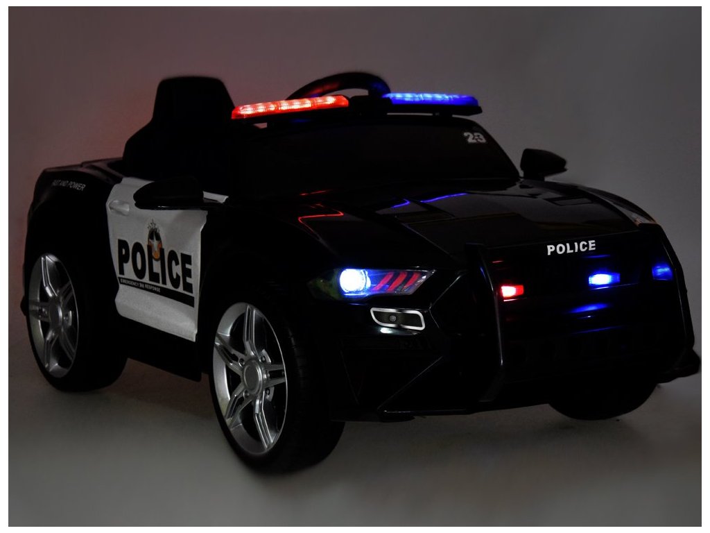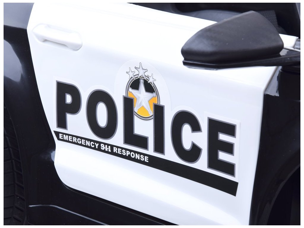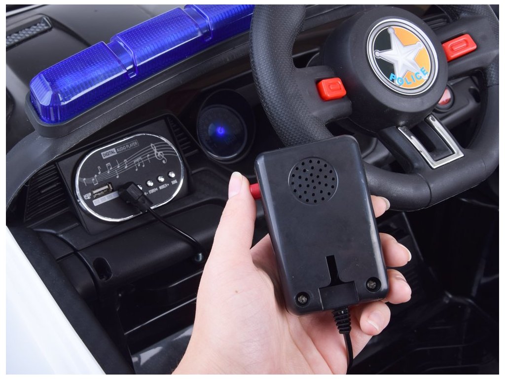 Elektrické autíčko se zvukovými a světelnými efekty splní požadavky každé malé policejní hlídky. Auto je vybavené potřebnými atributy, jako je vysílačka, vhodné označení a blikající červeno-modré maják se zvukovými efekty. V každé policejní jednotce bude užitečné dálkově ovládané policejní auto malého policisty. Žádná akce a pronásledování banditů se bez něj neobejde. Policejní vůz má dva motory 12 V, gelovou baterií 12V 4,5Ah a dálkové ovládání 2,4 Ghz pro rodiče. Policejní vůz může být ovládán dálkovým ovládáním 2,4 Ghz pro rodiče nebo samotným mladým policistou, který zná pravidla řízení. Autíčko má přepínač jízdy vpřed a vzad. Rodič používající dálkové ovládání však může mít vždy kontrolu nad rychlostí vozidla, má kontrolu nad brzděním vozidla, když se dítě pohybuje na nesprávné místo. Krásné policejní autíčko je vybaveno potřebným policejním příslušenstvím, tj. vysílačka, která se napojí na hudební panel a dítě může začít mluvit, dále červeno-modrý maják, kdy se světla a zvuk aktivují tlačítkem na panelu. Auto má otevírací dveře se zámkem, otevírací kufr v zadní části vozidla, ve které může dítě skrýt potřebné příslušenství. Auto je vybaveno měkkými EVA koly, díky kterým bude jízda příjemná na všech površích. Policejní vůz má pomalý start, je to velká výhoda, protože se auto pohybuje hladce a bez škubnutí, takže nehrozí žádné nebezpečí, že by vozidlo hodně škubalo a vylekalo dítě. Jakmile dítě sundá nohu z plynového pedálu, aktivuje se automatická brzda. Auto má hudební panel, ke kterému můžete připojit vlastní MP3 zařízení, telefon atd. Nebo můžete použít nahrané skladby. Na palubní desce jsou přepínače zvukových a světelných efektů. Použitím megafonu bude mladý policista schopen ohlásit svůj příjezd, varovat před hrozbou, zavolat jednotku, aby se připravili atd. Volant má potřebné tlačítko houkačky i spínač melodie.