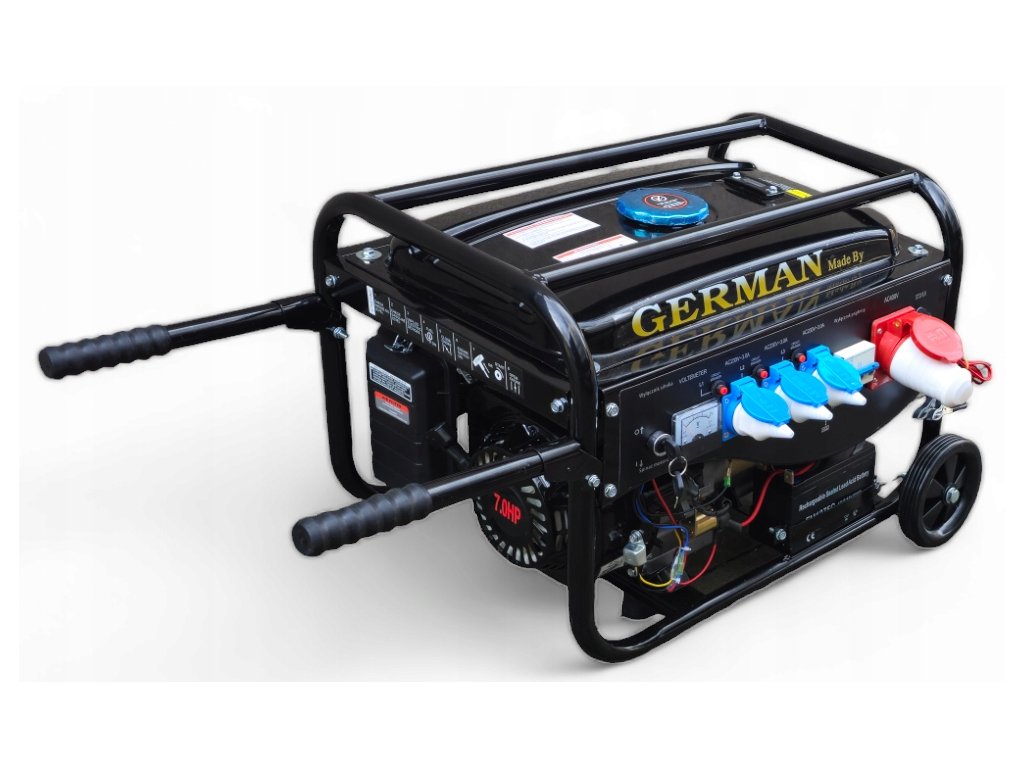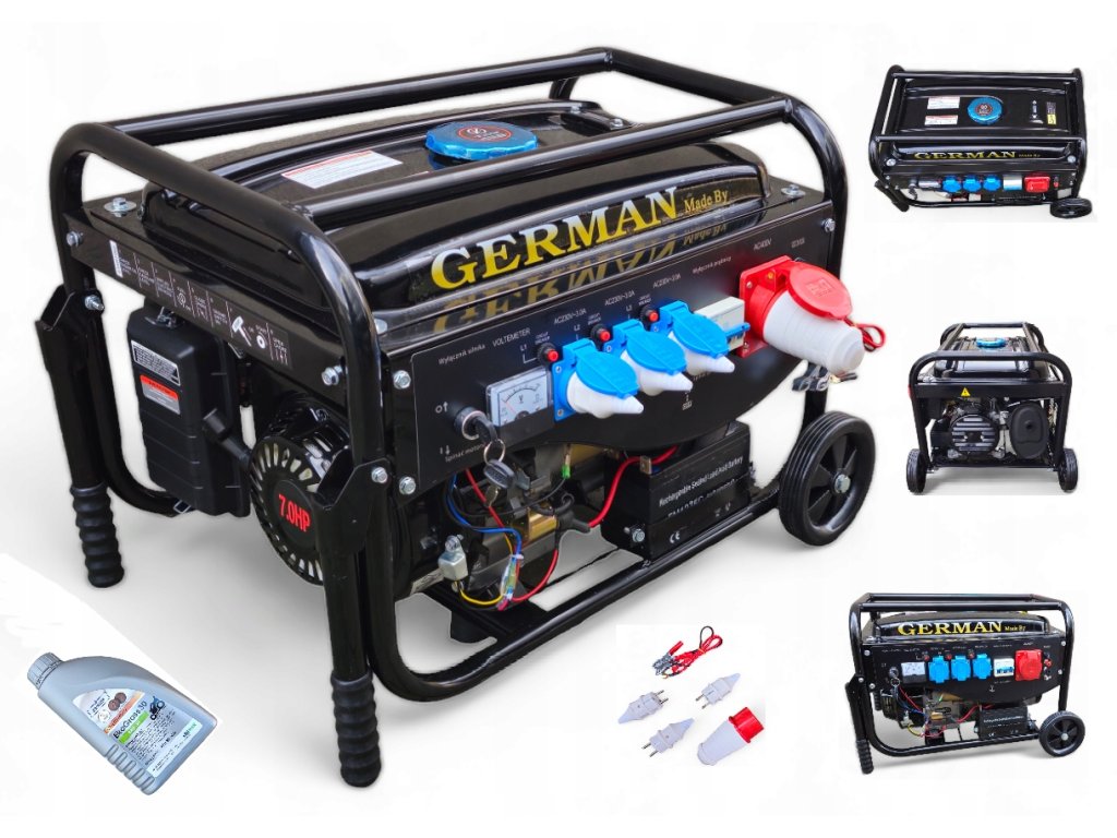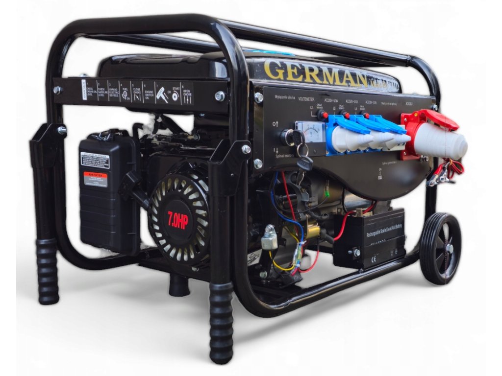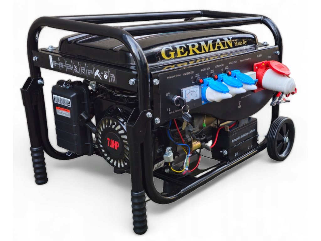 Tento agregát je plně kompatibilní s benzínem E10. Agregát obsahuje ruční + elektrický start. Originální 4-taktní elektrocentrála GERMAN s japonskou konstrukcí motoru OHV 7HP. Napájení 12V / 3x230V / 1x400 V. Nejnovější model 2025 s přepínačem 230/400V a novým typem 15L palivové nádrže. Součást balení jsou kola + madla + olej + elektrický startér + akumulátor.