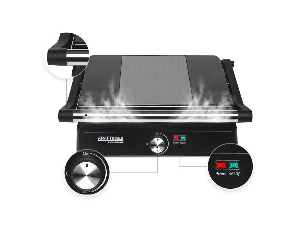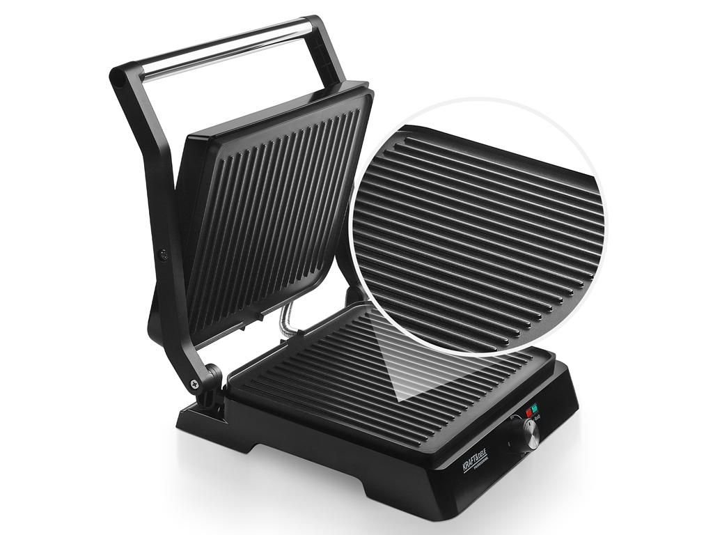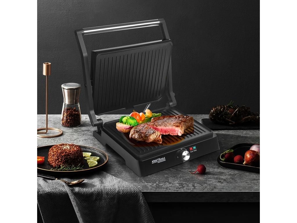 Model KD4103 wyróżnia się funkcjonalną konstrukcją oraz możliwością dopasowania płyt grzewczych do wysokości opiekanych produktów, co ułatwia równomierne opiekanie zarówno cienkich tostów, jak i grubszych kawałków mięsa. Dodatkową zaletą jest możliwość rozłożenia grilla – klasycznie w pozycji złożonej, w ustawieniu 90° oraz na płasko do 180°, co dwukrotnie zwiększa powierzchnię grillowania i daje więcej swobody podczas przygotowywania większej ilości jedzenia.