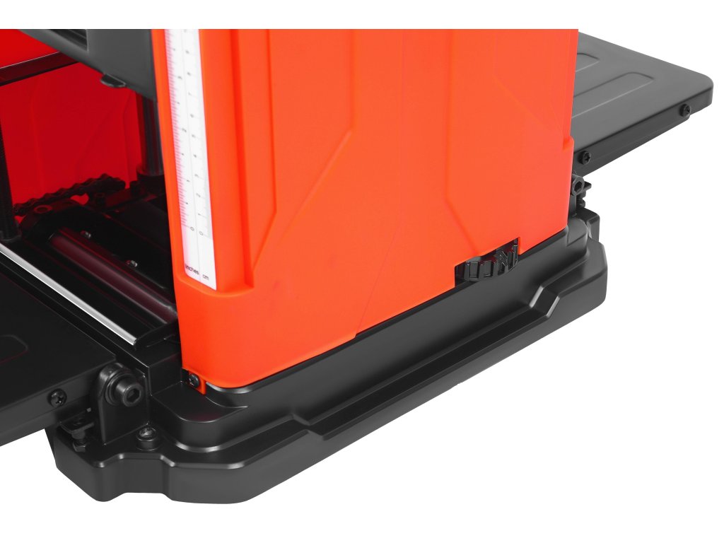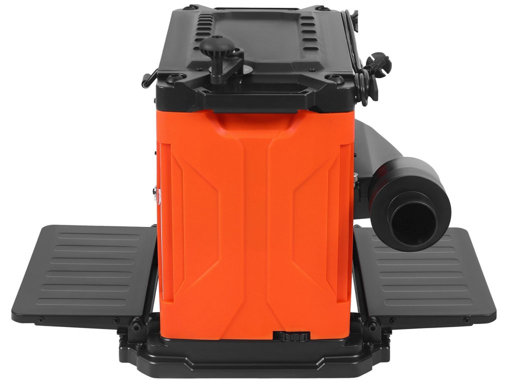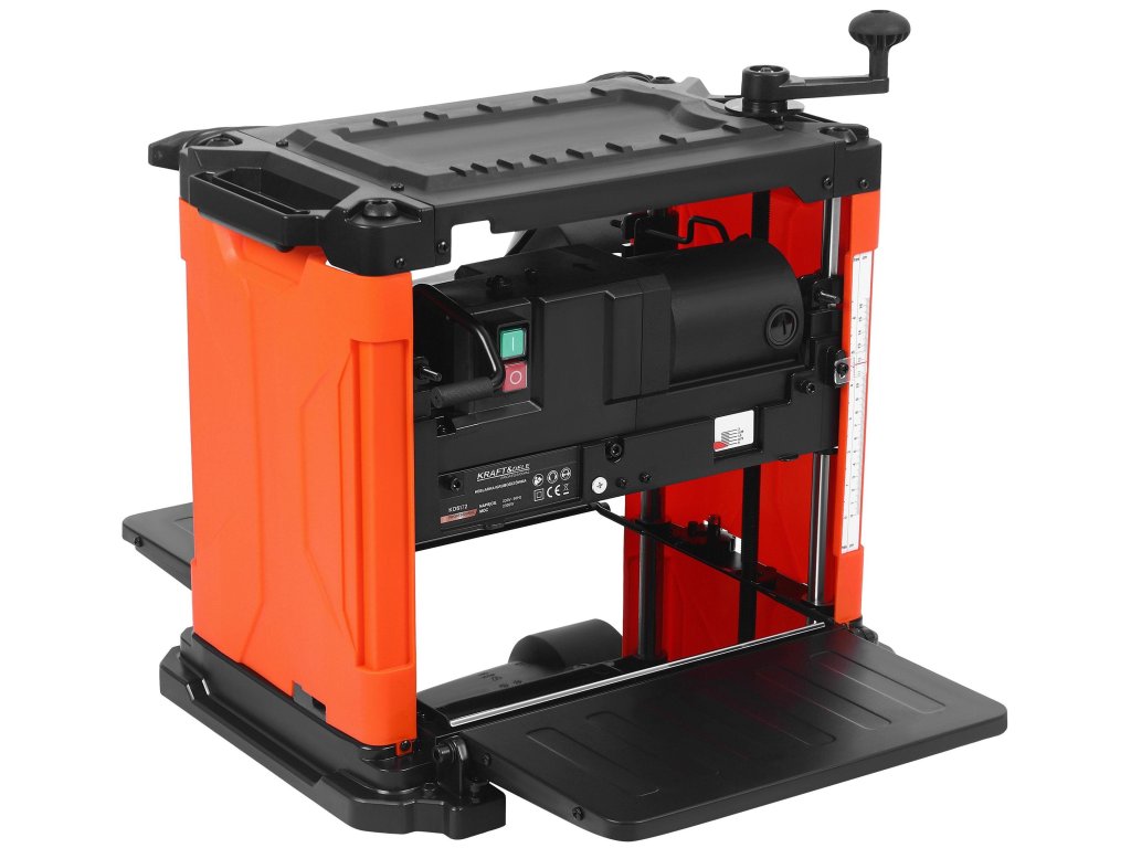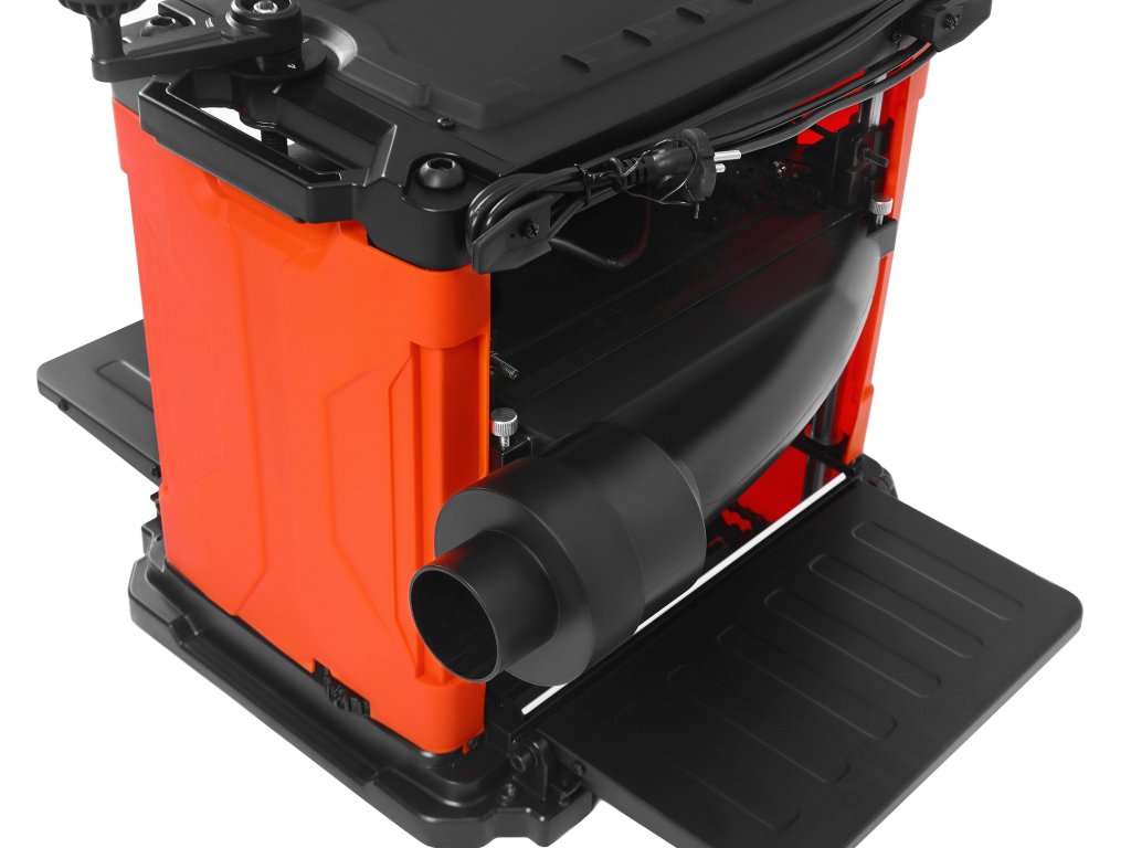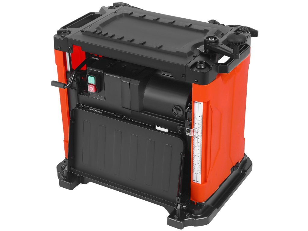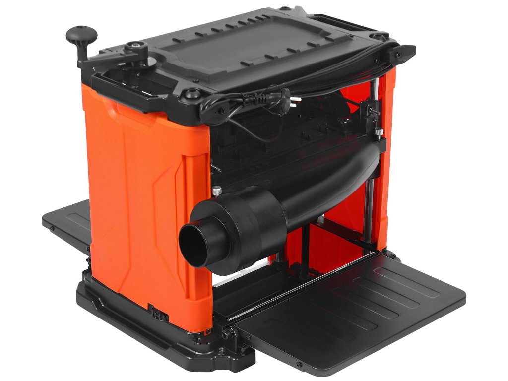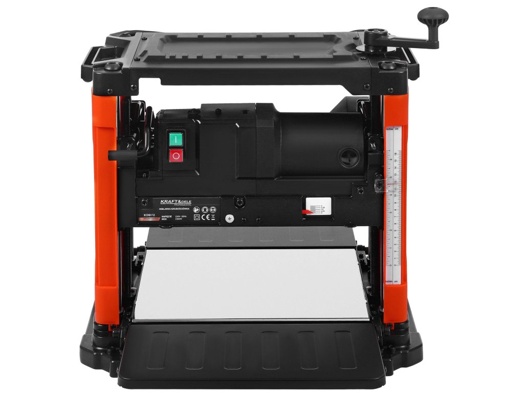 Model wyposażono w płynną regulację korbą, czytelne miary wysokości i głębokości strugania oraz możliwość współpracy z odciągiem pyłu. Ułatwia to utrzymanie porządku oraz pozwala na precyzyjne ustawienie parametrów pod wymagany materiał. Boczne uchwyty oraz kompaktowa konstrukcja zwiększają wygodę użytkowania.