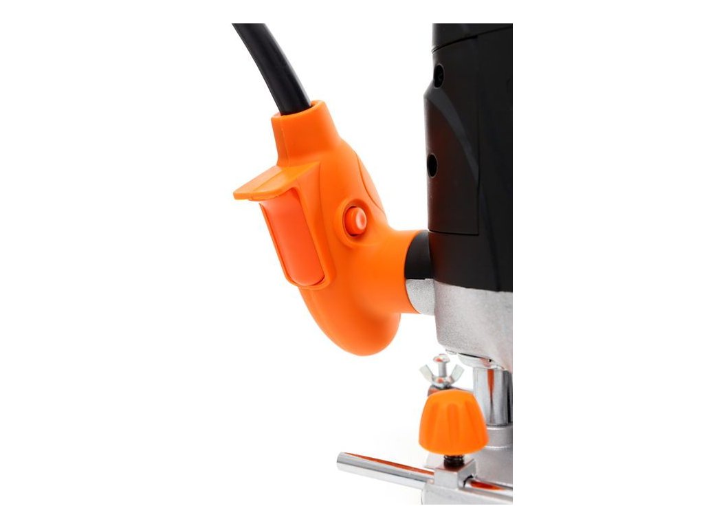 - Blokování spínače - ke spuštění frézky jednoduše stiskněte spoušť umístěnou na rukojeti. Další tlačítko uzamčení umožňuje uvolnit spouštěč a nepřetržitý provoz zařízení.