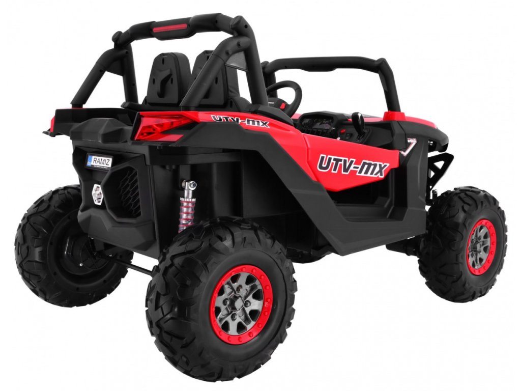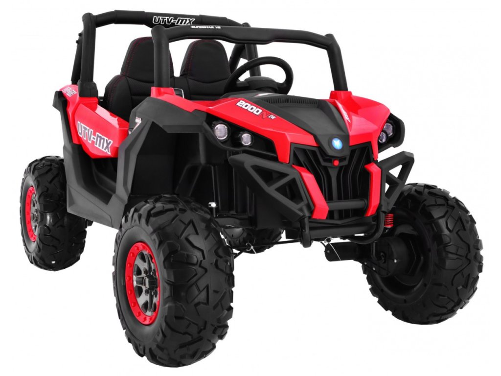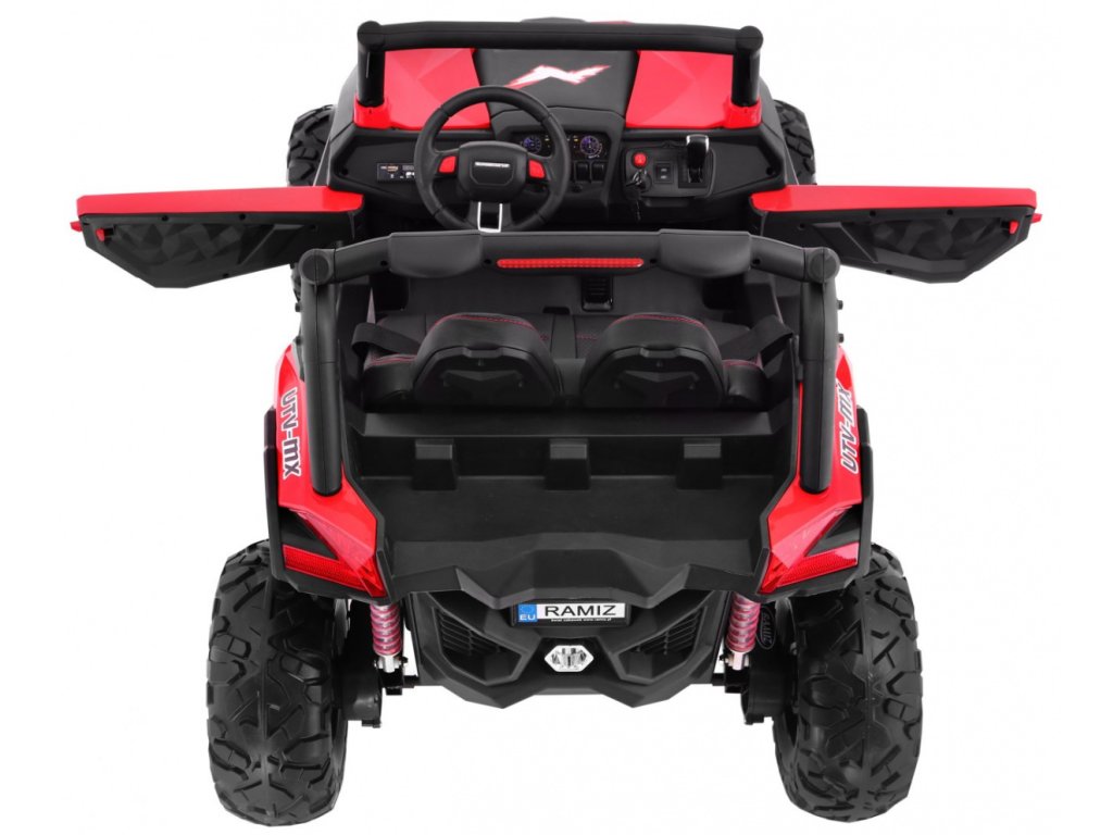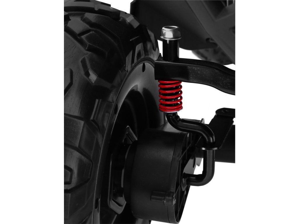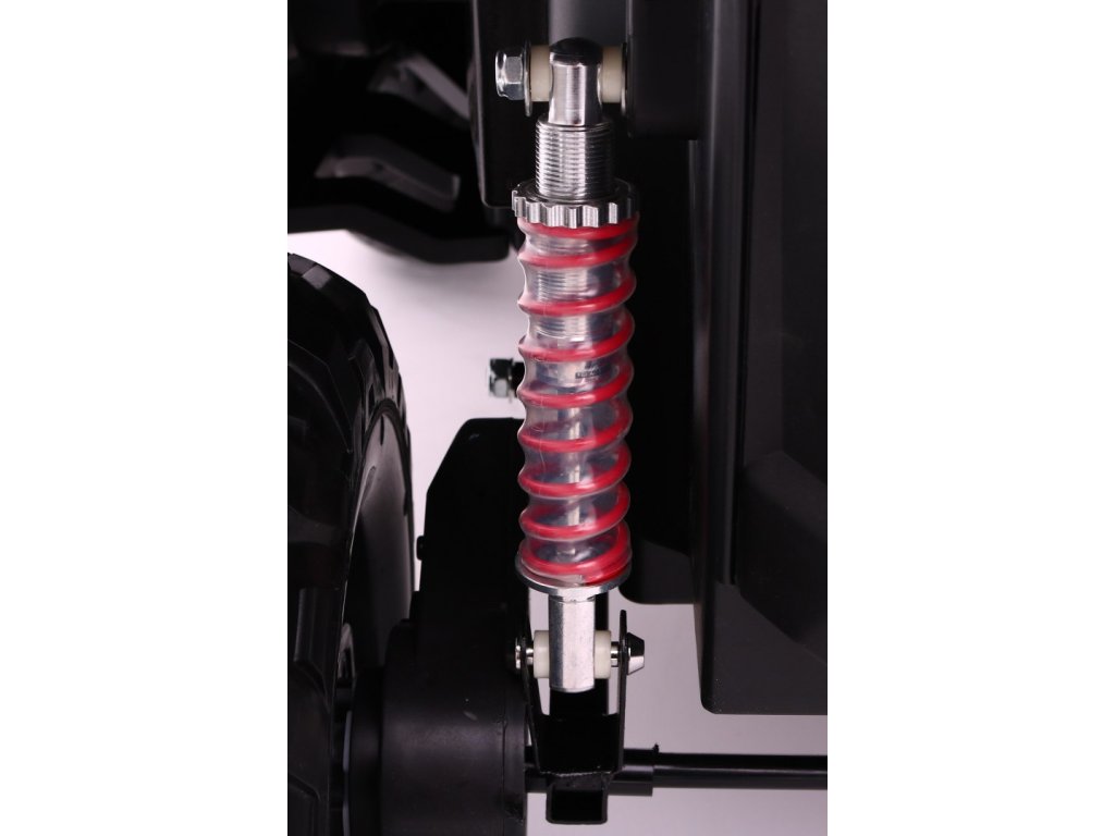 Obrovská bugina 4x4 má nádherný vzhled terénního vozidla, použity kvalitní materiály a zpracování. Naše nejprodávanější terénní vozítko. Má otevírací dveře, jezdí vpřed/vzad na nožní pedál, nebo se ovládá dálkovým ovladačem se 3 rychlostmi vpřed, a jednou rychlostí vzad, pravá/levá, s přednostní jízdou nad pedálem tzn. dítě můžete ovladačem zastavit. Jízda vpřed/vzad se ovládá řadící páčkou na přístrojové desce. Bugína má přední a zadní světla LED. Start motoru, zvukové efekty, klakson, písničky jsou ovládané na volantu, přehrávačem FM, Mp3, TF s krásným zvukem volíte vlastní hudbu a hlasitost. Zadní náprava je odpružená. Veliká EVA kola (jako gumová) zajišťují tichou a příjemnou jízdu. Při nesešlápnutém pedálu tah motoru nahrazuje brzdu nebo brzdíte ovladačem. Auto má náhon na všechny 4 kola, tím je vhodné i pro jízdu v terénu. Pro větší bezpečnost dětí jsou na luxusní čalouněné sedačce 2 nastavitelné bezpečnostní pásy a 2 ochranné rámy. Oproti konkurenci má navíc naše bugina páčku změny rychlostí ,,1-2-3 / zpátečka" na palubní desce, startování klíčem, přední a zadní odpružení. Naši kluci také testovali tuto bugínu.
