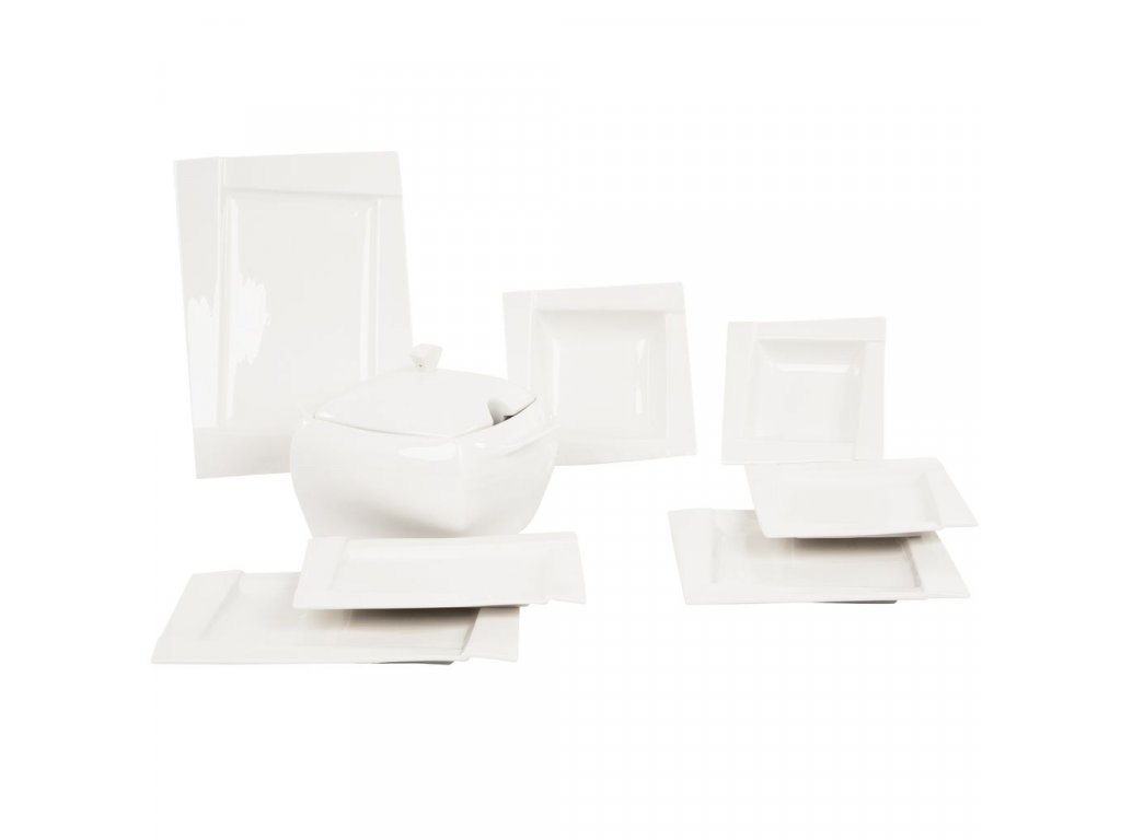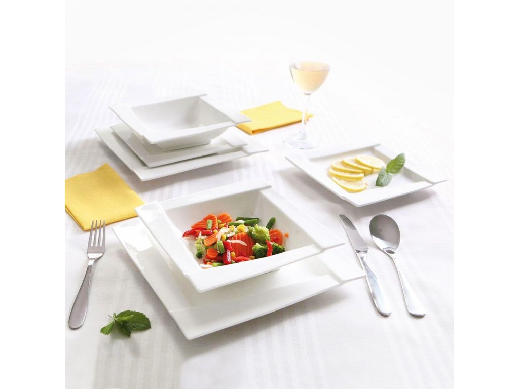 Kubiko - mramorově bílý porcelán s výrazným čtvercovým tvarem talířů. Speciální technologie výroby a dodatečný povlak činí hrany více zesílené a vyztužené, díky tomu je porcelán výjimečně odolný. Porcelán je ideální jak pro domácí použití tak pro profesionální gastronomii. Skvělý tip na svatební dar.