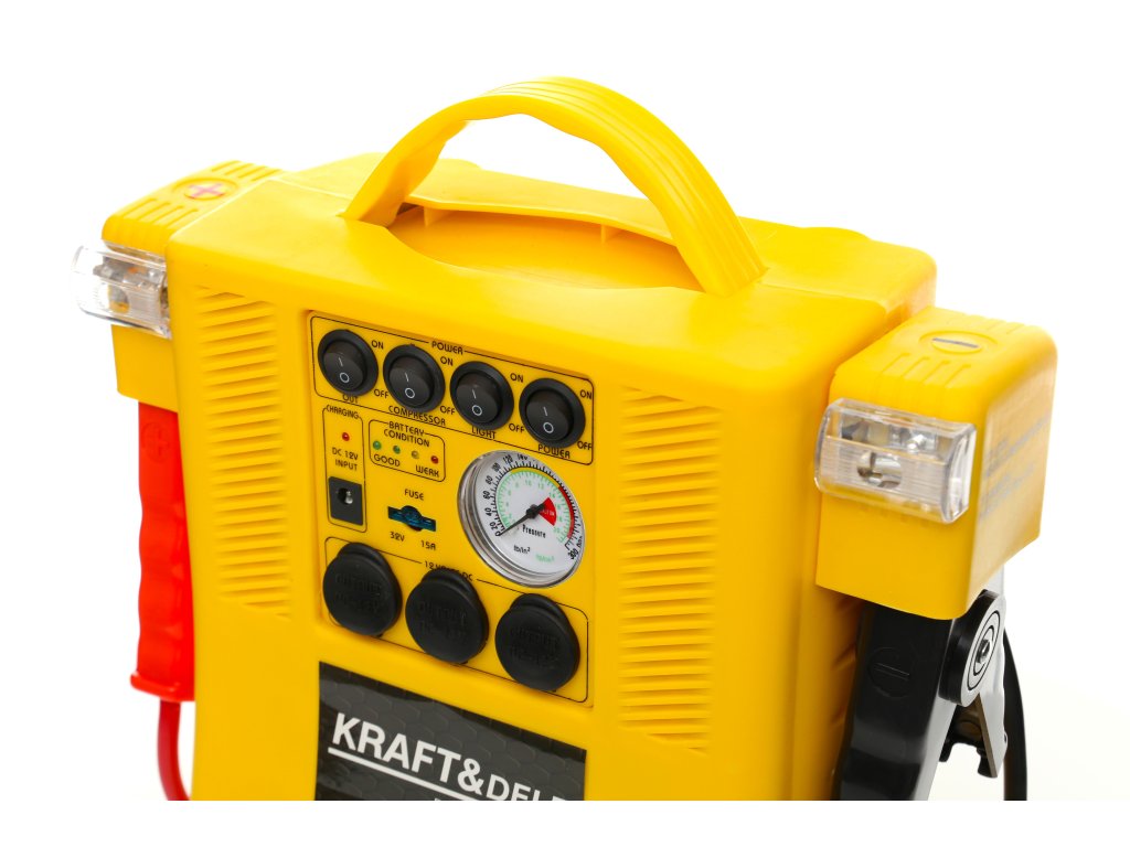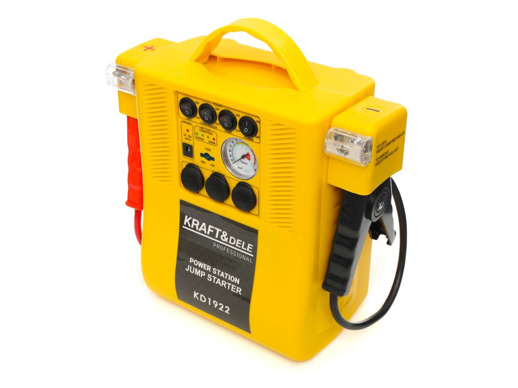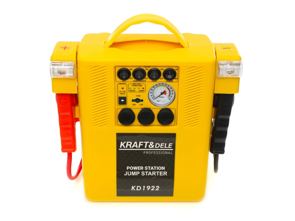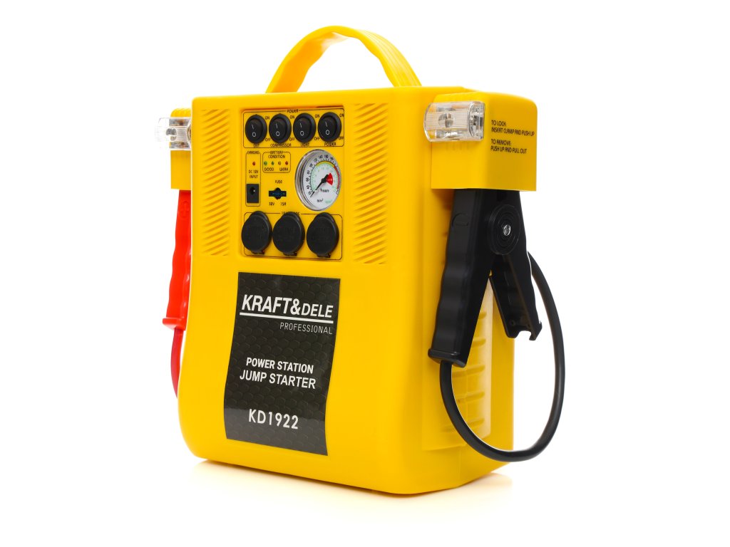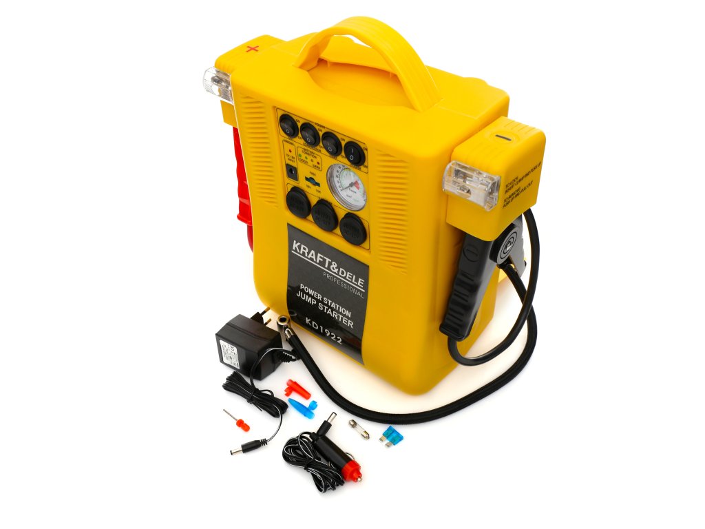 Multifunkční zařízení, které je užitečné v každé dílně i automobilu. Díky němu nastartujete auto, načtete telefon, osvítíte cestu a nafoukáte pneumatiky. Disponuje vestavěnými startovacími kabely o délce 50 cm a kompresorovým hadicem o délce 55 cm. Dále je vybaveno vestavěným testerem akumulátoru.