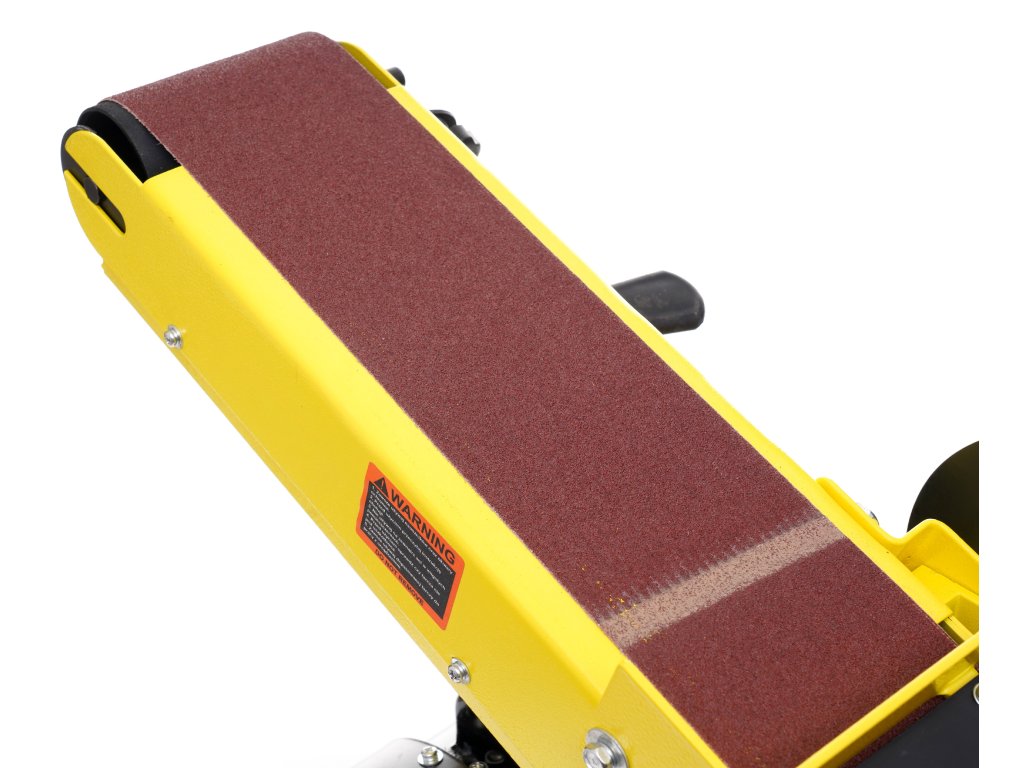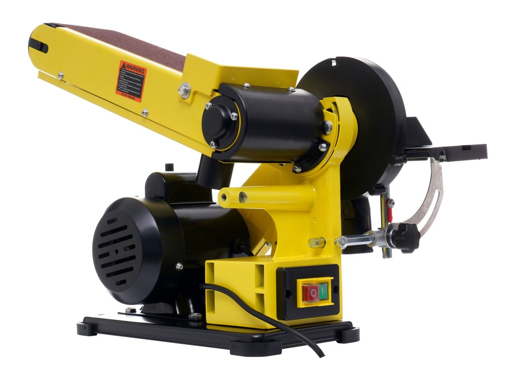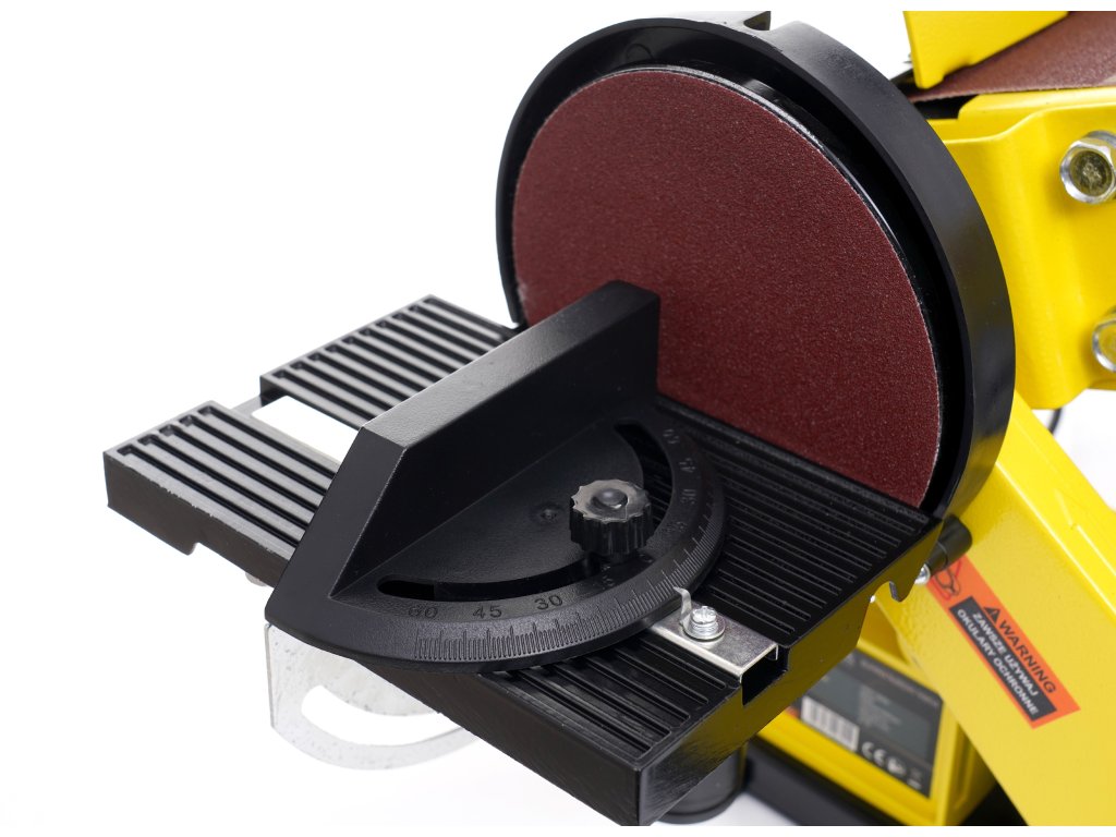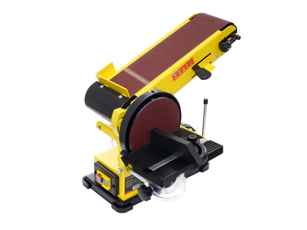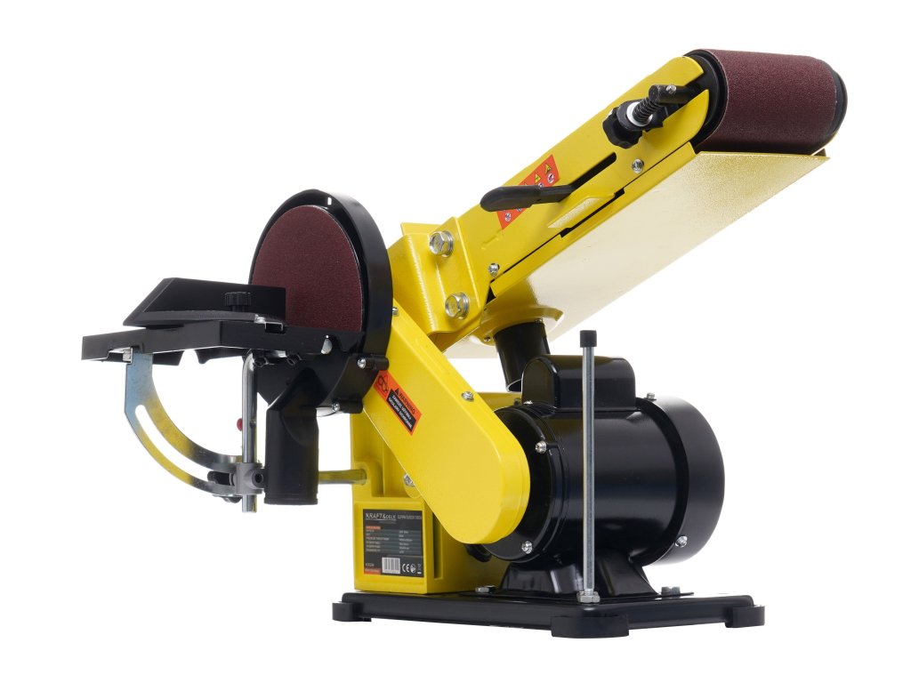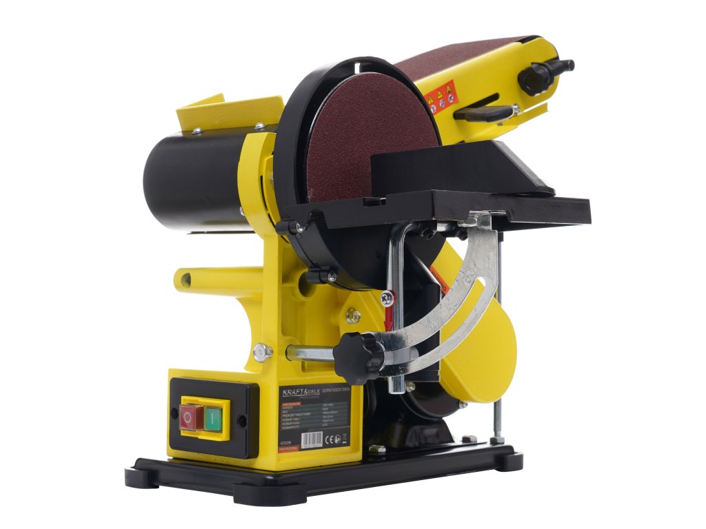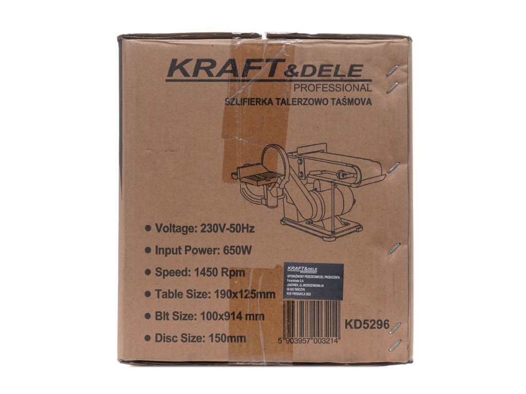 Kotoučová a pásová bruska Kraft&Dele s označením KD5296, používaná zejména pro opracování dřevěných a kovových prvků, ale i syntetických povrchů. Profesionální přístroj s výkonem 650W. Toto zařízení bylo vyrobeno v souladu se současným stavem techniky a uznávanými technickými bezpečnostními požadavky. Vysoká kvalita zpracování zajišťuje dlouhou životnost, přesnost ovládání a snadné ovládání. Modul kotoučové brusky má naklápěcí desku stolu, umožňující práci kolmo na kotouč (v rozsahu 0-45 stupňů), pásový stůl může pracovat horizontálně i vertikálně (v rozsahu 0-90 stupňů). Stroj umožňuje brousit dřevěné prvky podélně, příčně i diagonálně. Deska stolu je vyrobena z litiny, díky čemuž je konstrukce stabilní a nedeformuje se pod tlakem. Povrch stolu je frézován pro zvýšení přilnavosti zpracovávaného materiálu.
