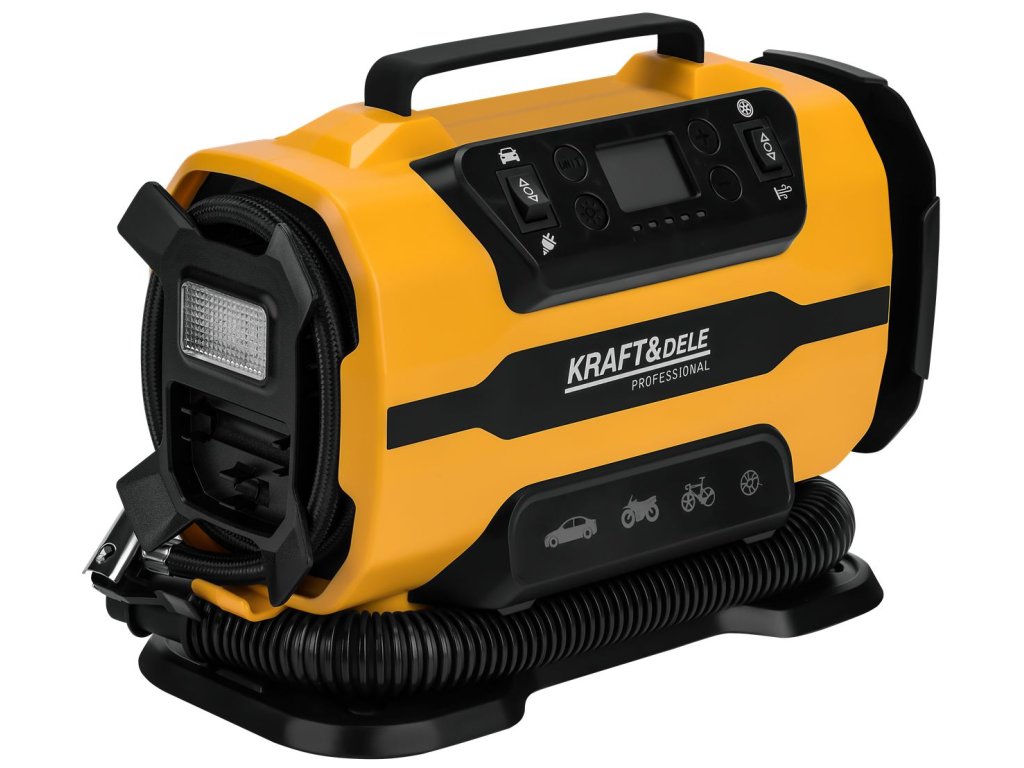 Integrovaná LED svítilna je neocenitelným pomocníkem při práci za snížené viditelnosti nebo v noci, zajišťující bezpečnost a komfort. Jednoduchý přepínač napájení umožňuje okamžitou volbu zdroje energie, což zaručuje plynulý chod. Kompresor Kraft&Dele KD3441 je spolehlivý i v extrémních podmínkách, s pracovním rozsahem teplot od -20 do +50°C. S výkonem 140W a sadou praktických koncovek je tento autokompresor skutečně univerzálním řešením pro každou domácnost a každého motoristu.