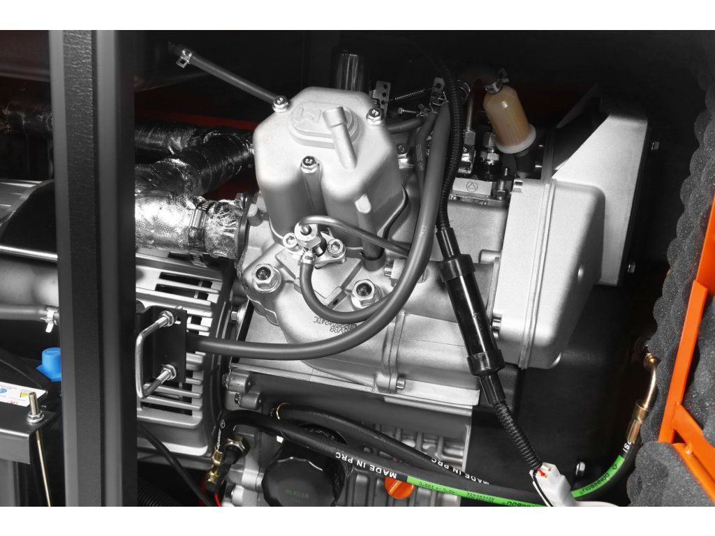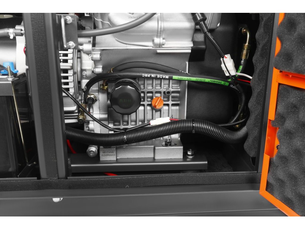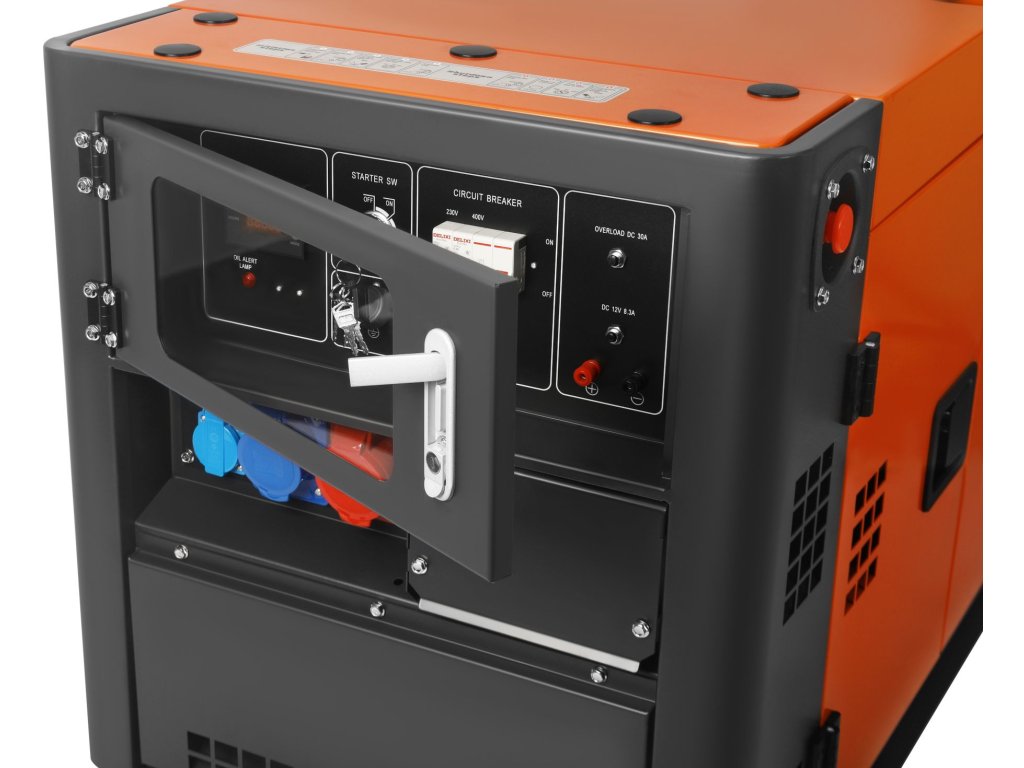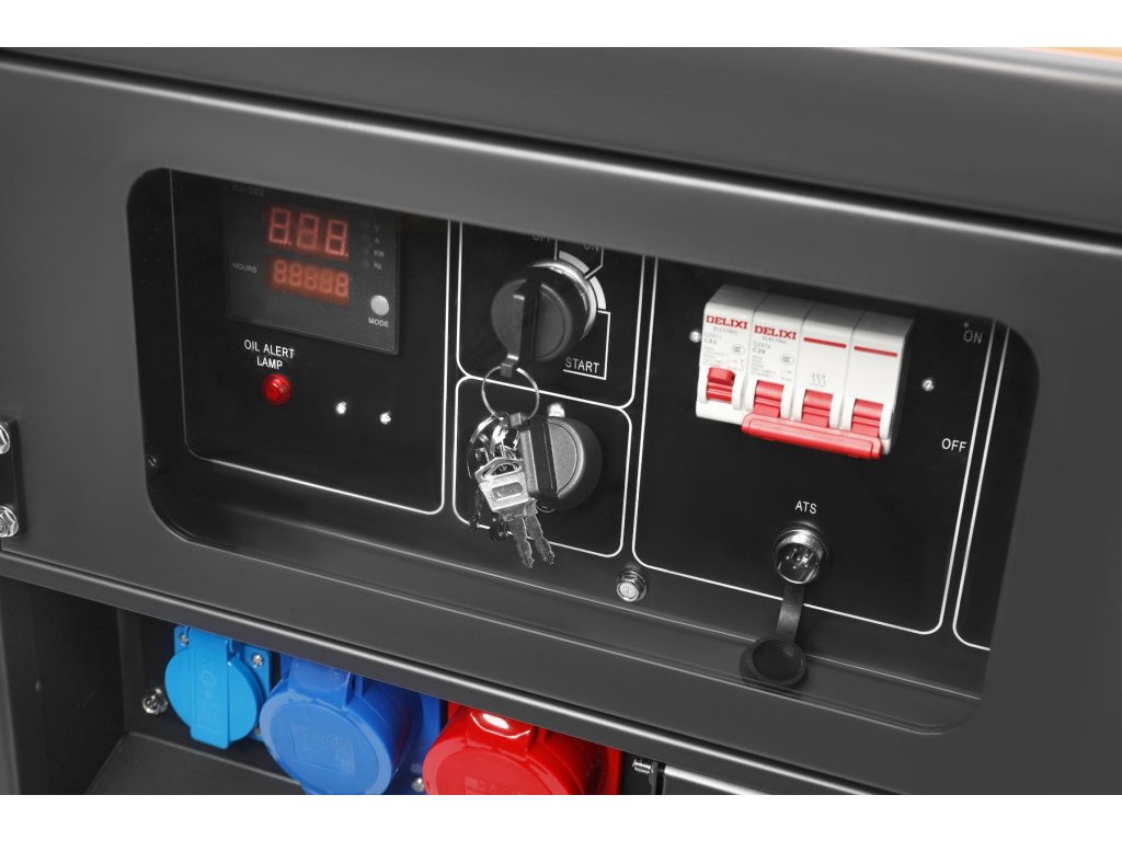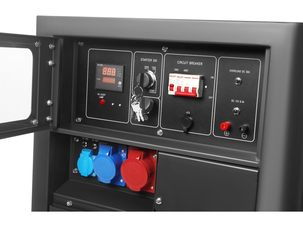 Model KD3240 nabízí výjimečnou flexibilitu díky třem výstupním konektorům: standardní 230V, výkonný 230V 32A a třífázový 400V, což umožňuje připojení široké škály zařízení. Integrovaný voltmetr a počítadlo motohodin poskytují okamžitý přehled o provozních parametrech a usnadňují plánování údržby. Bezpečnost instalace je zajištěna fázovými pojistkami. Agregát je navíc vybaven konektorem pro systém ATS, zjednodušující automatické přepínání napájení. S kombinací ručního a elektrického startu je spuštění vždy pohodlné.